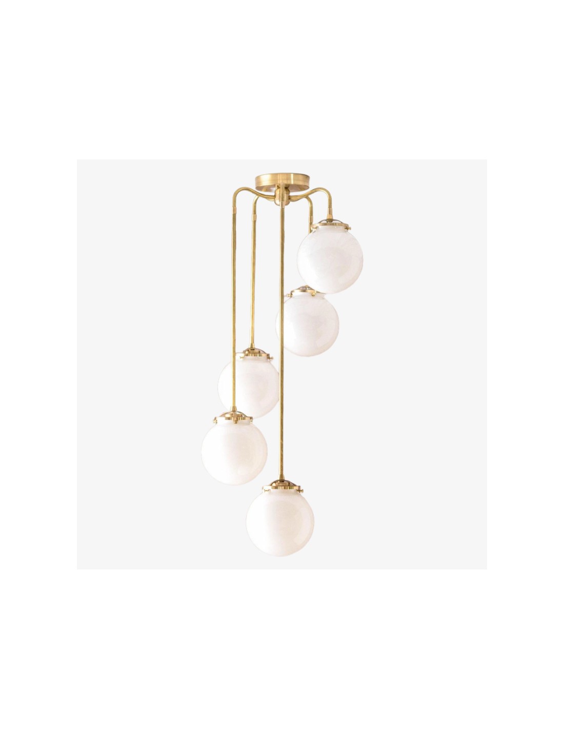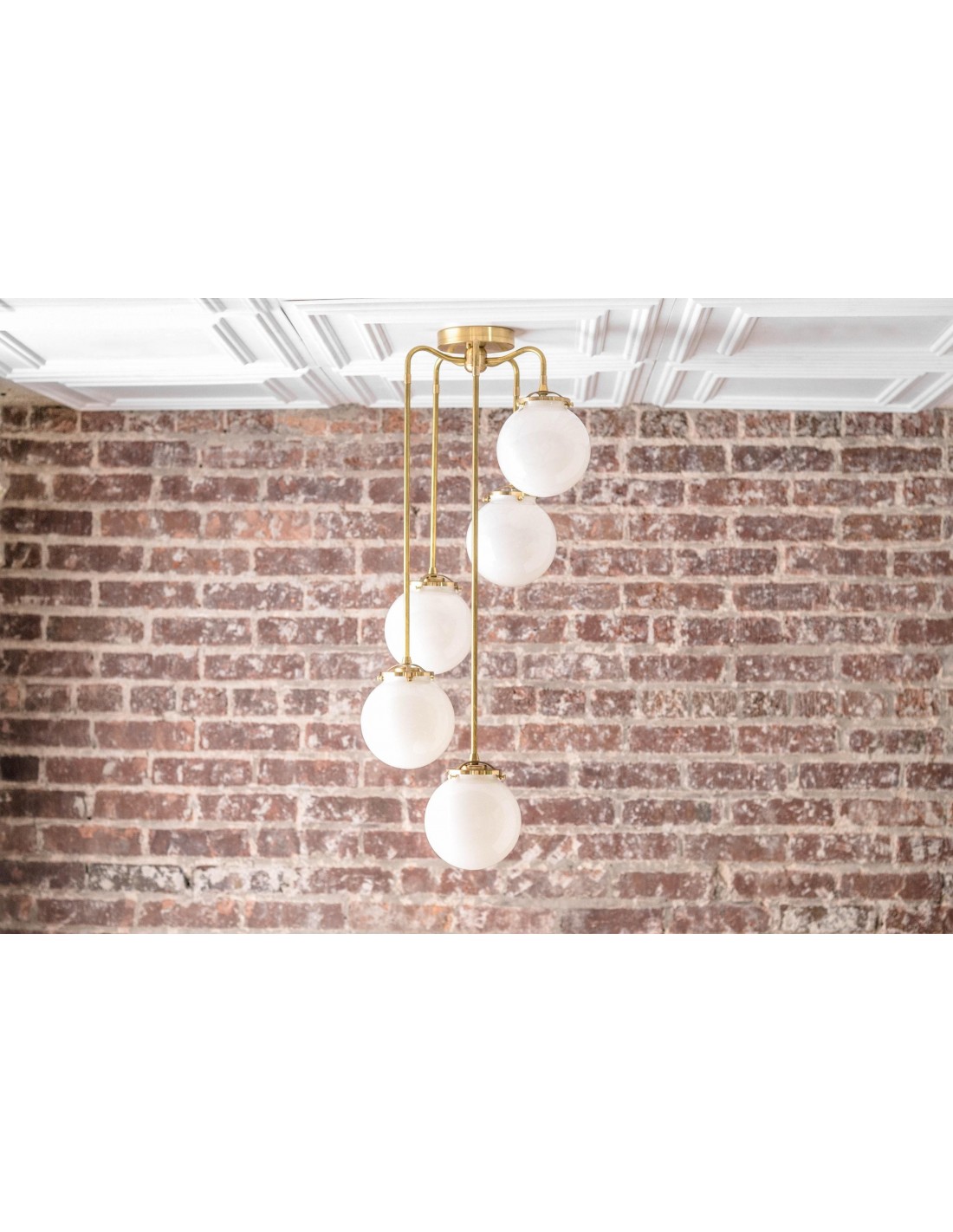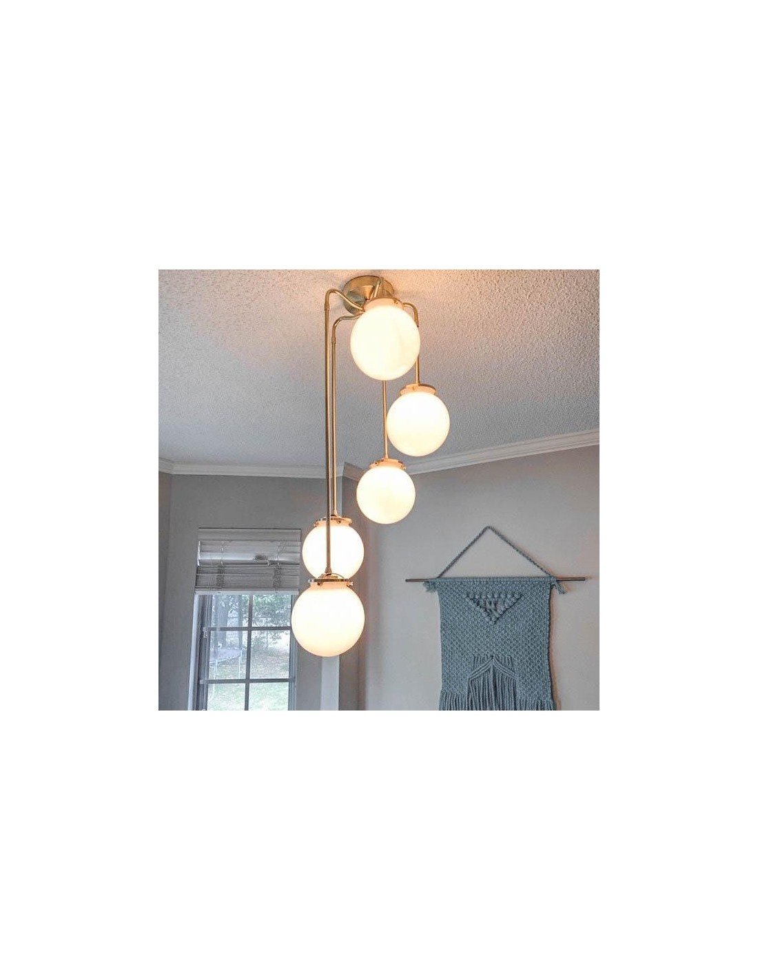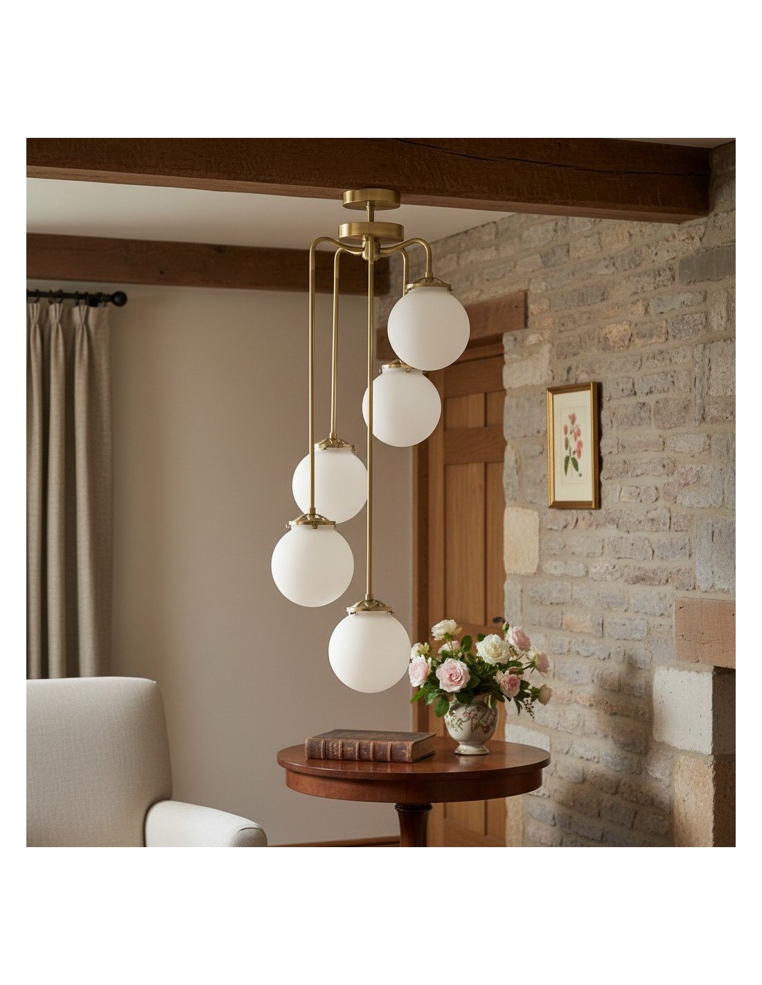 Maak een verbluffende indruk met onze kroonluchter met vijf bollen. Met opaalglazen bollen die aan warme messing armen van verschillende lengtes hangen, werpt dit stuk een prachtig zacht, diffuus licht. Perfect boven een eettafel of in een hal, combineert hij vintage charme met een moderne touch en creëert zo een blikvanger van tijdloze elegantie.