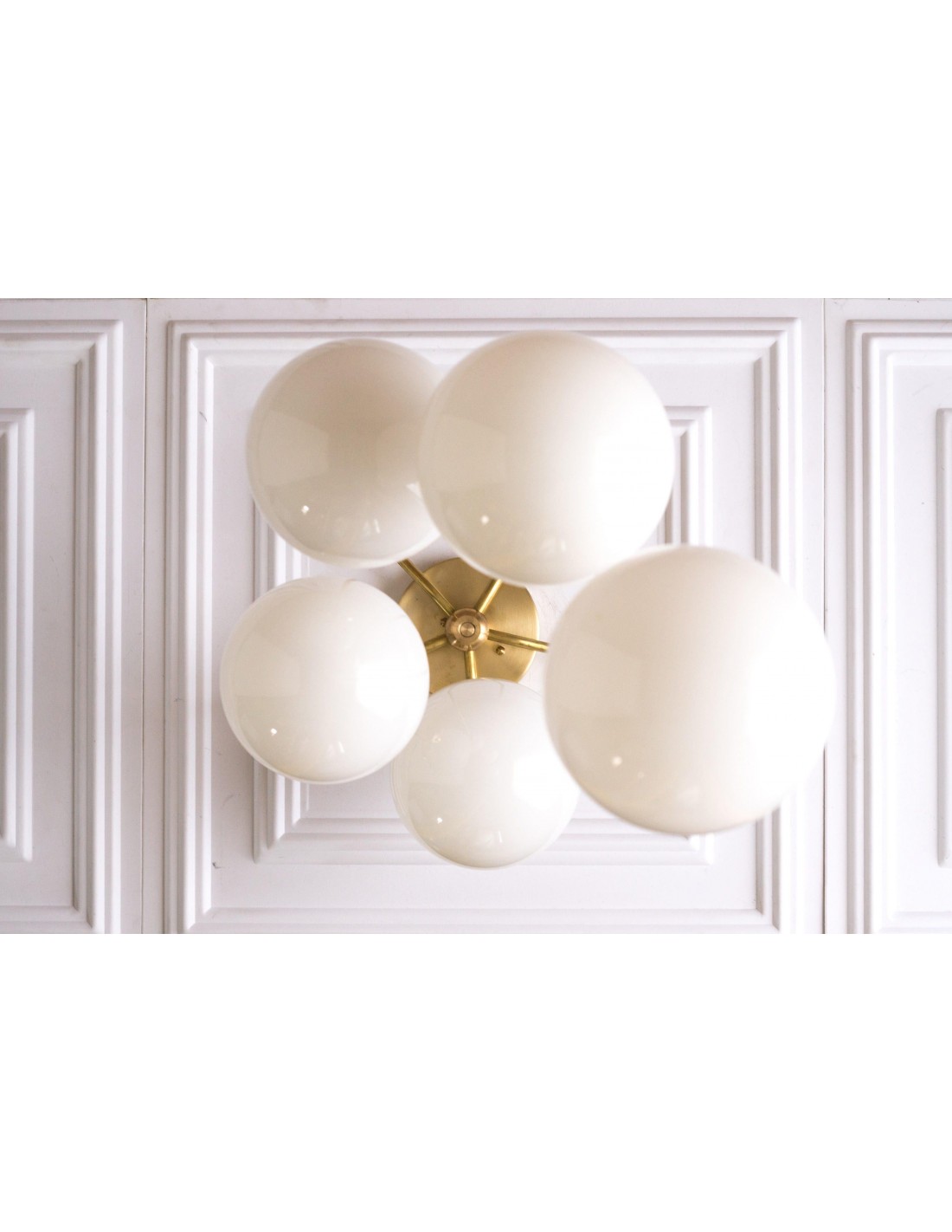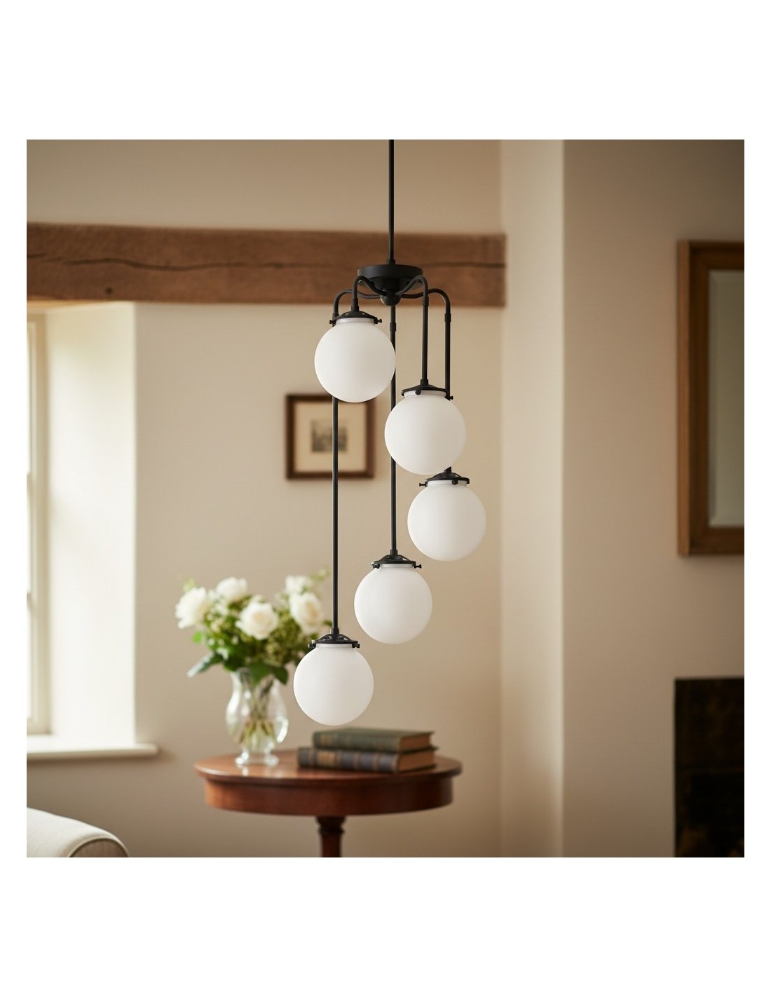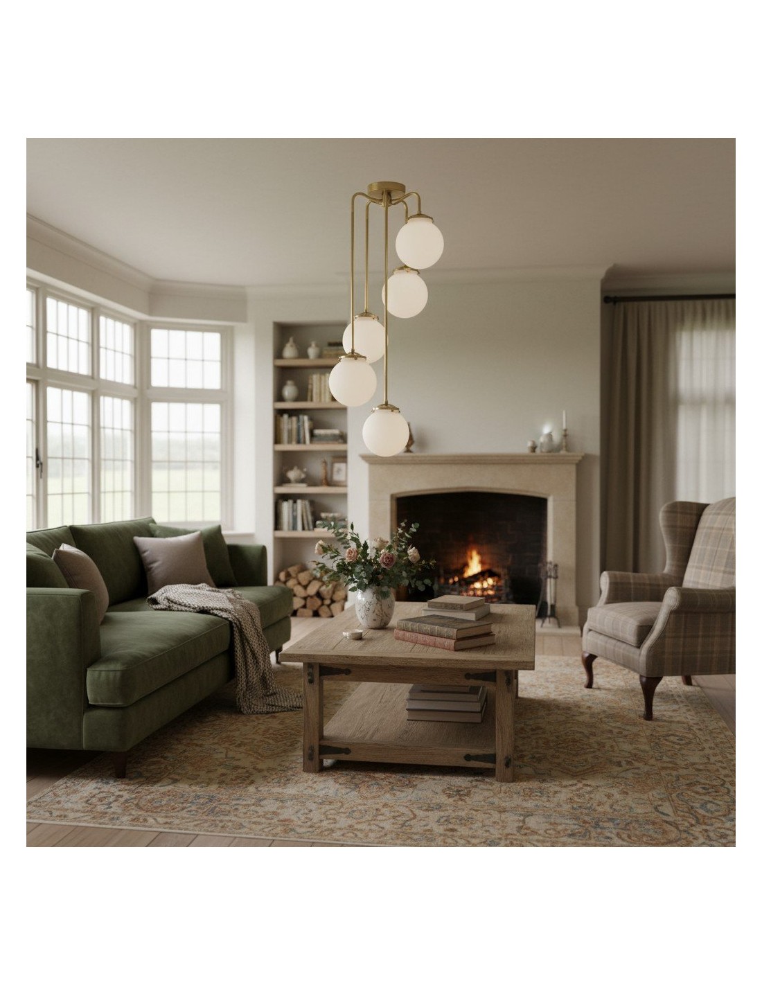 Maak een verbluffende indruk met onze kroonluchter met vijf bollen. Met opaalglazen bollen die aan warme messing armen van verschillende lengtes hangen, werpt dit stuk een prachtig zacht, diffuus licht. Perfect boven een eettafel of in een hal, combineert hij vintage charme met een moderne touch en creëert zo een blikvanger van tijdloze elegantie.