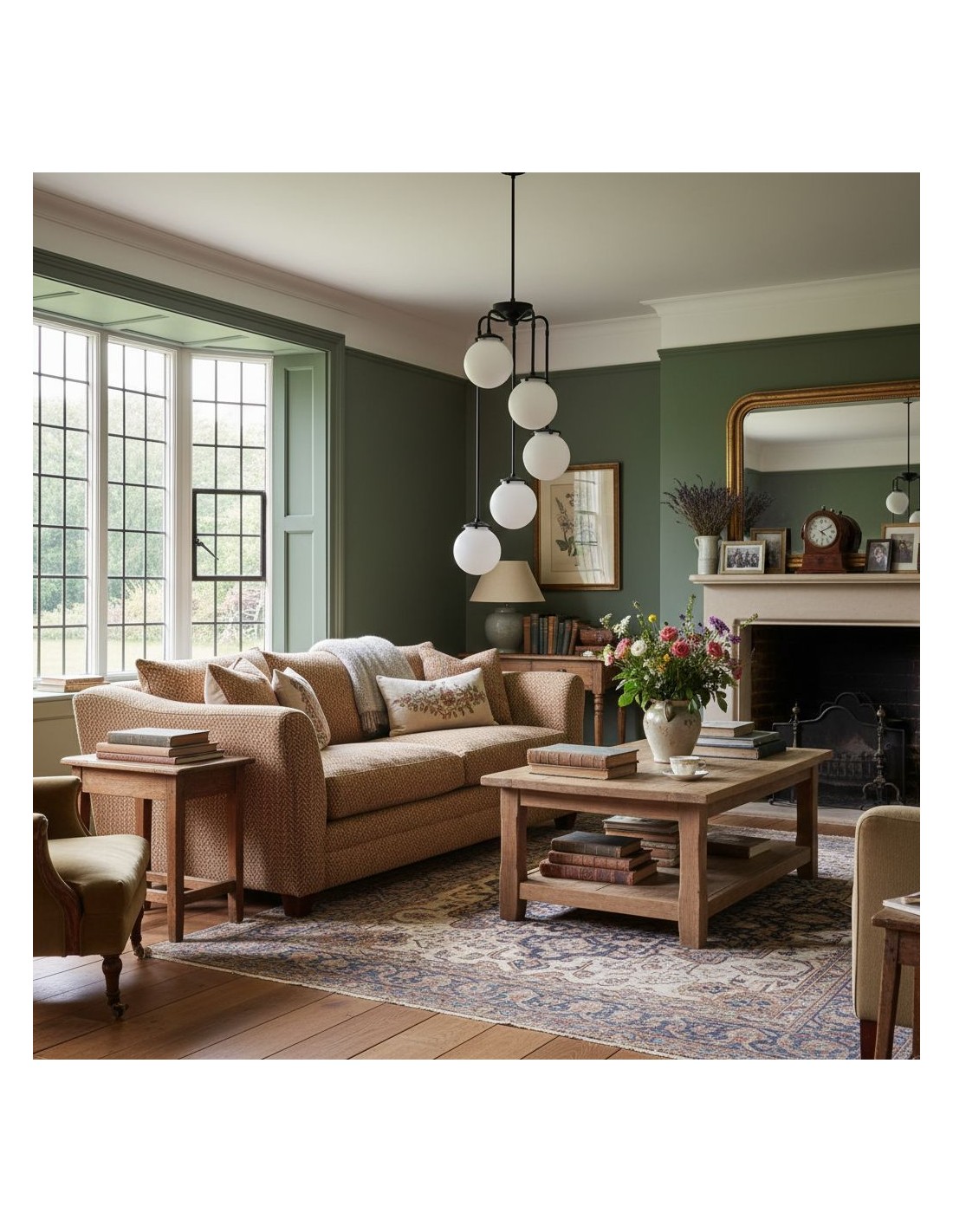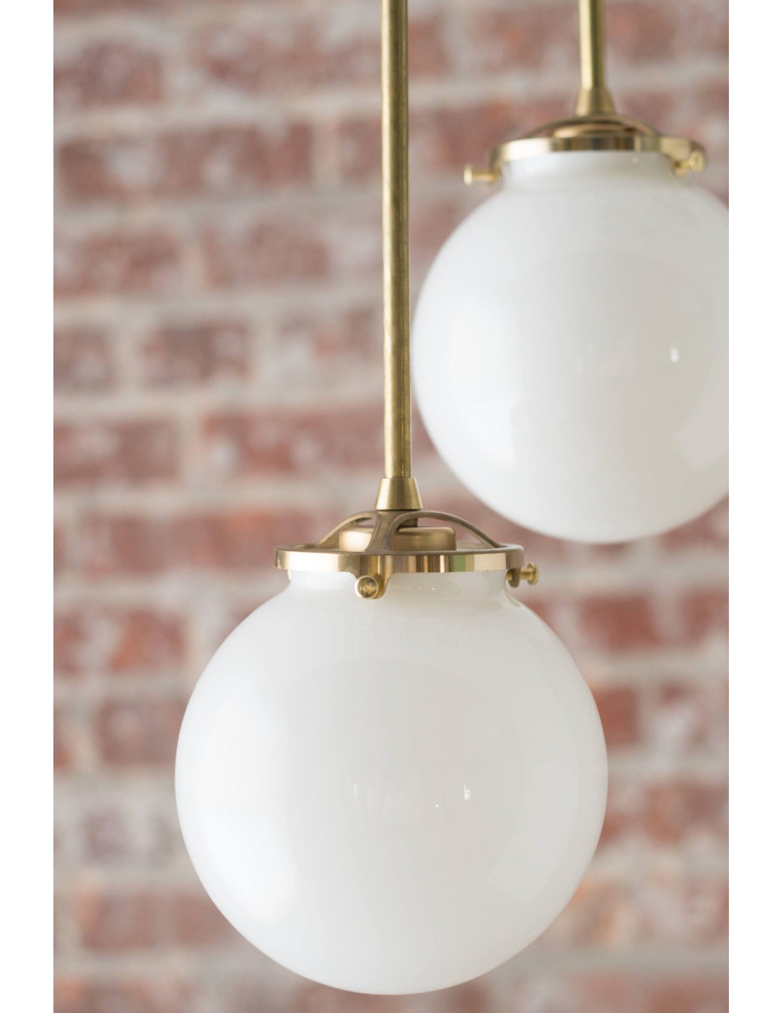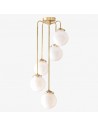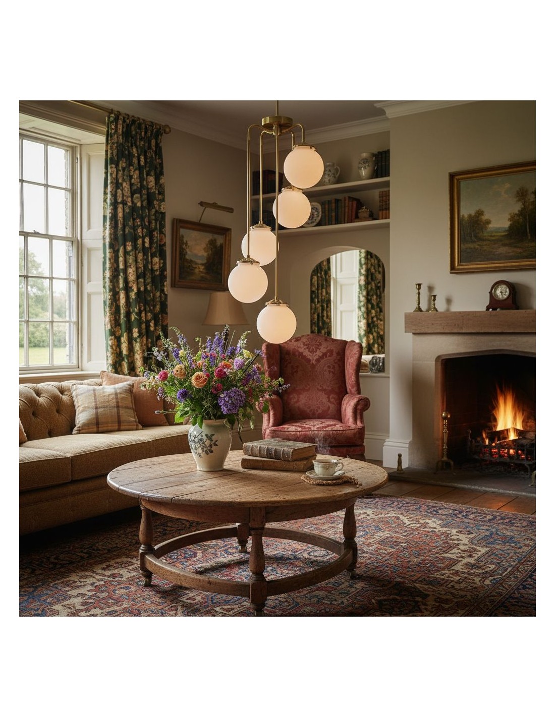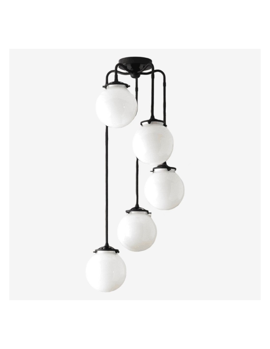Maak een verbluffende indruk met onze kroonluchter met vijf bollen. Met opaalglazen bollen die aan warme messing armen van verschillende lengtes hangen, werpt dit stuk een prachtig zacht, diffuus licht. Perfect boven een eettafel of in een hal, combineert hij vintage charme met een moderne touch en creëert zo een blikvanger van tijdloze elegantie.