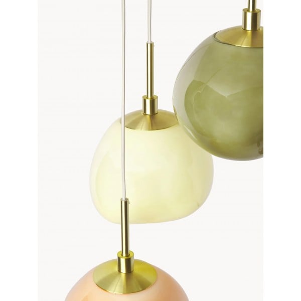 Geef je huis een boost met de Multi-Shade Opal Glass Pendant, een cluster hanglamp die pasteltinten combineert met gouden accenten voor een chique en moderne look. De lamp heeft crèmewitte, lichtgroene en abrikooskleurige opaalglazen kappen die een zacht, flatterend licht uitstralen, perfect voor een gezellige en uitnodigende sfeer.