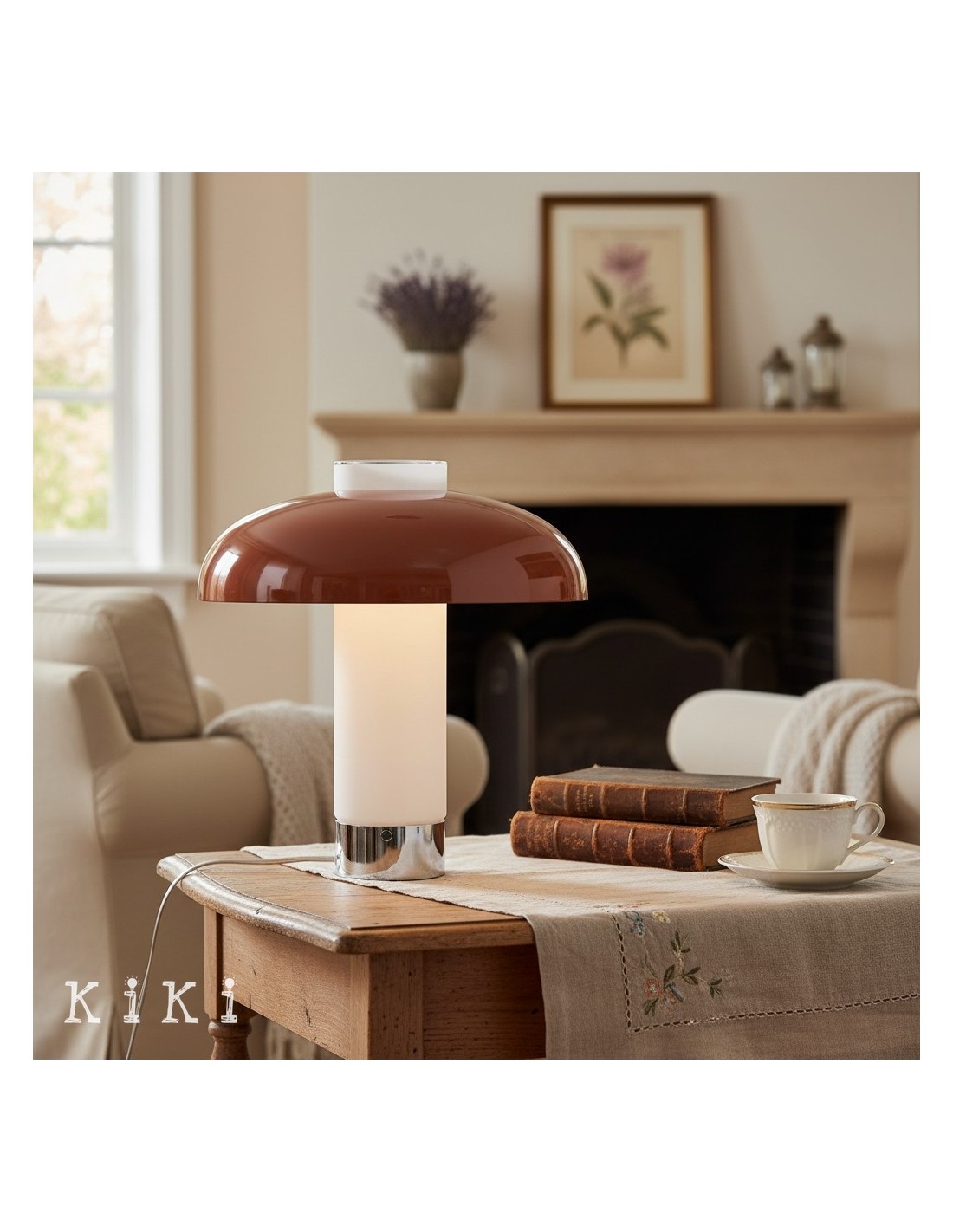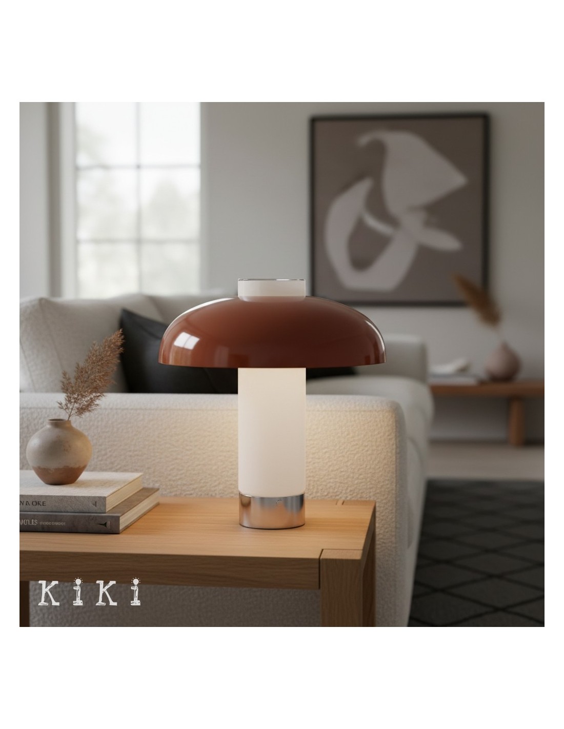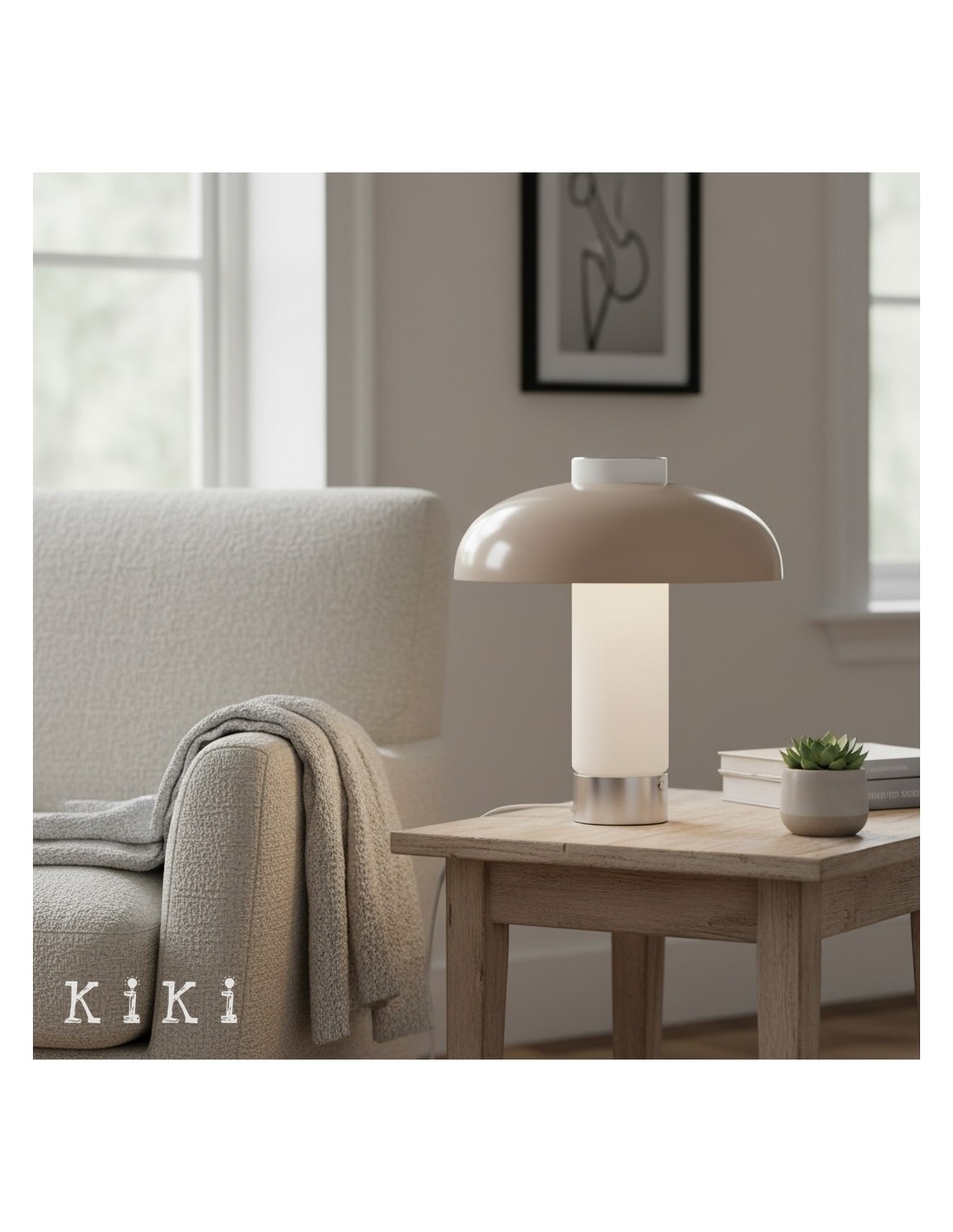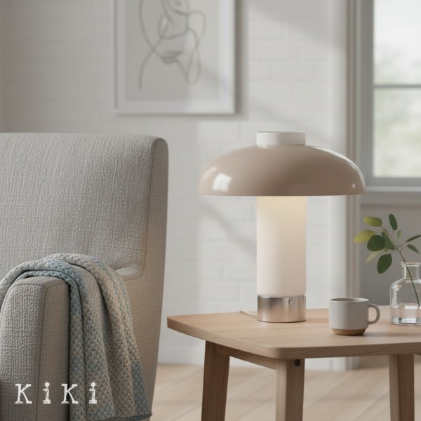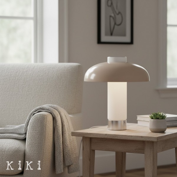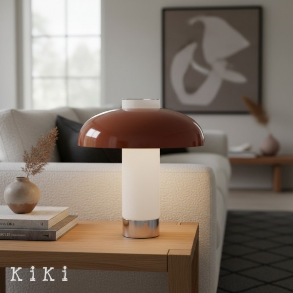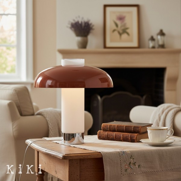 Deze eigentijdse tafellamp heeft een brede, platte glazen kap in combinatie met een slanke metalen voet, wat resulteert in een strak en evenwichtig silhouet geïnspireerd op minimalistisch design. De ronde glazen kap heeft een verfijnd horizontaal profiel en biedt een moderne uitstraling met behoud van een lichte en luchtige look.