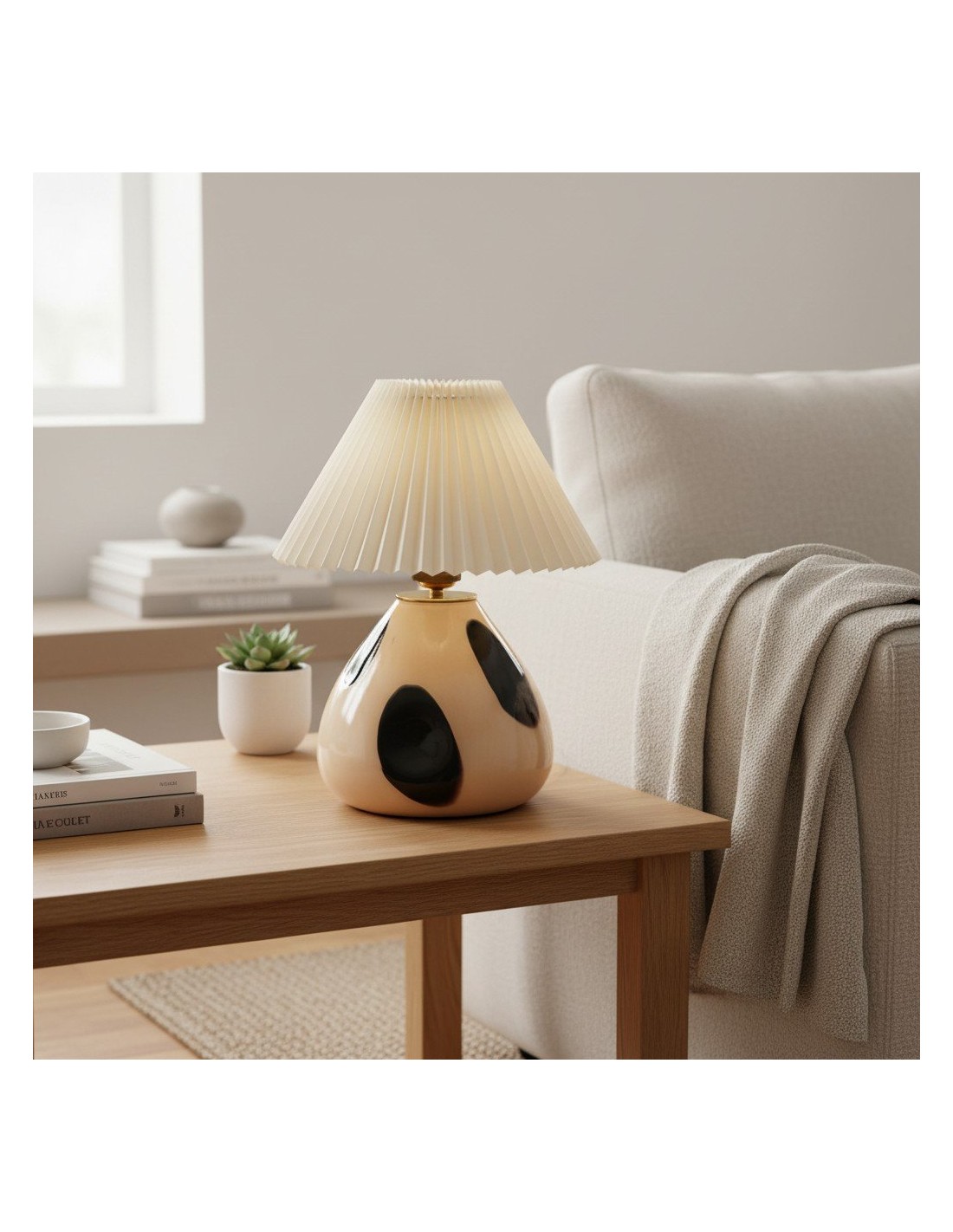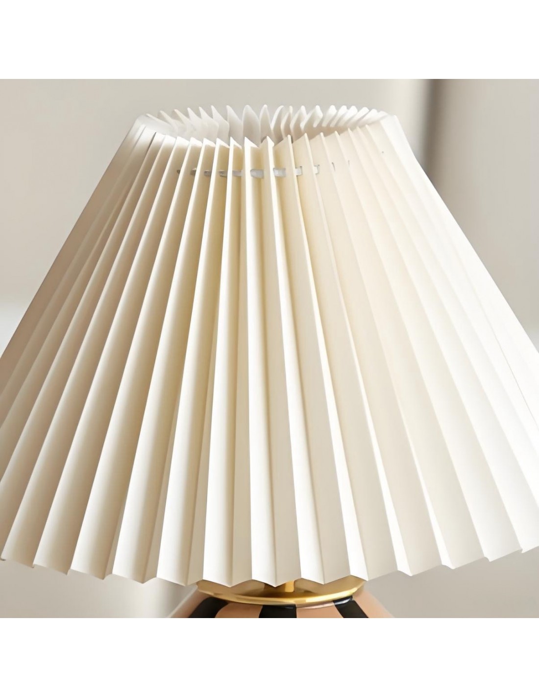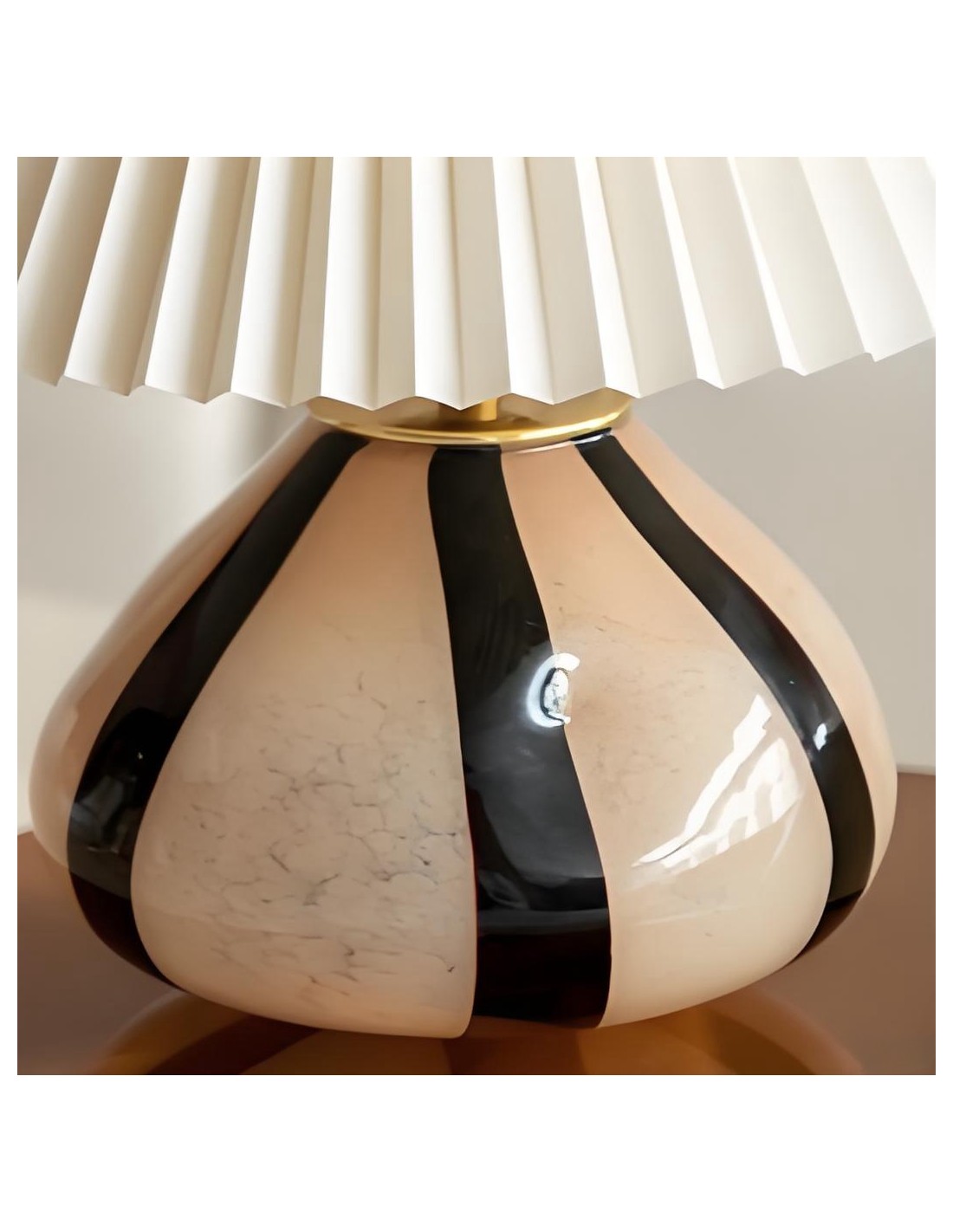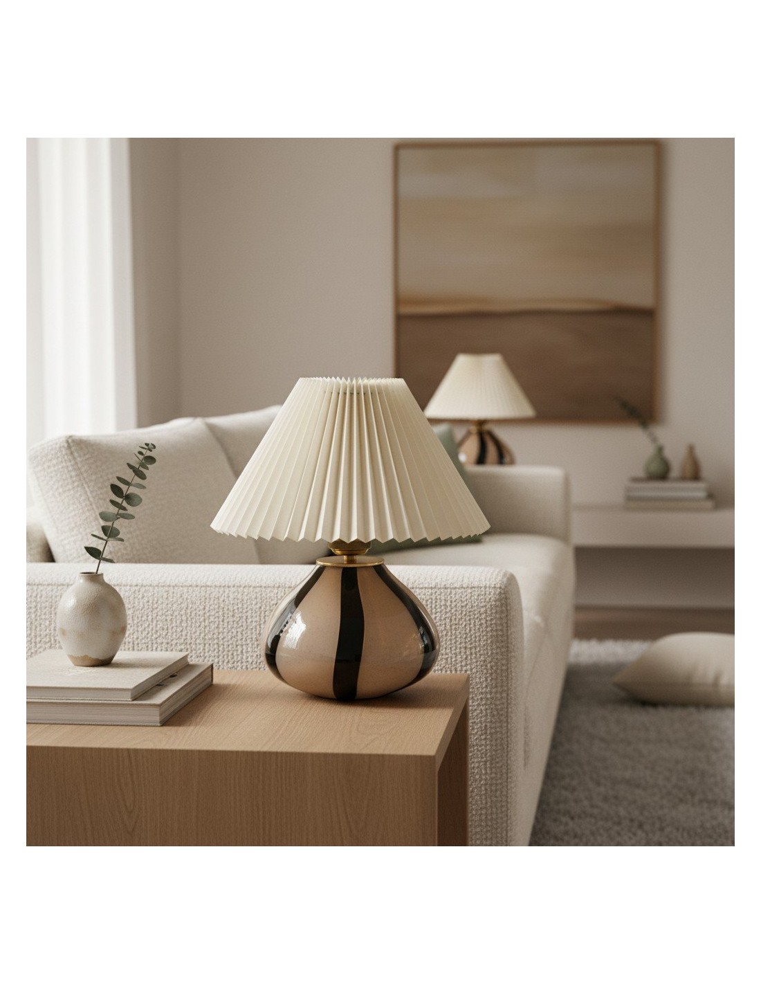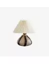 De tafellamp combineert een zacht geplooide stoffen kap met een slanke glazen voet, waardoor een warme, uitnodigende gloed ontstaat. De geplooide stoffen kap verspreidt het licht subtiel en werpt zachte schaduwen voor een gezellige, sfeervolle ambiance. Dankzij de evenwichtige proporties en het tijdloze silhouet is het een veelzijdige aanwinst voor woonkamers, slaapkamers of leeshoekjes.