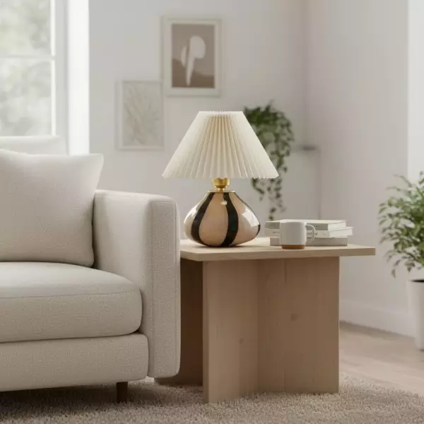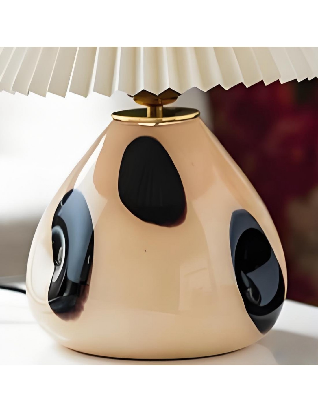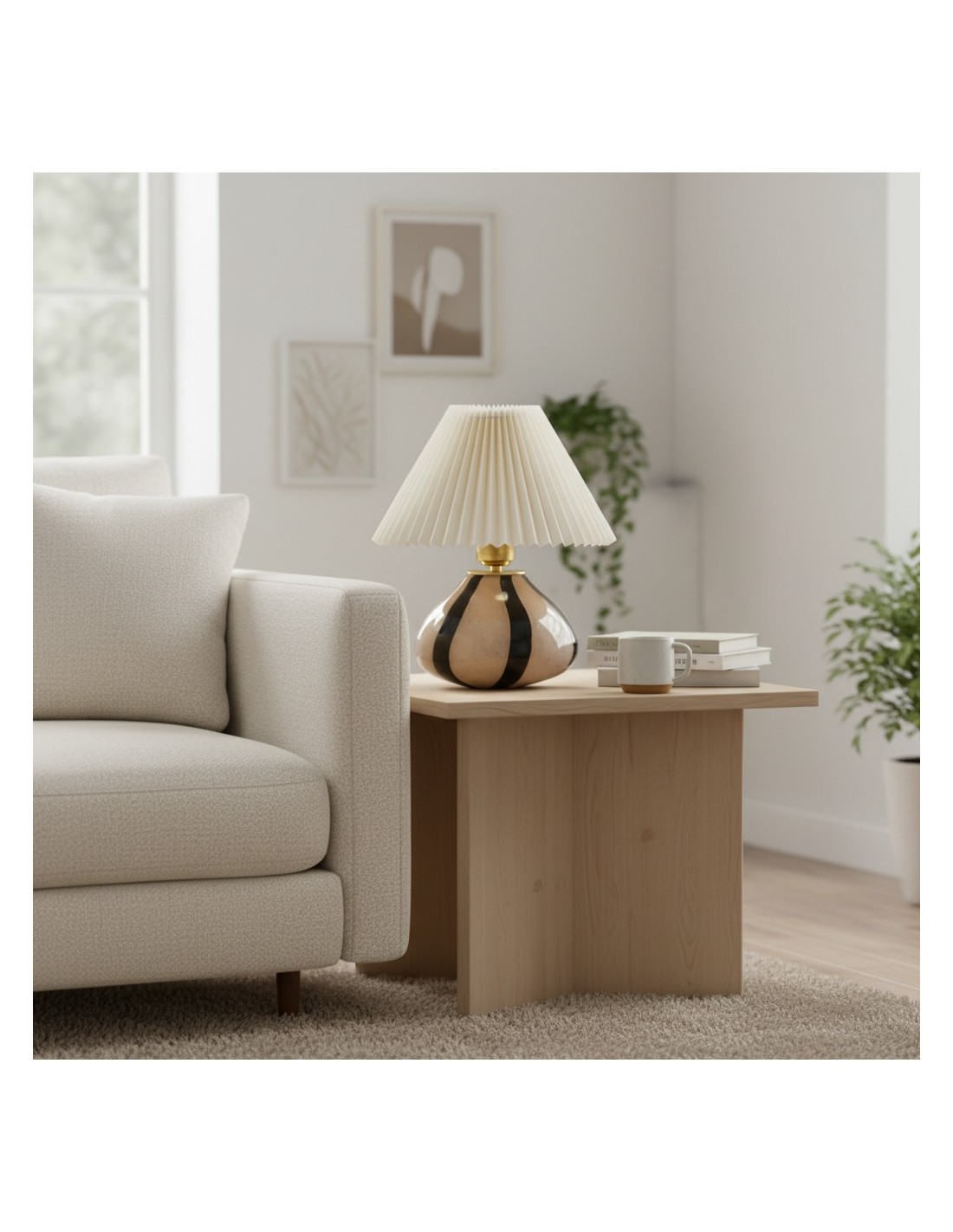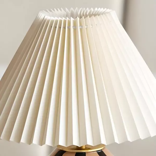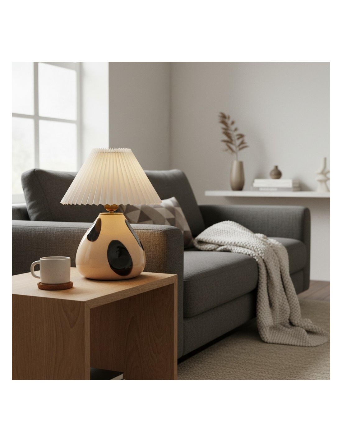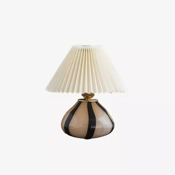 De tafellamp combineert een zacht geplooide stoffen kap met een slanke glazen voet, waardoor een warme, uitnodigende gloed ontstaat. De geplooide stoffen kap verspreidt het licht subtiel en werpt zachte schaduwen voor een gezellige, sfeervolle ambiance. Dankzij de evenwichtige proporties en het tijdloze silhouet is het een veelzijdige aanwinst voor woonkamers, slaapkamers of leeshoekjes.