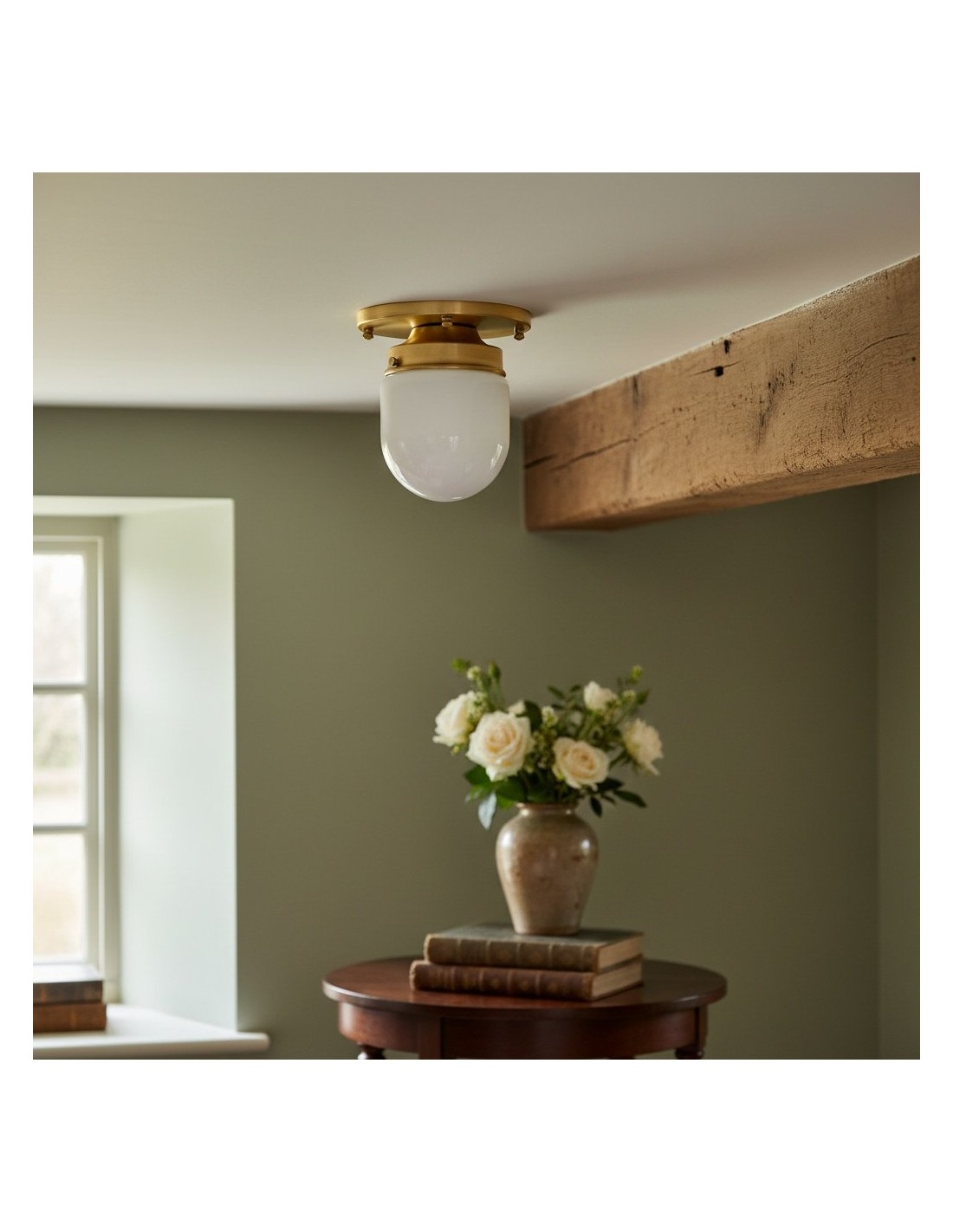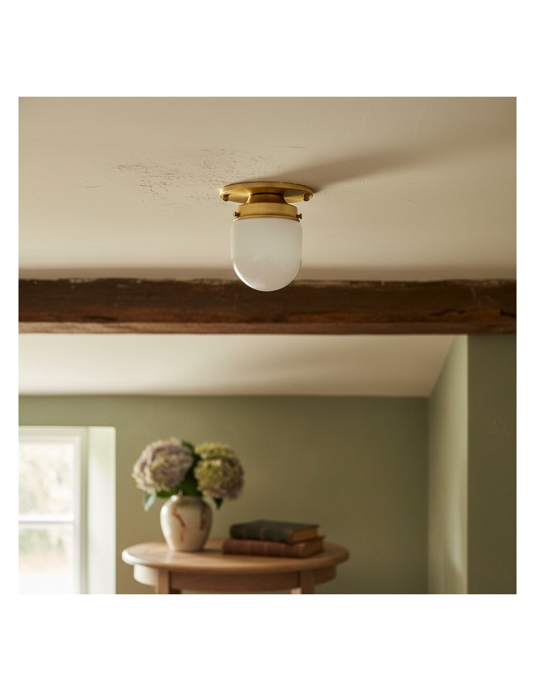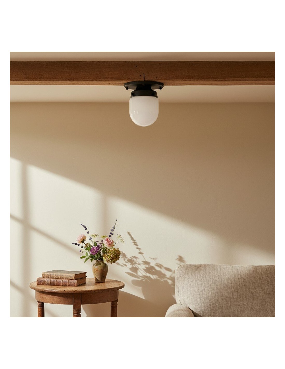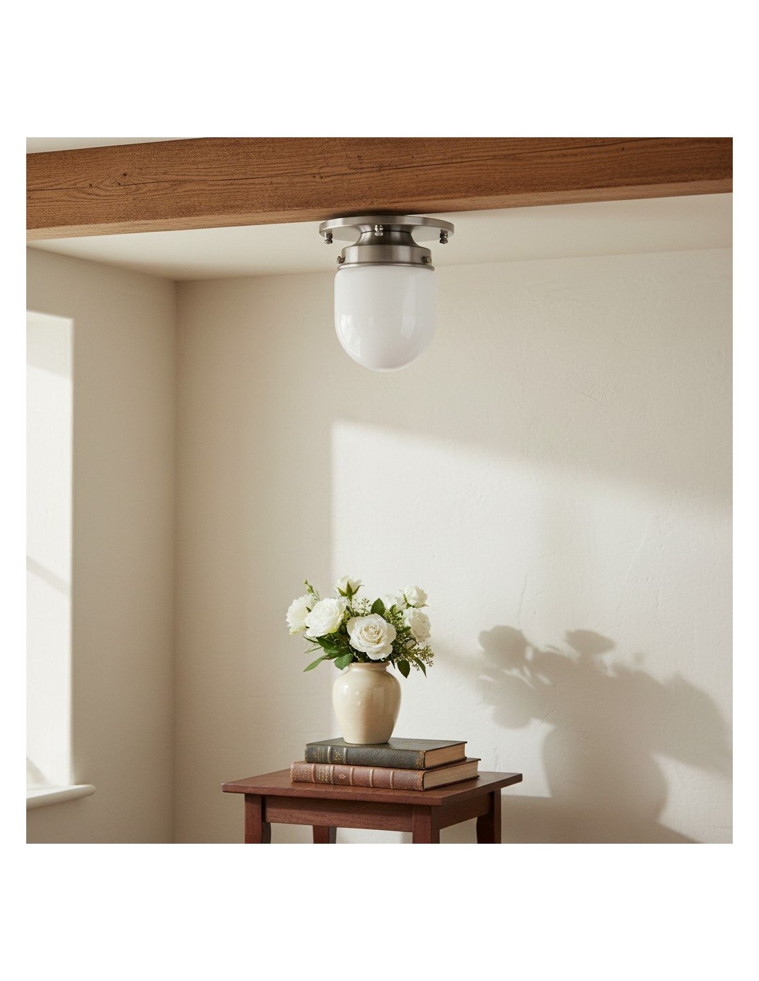 Verfraai compacte ruimtes met de Opalume Glass plafondlamp met een kogelvormige bol van opaalglas. Geïnspireerd door de Art Deco-stijl, zorgt deze armatuur voor een zachte, sfeervolle gloed en bespaart tegelijkertijd ruimte. Perfect voor gangen, entrees of ruimtes met een laag plafond die tijdloze elegantie zoeken.