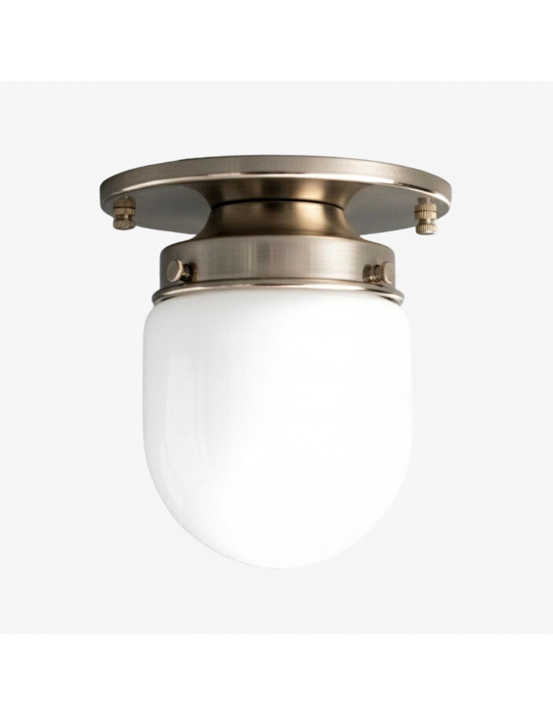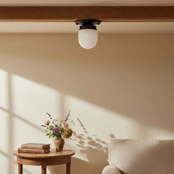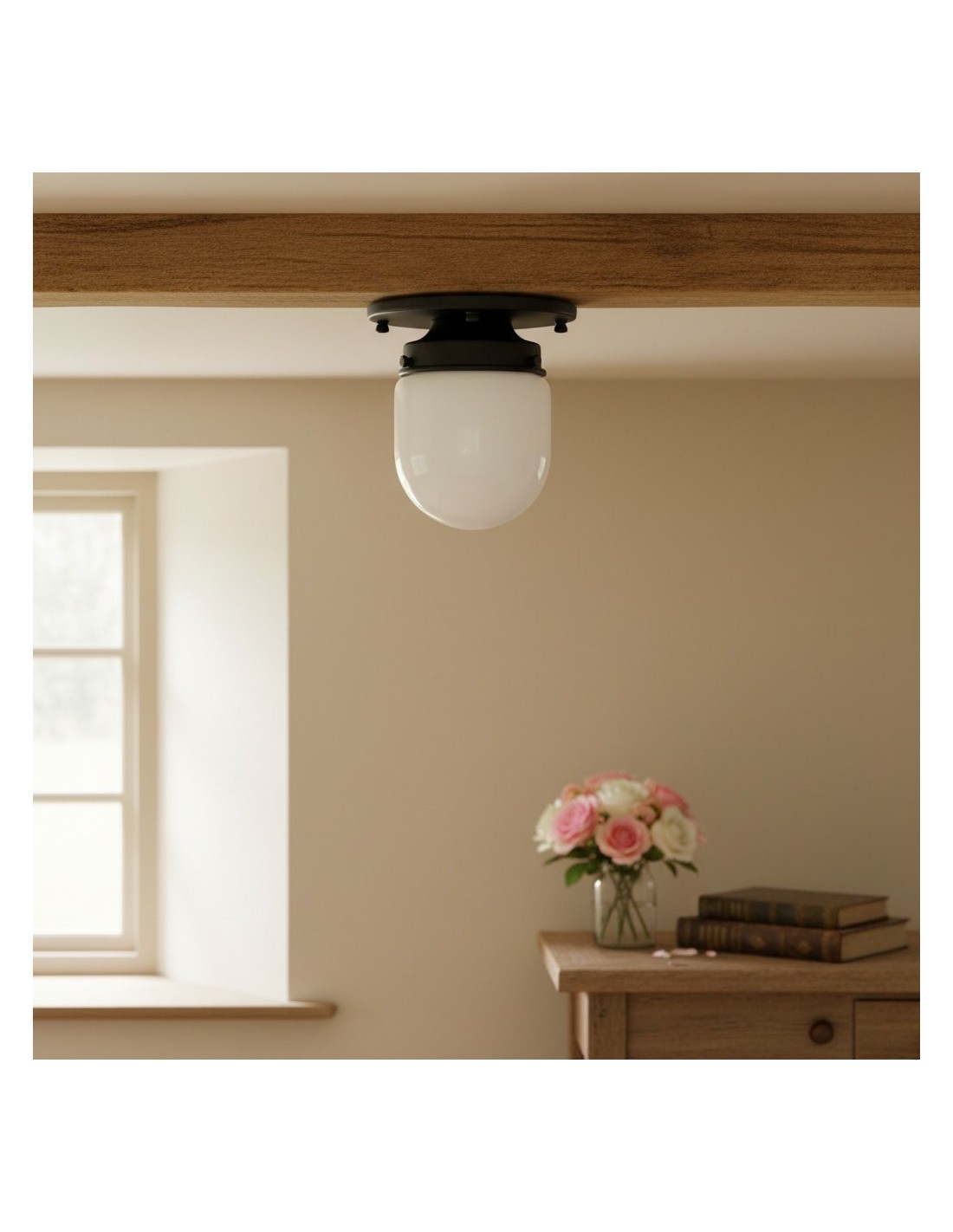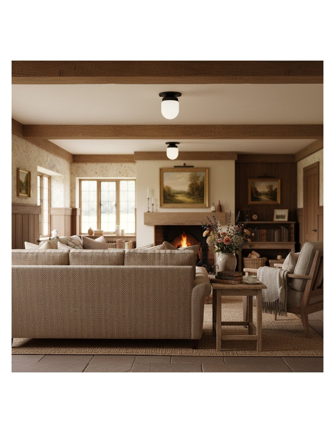 Verfraai compacte ruimtes met de Opalume Glass plafondlamp met een kogelvormige bol van opaalglas. Geïnspireerd door de Art Deco-stijl, zorgt deze armatuur voor een zachte, sfeervolle gloed en bespaart tegelijkertijd ruimte. Perfect voor gangen, entrees of ruimtes met een laag plafond die tijdloze elegantie zoeken.