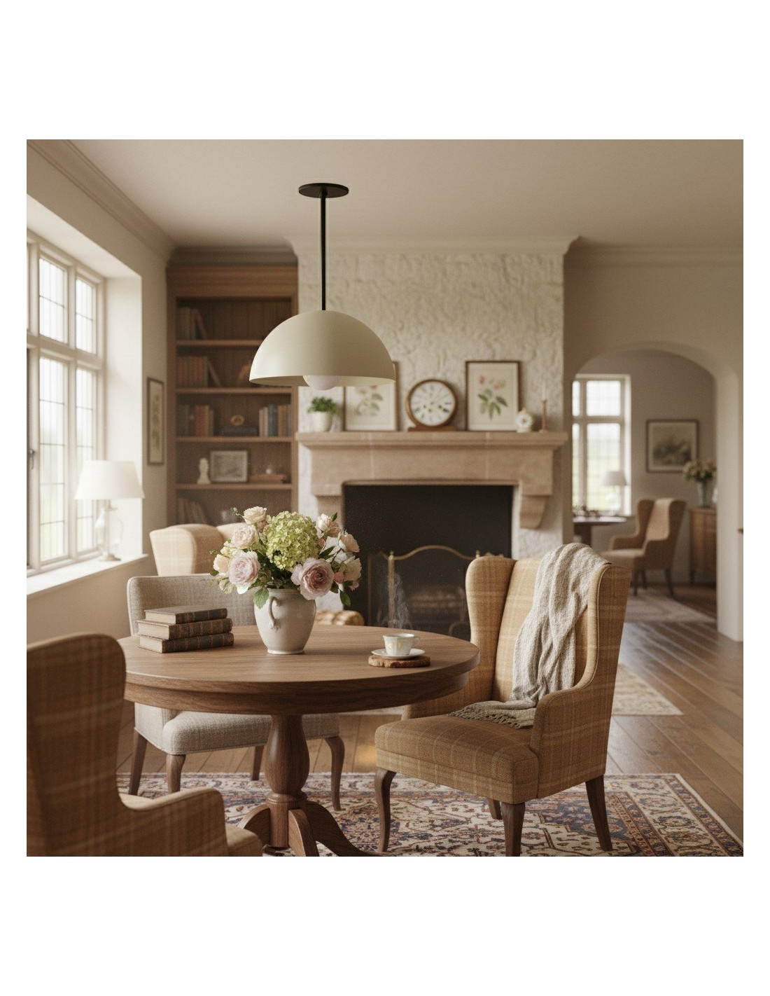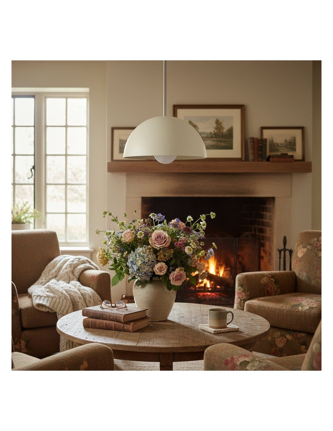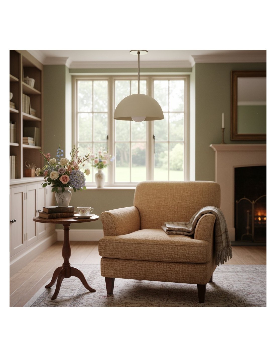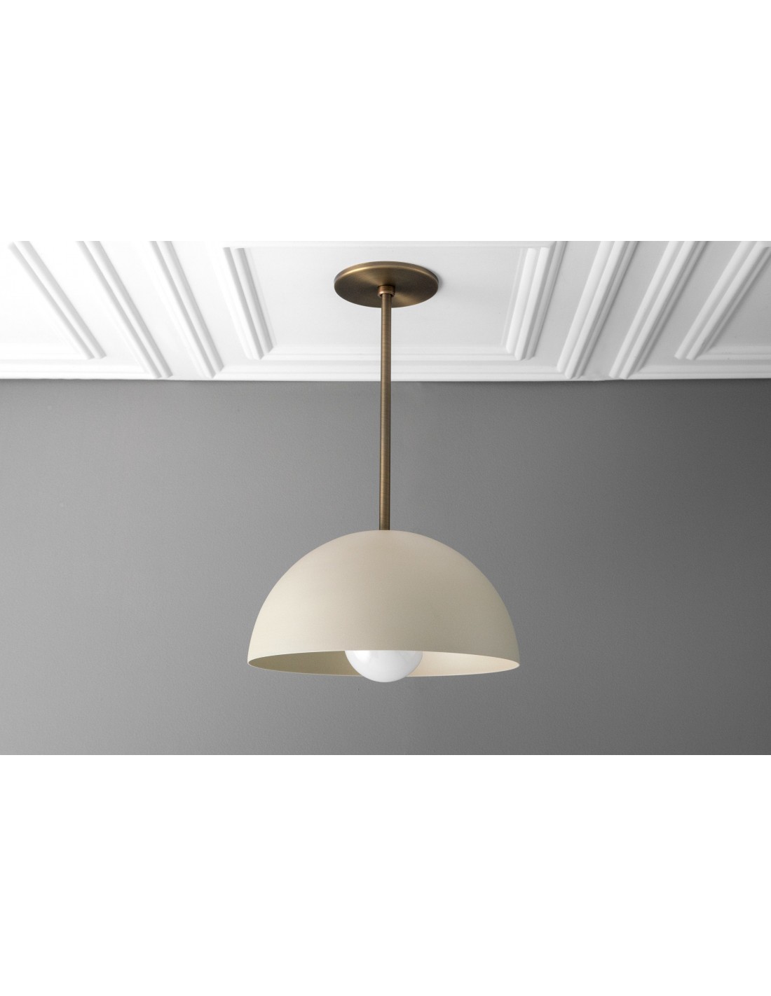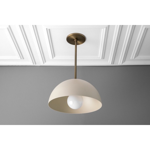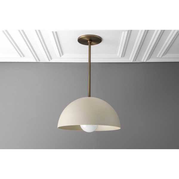 Een neutrale koepelvormige hanglamp die dienstdoet als moderne metalen accentverlichting. De combinatie van een zachte, koepelvormige kap en een metalen staaf/plafondplaat creëert een evenwichtige look die goed past in verschillende ruimtes. Of u hem nu gebruikt in een gezellige woonkamerhoek, een chique slaapkamer of een modern kantoor, deze hanglamp voegt een vleugje verfijning toe. Het veelzijdige ontwerp zorgt ervoor dat hij zich gemakkelijk aanpast aan verschillende kleurenschema's en designstijlen.
