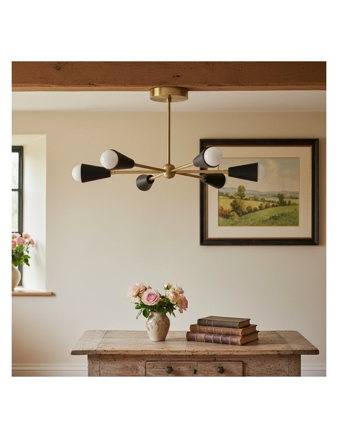 Geef je huis weelde en modern design. Deze Flush Brass kroonluchter is gemaakt van hoogwaardig messing en heeft een luxueuze en duurzame gouden afwerking die niet verkleurt. Het bolvormige, semi-flush ontwerp zorgt voor voldoende licht van boven en maakt tegelijkertijd een uitgesproken stijlstatement. De stralende vorm trekt de aandacht en verbetert de sfeer in je hal, eetkamer of moderne slaapkamer.