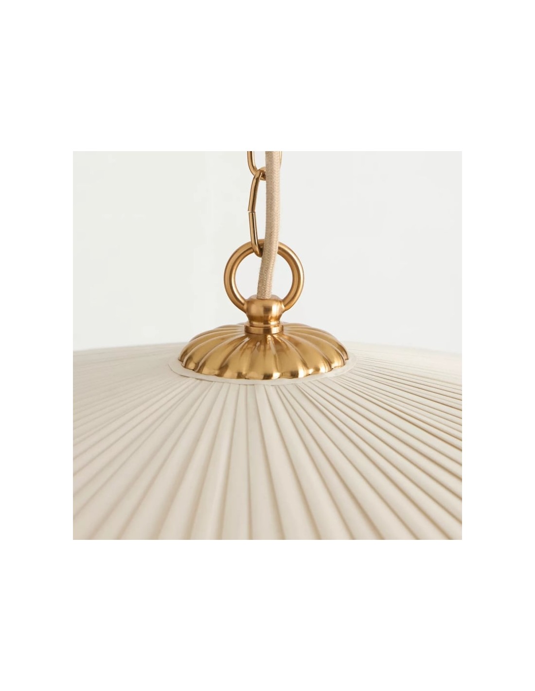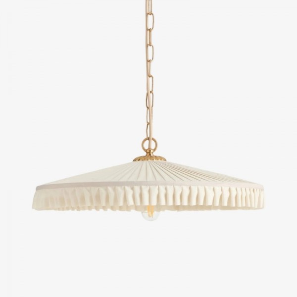 Deze hanglamp heeft een verfijnde, geplooide zijden kap in combinatie met een slank, modern silhouet dat een zachte, uitnodigende gloed verspreidt. De strakke lijnen en verfijnde details maken hem een veelzijdige keuze voor eetkamers, slaapkamers, hallen en andere eigentijdse interieurs.