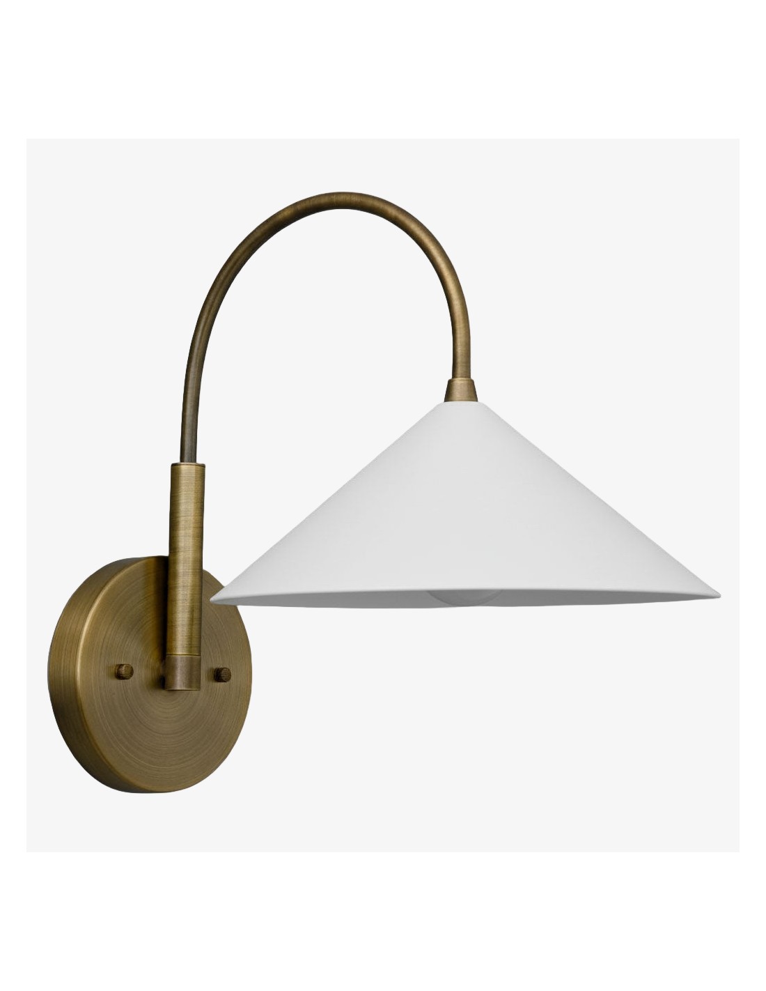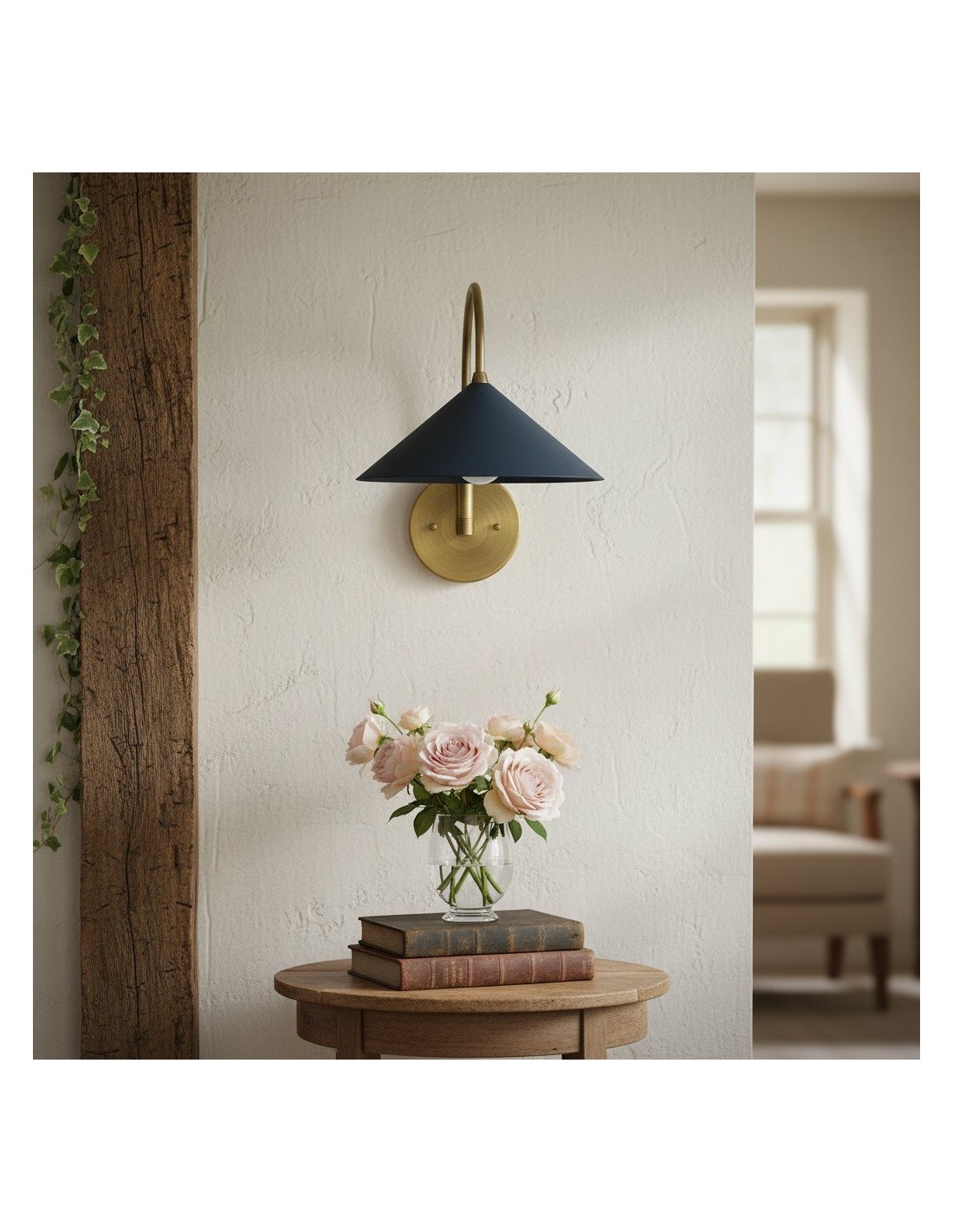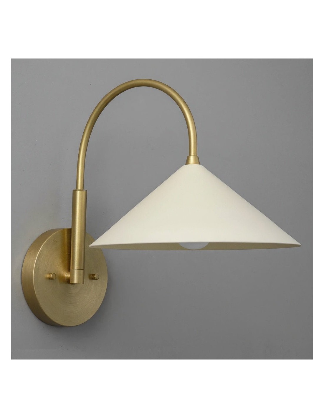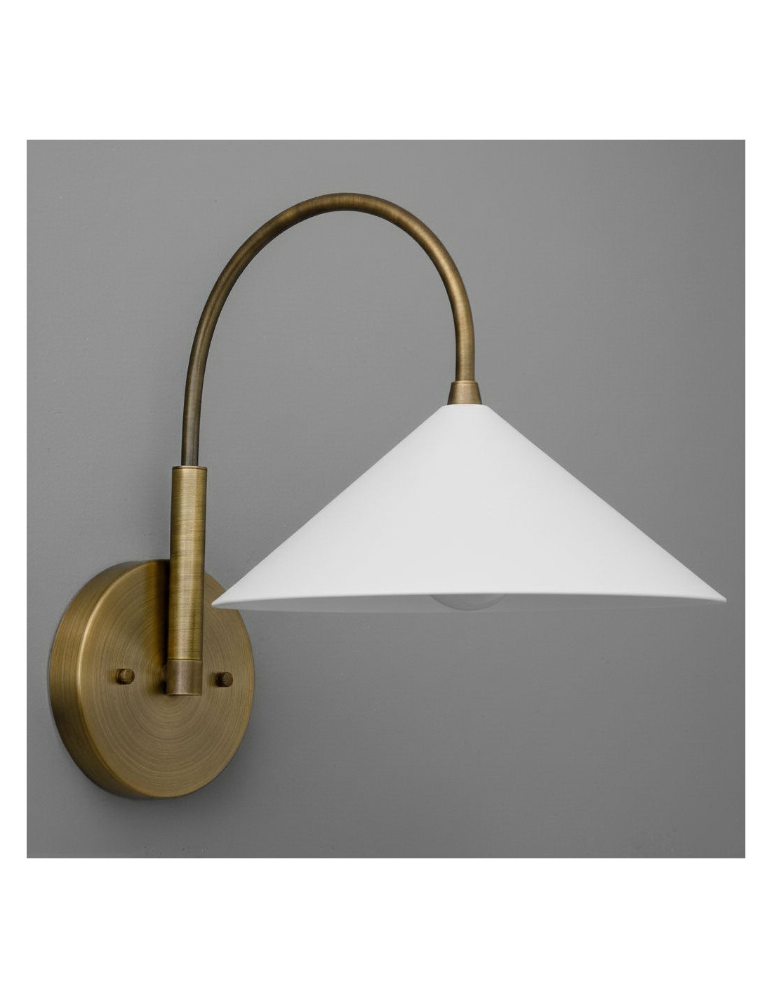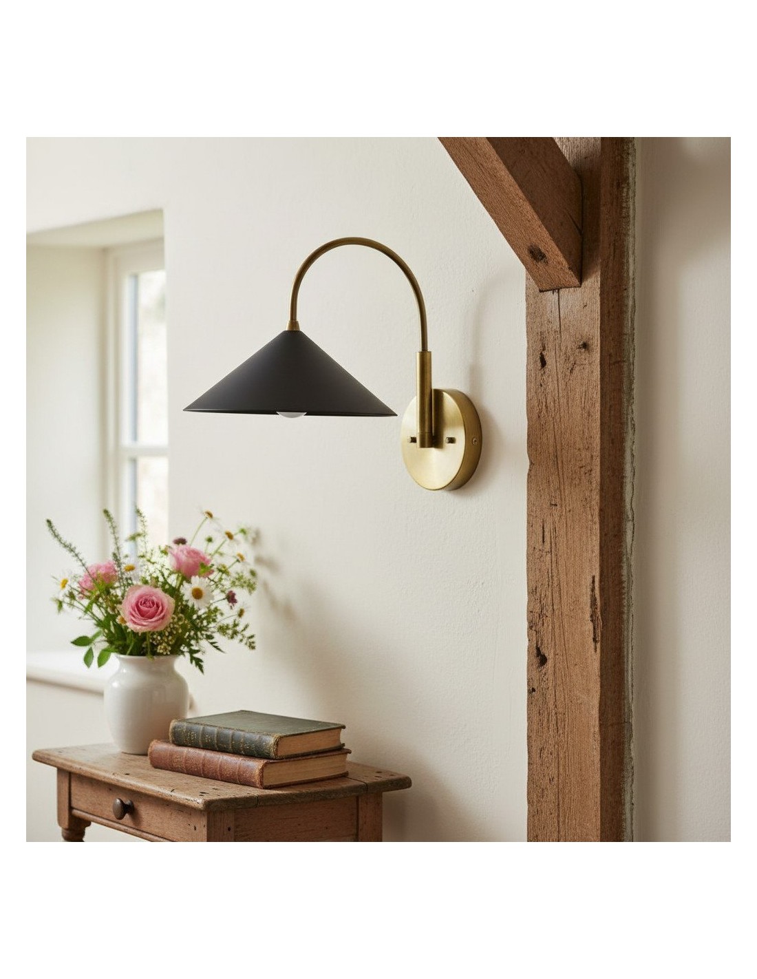Verfraai je interieur met deze verfijnde wandlamp, met een sierlijk gebogen arm van antiek messing en een strakke kegelvormige lampenkap. Het elegante silhouet en de warme metallic afwerking maken hem een ideaal accent voor moderne, vintage of overgangsruimtes. Perfect voor slaapkamers, leeshoekjes of gangen.
