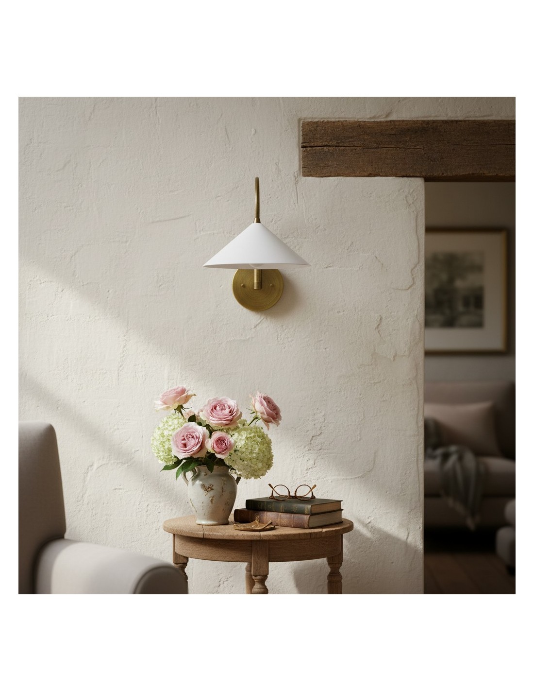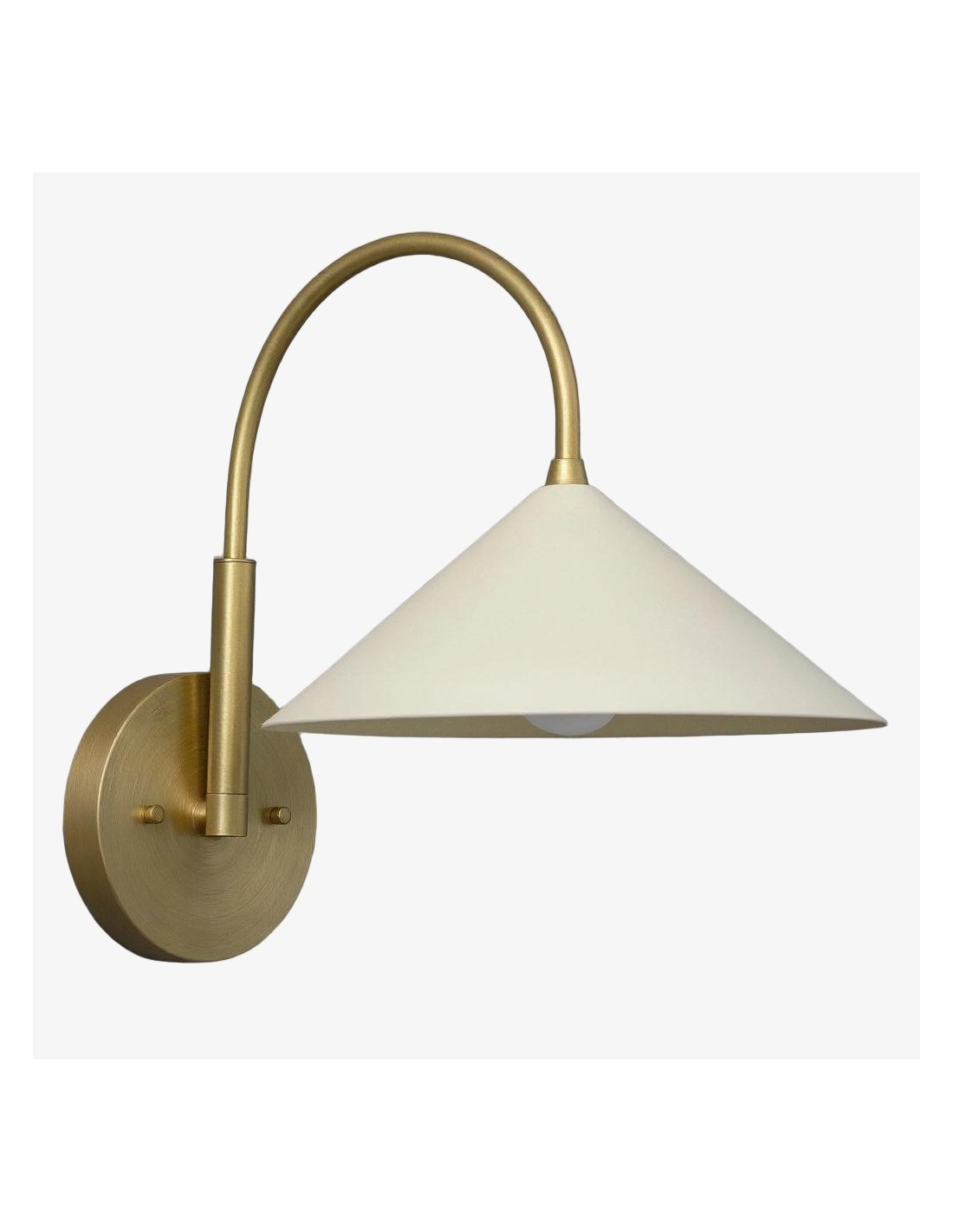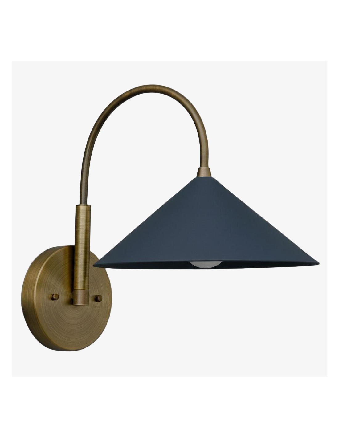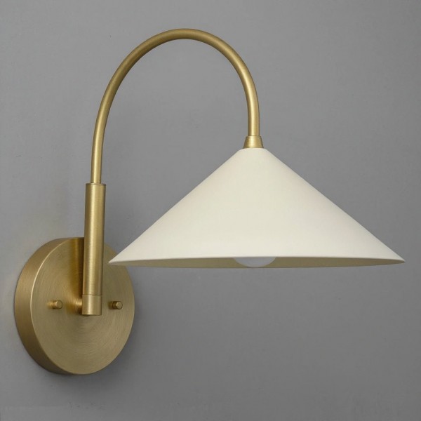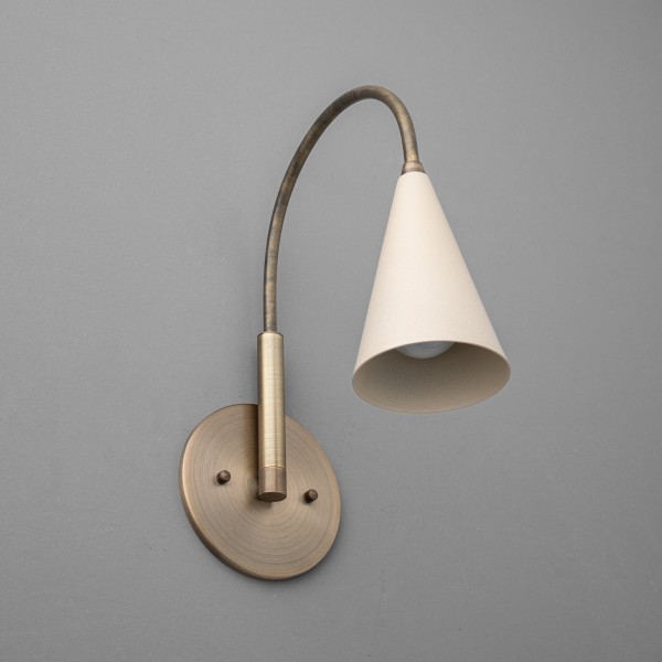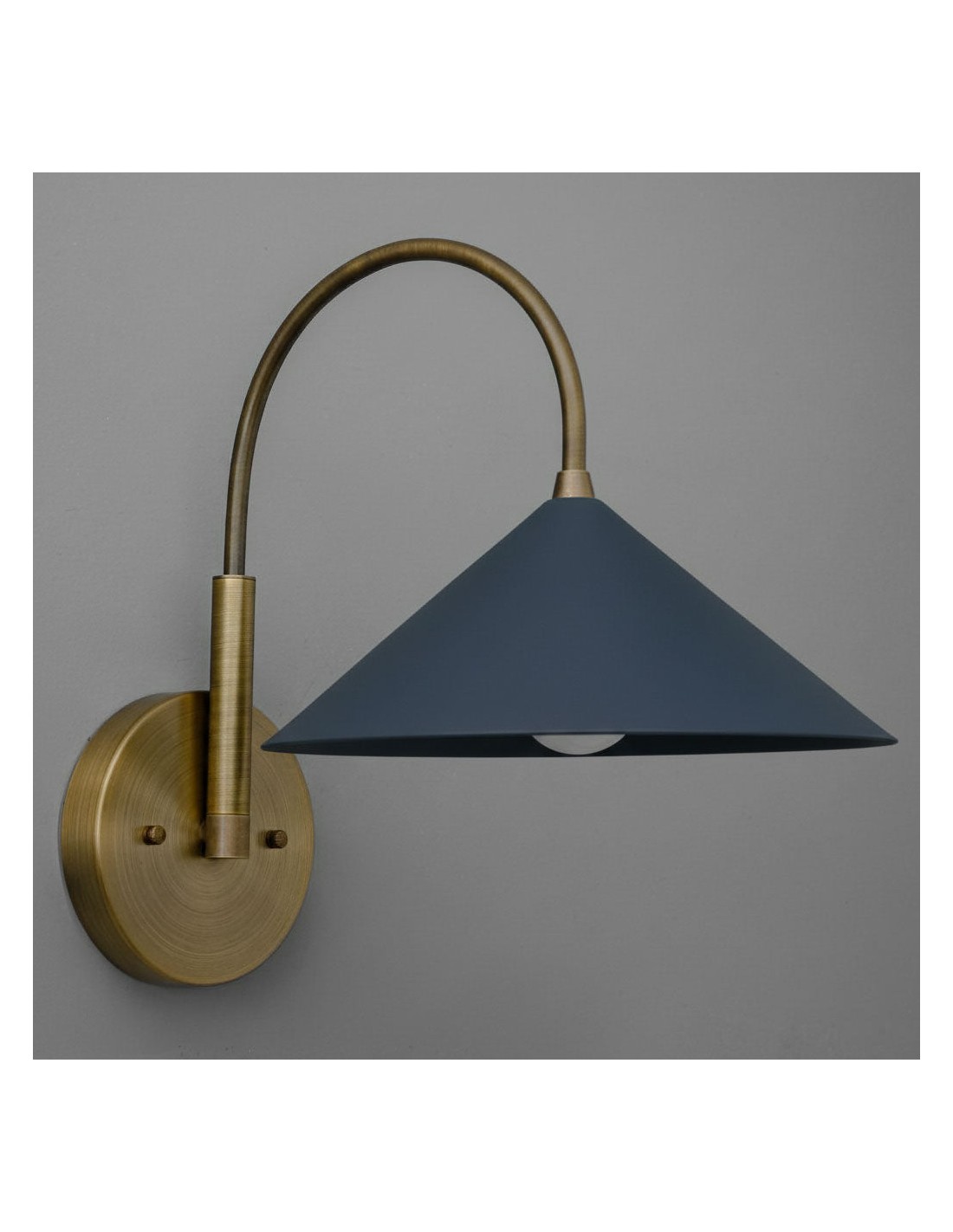 Verfraai je interieur met deze verfijnde wandlamp, met een sierlijk gebogen arm van antiek messing en een strakke kegelvormige lampenkap. Het elegante silhouet en de warme metallic afwerking maken hem een ideaal accent voor moderne, vintage of overgangsruimtes. Perfect voor slaapkamers, leeshoekjes of gangen.
