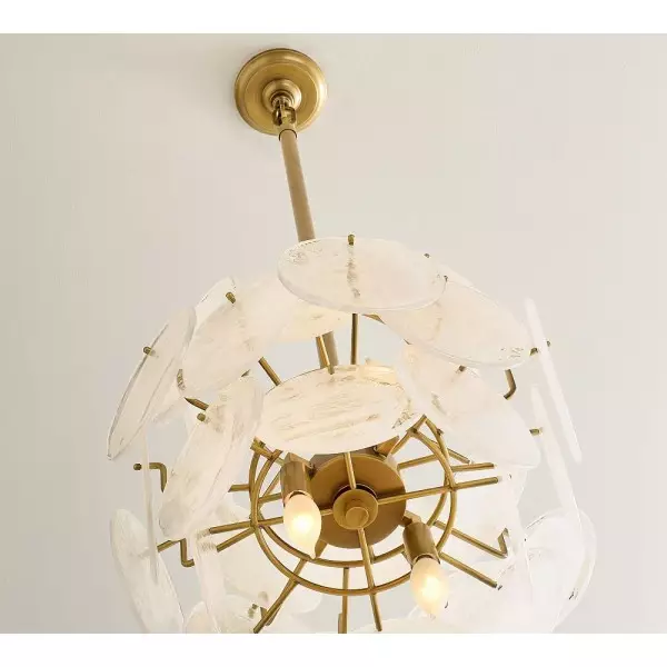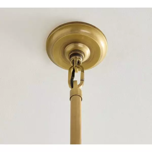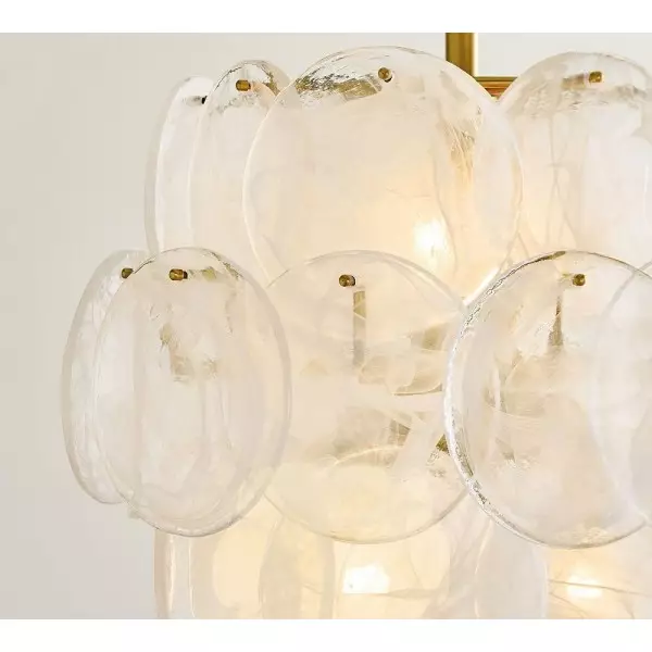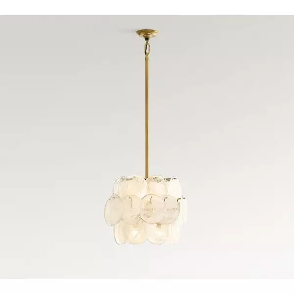 De Cascading Glass Disc hanglamp is vakkundig vervaardigd van duurzaam metaal met een tijdloze vintage messing afwerking. Deze hanglamp voldoet aan de UL-normen en is niet compatibel met een dimmer, waardoor hij in veel omgevingen past. Te gebruiken als hanglamp in de badkamer, hal, slaapkamer of als overdekte buitenlamp.