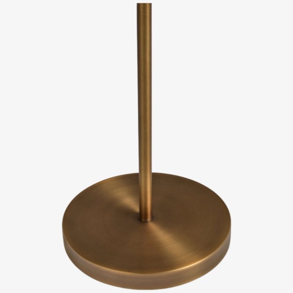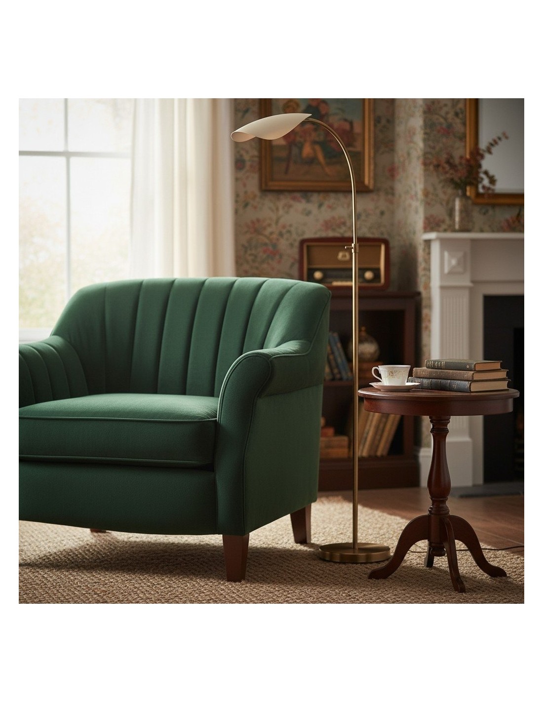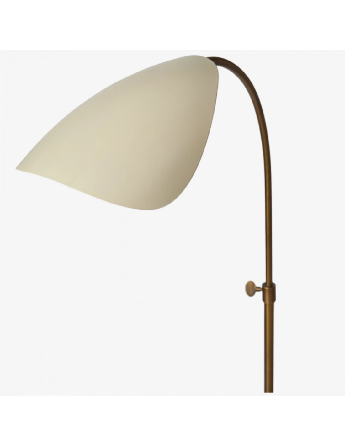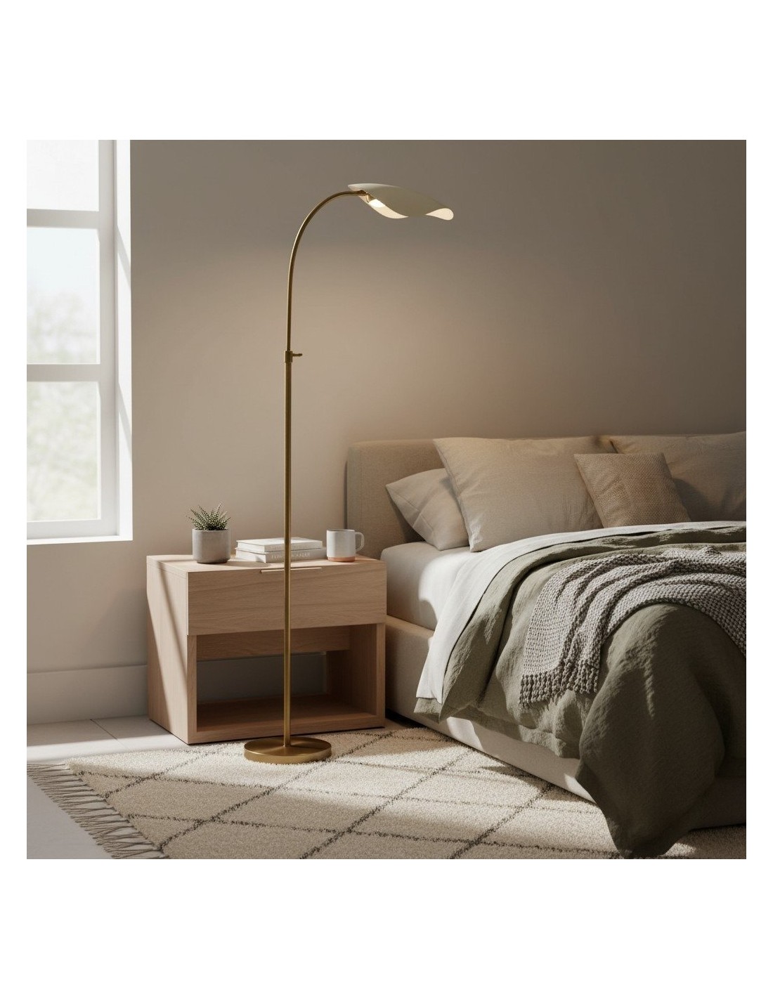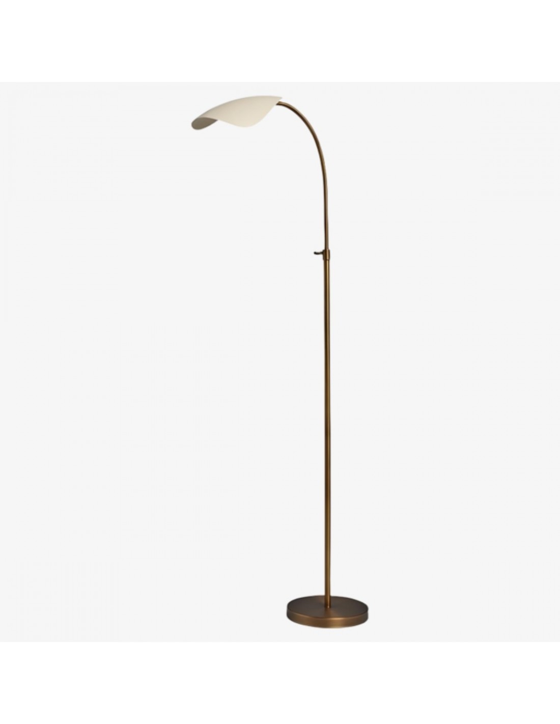 De Shella Task vloerlamp brengt sculpturale elegantie en functionele verlichting in elke ruimte. Het slanke, gebogen frame ondersteunt een sierlijke, bloembladachtige crèmekleurige metalen kap die verstelbaar is om het licht te richten waar nodig. Afgewerkt in antiek messing en vervaardigd uit duurzaam metaal, combineert deze staande lamp modern minimalisme met tijdloze charme.