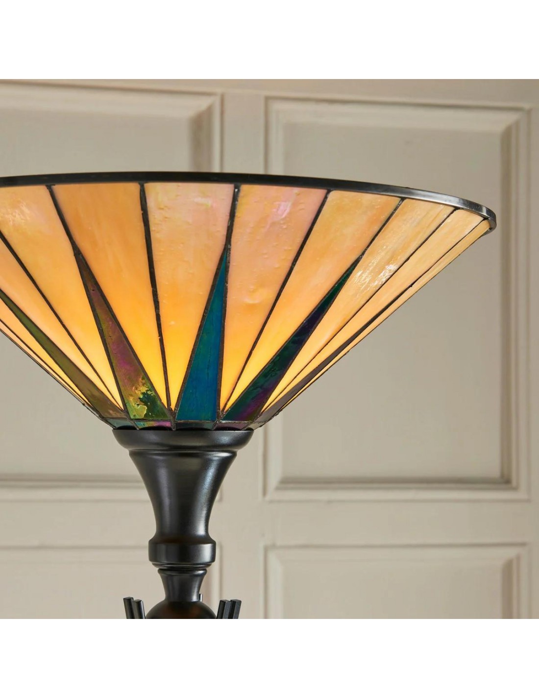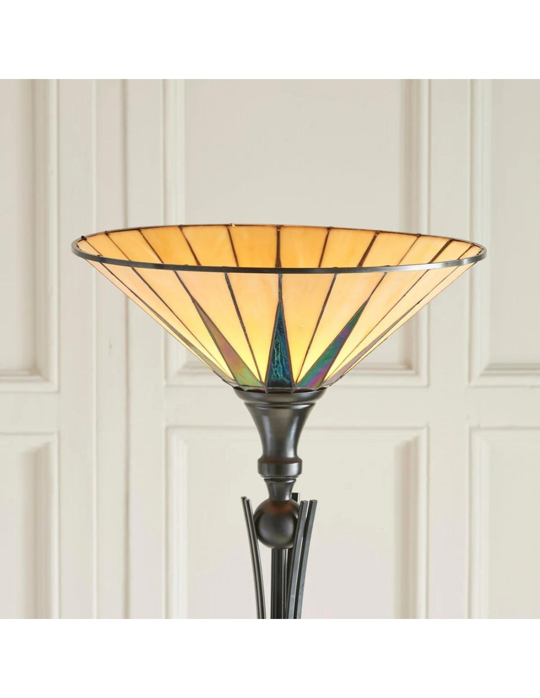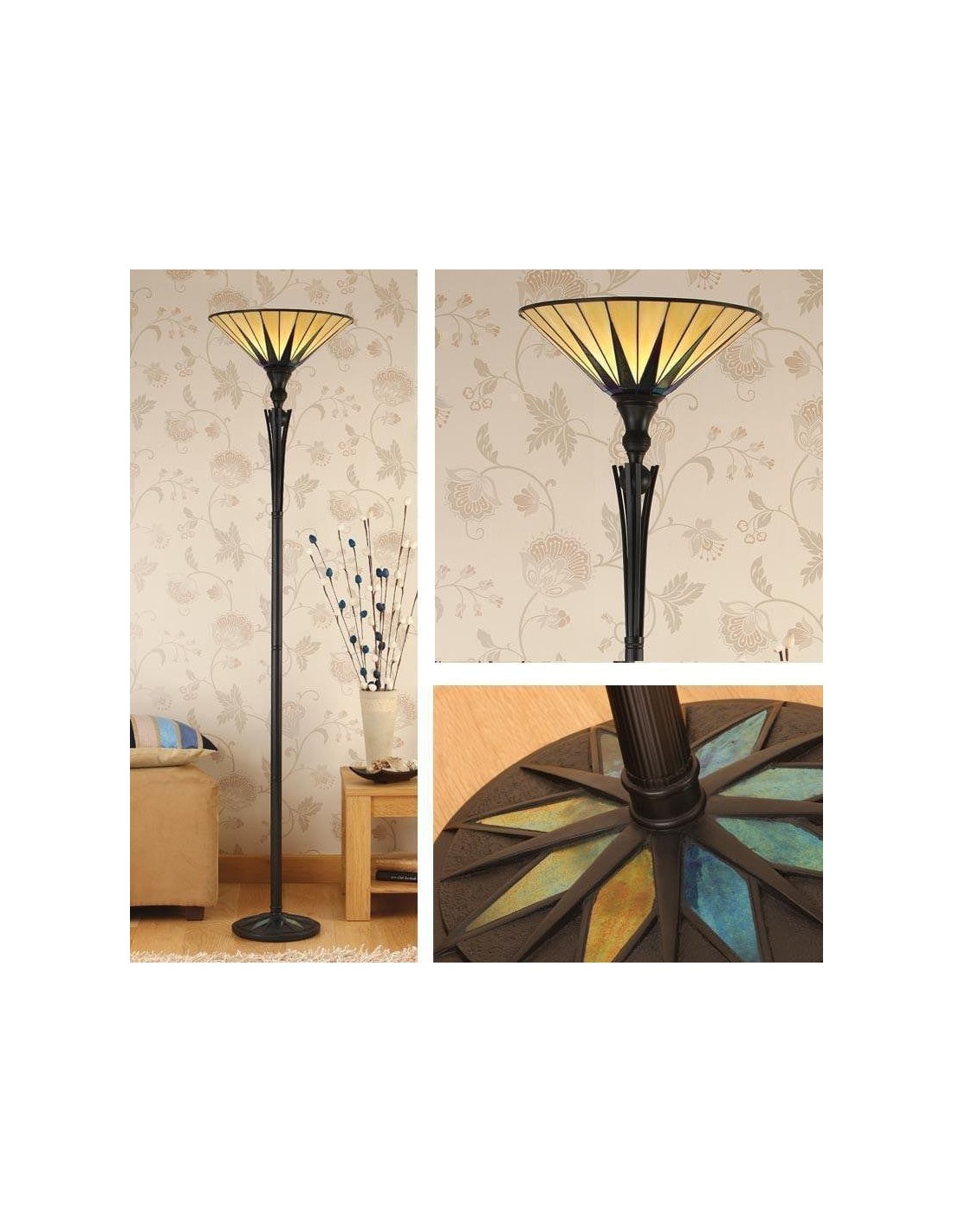 Deze op Tiffany geïnspireerde staande lamp heeft een opvallende, met sterren versierde glazen kap die een warme, sfeervolle gloed verspreidt. De handgemaakte glazen onderdelen en de klassieke art-deco stijl maken het een blikvanger in woonkamers, hallen en leeshoekjes, en geven elk interieur een tijdloze uitstraling.