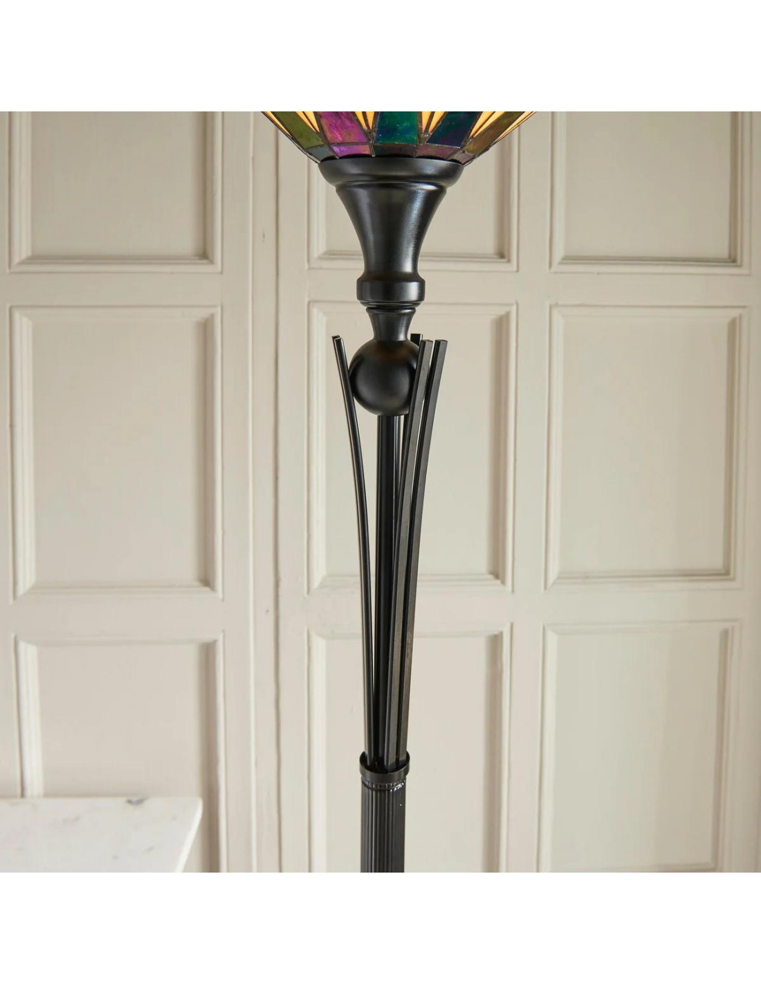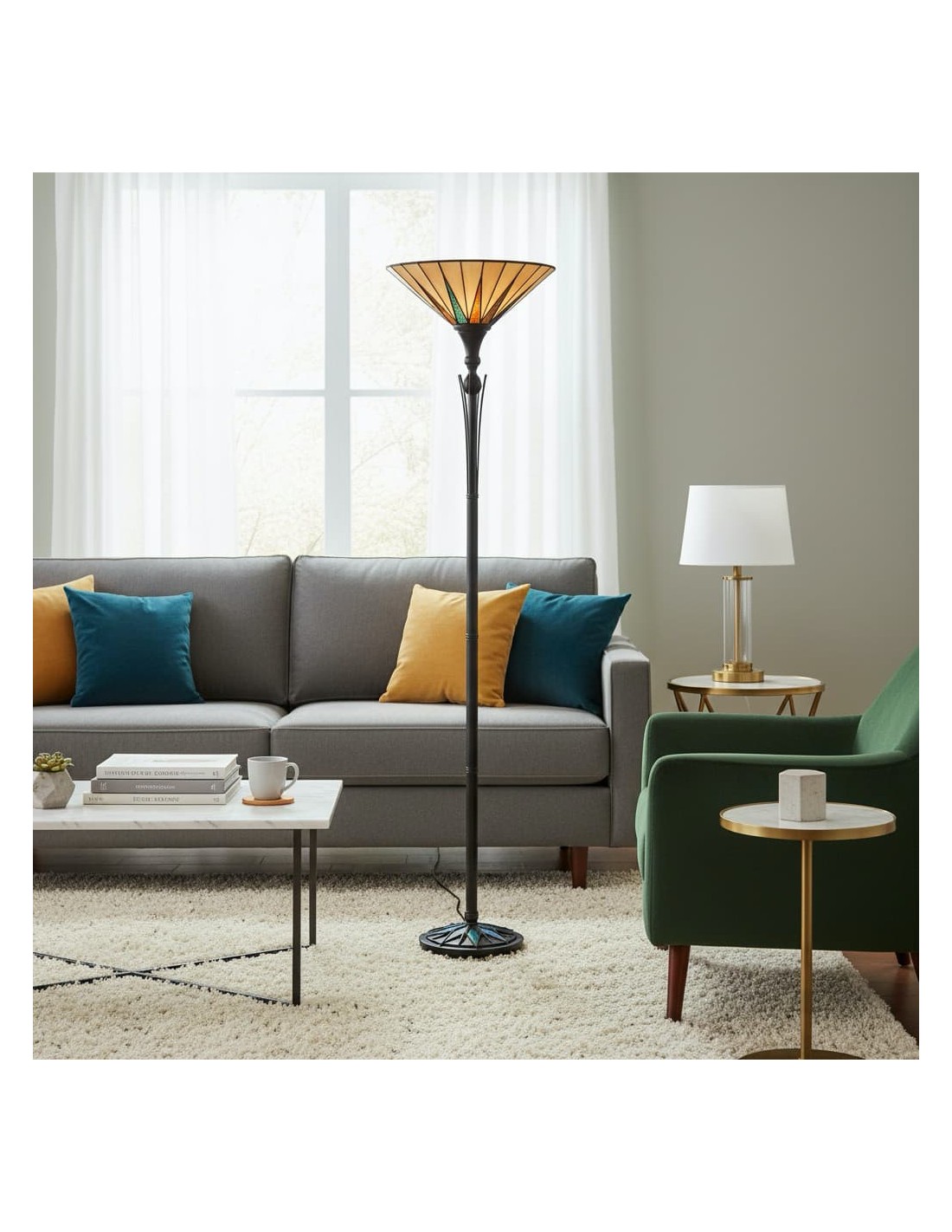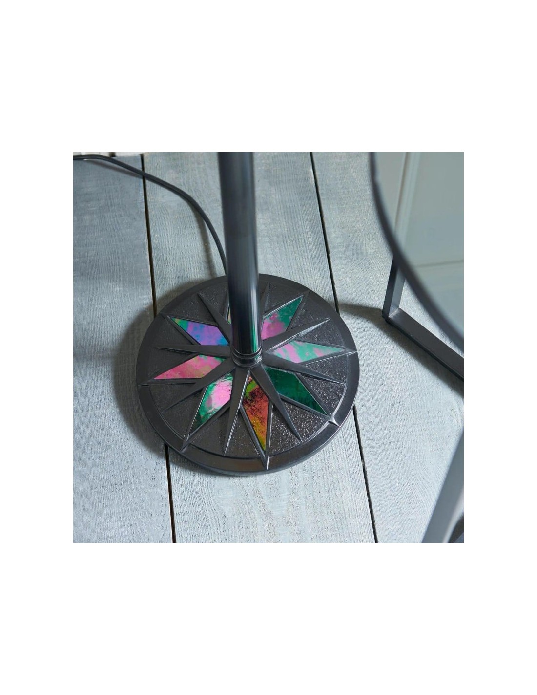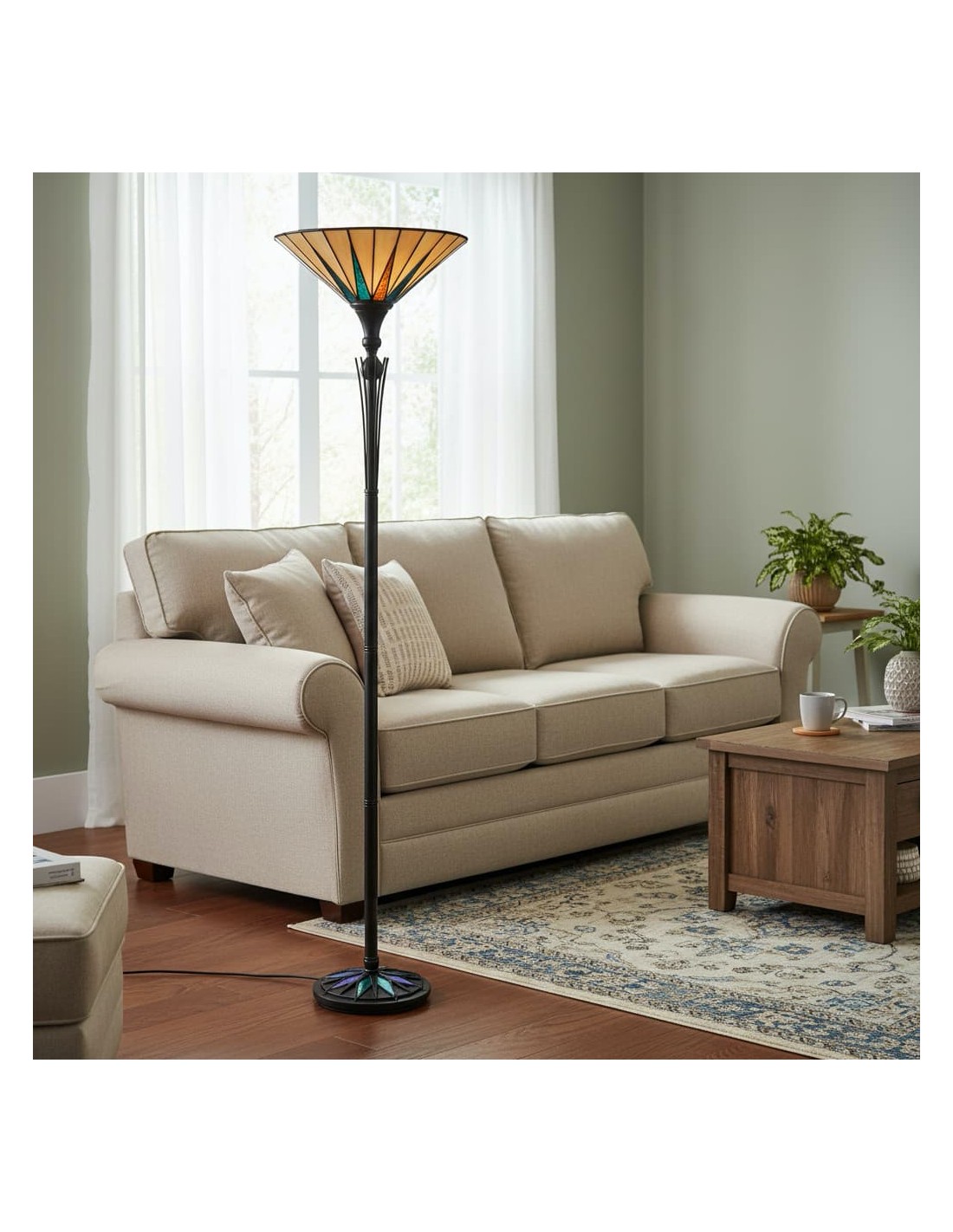 Deze op Tiffany geïnspireerde staande lamp heeft een opvallende, met sterren versierde glazen kap die een warme, sfeervolle gloed verspreidt. De handgemaakte glazen onderdelen en de klassieke art-deco stijl maken het een blikvanger in woonkamers, hallen en leeshoekjes, en geven elk interieur een tijdloze uitstraling.