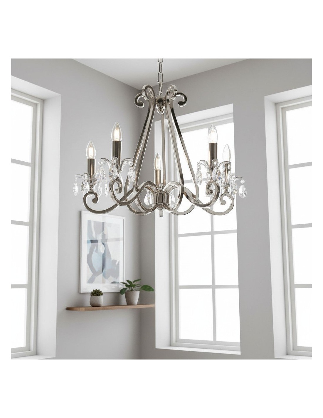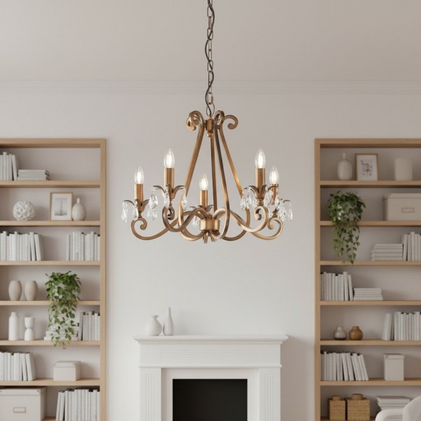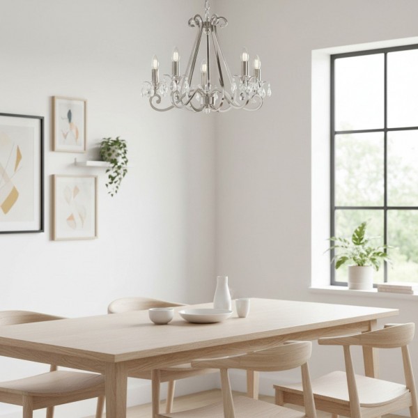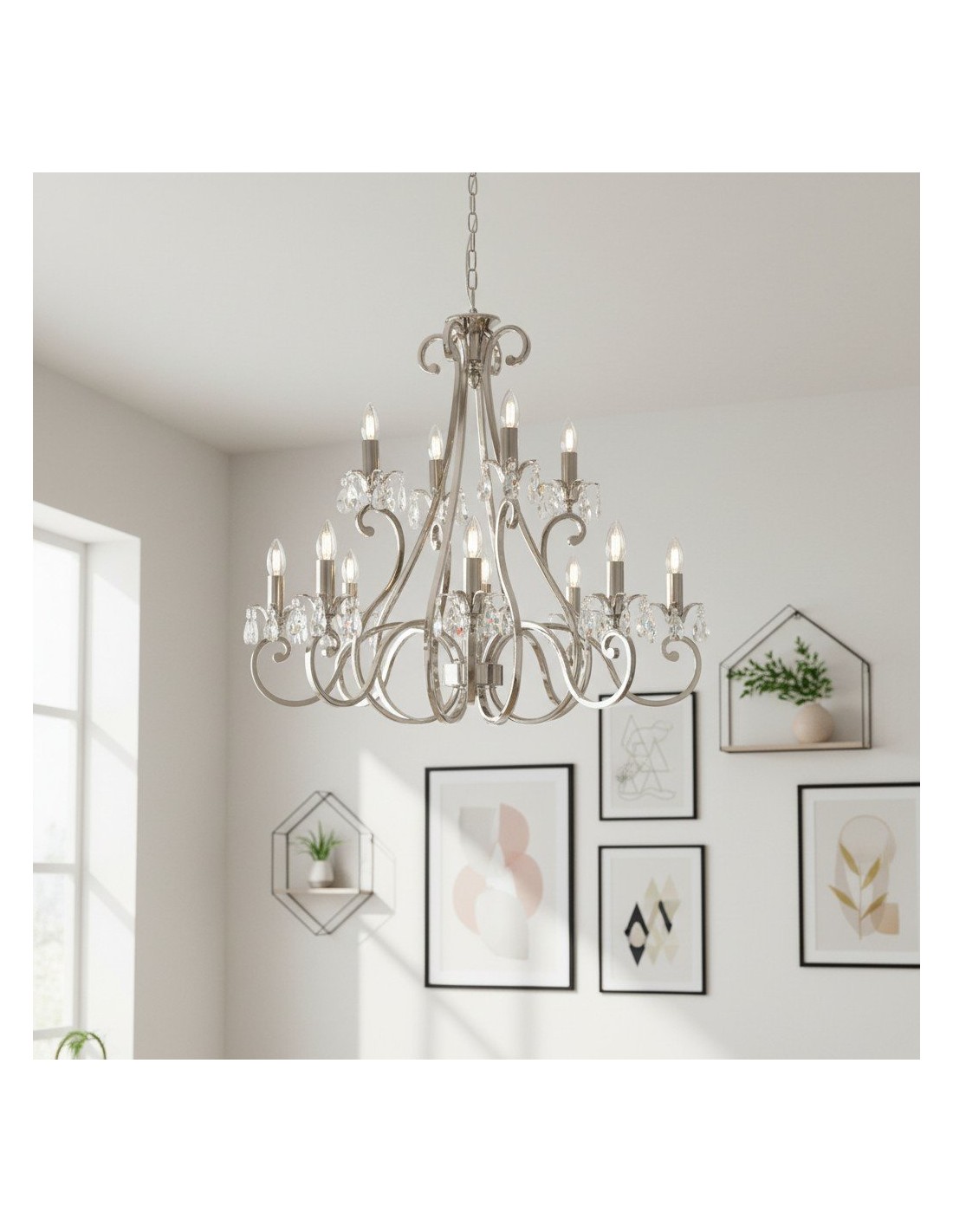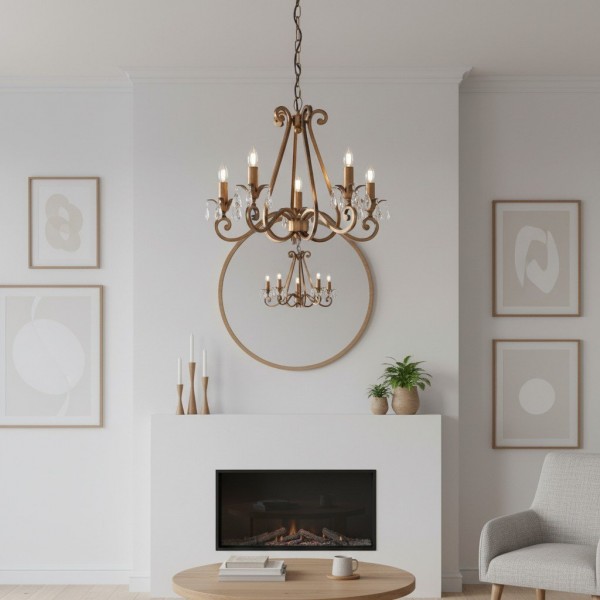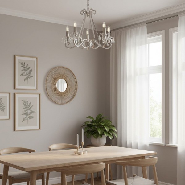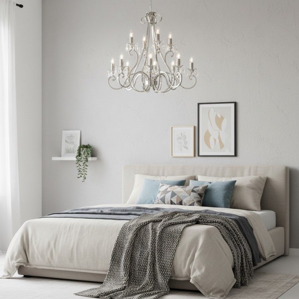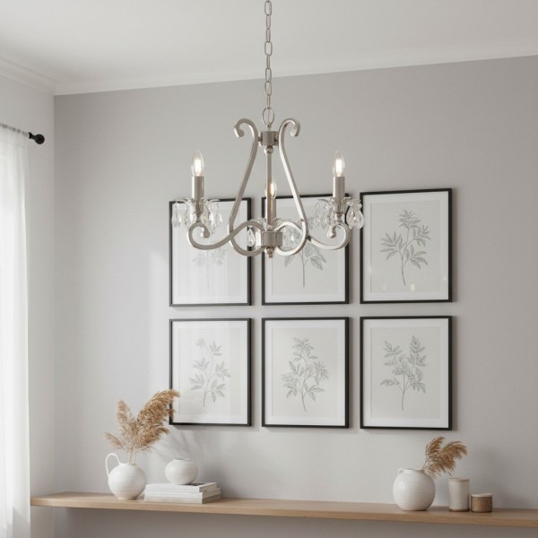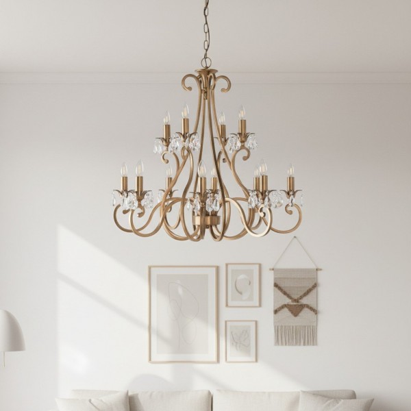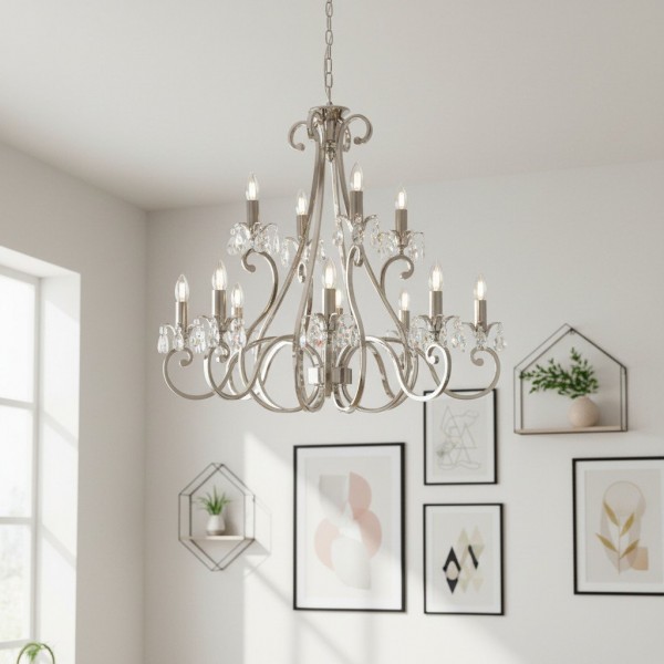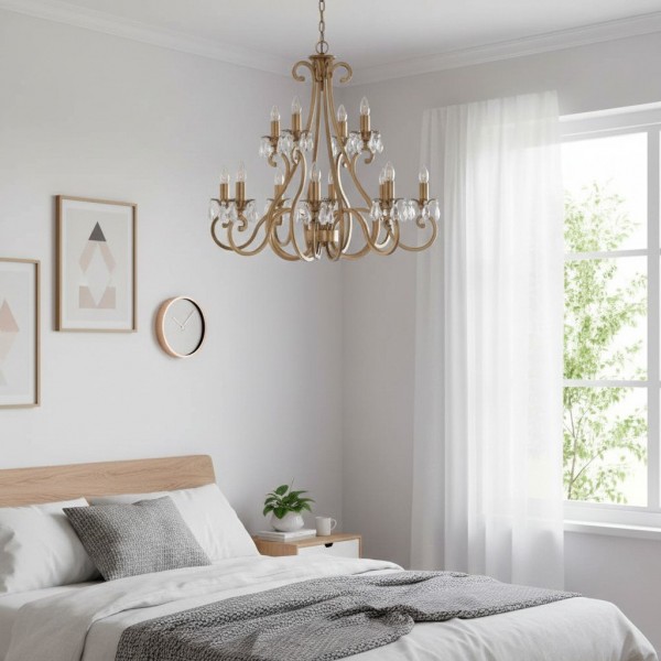Deze prachtige lamp heeft sierlijk gebogen armen, versierd met delicate kristallen druppels en kappen die bij elke reflectie fonkelen. De verstelbare ketting maakt veelzijdige installatie mogelijk in woonkamers, eetkamers of hoge hallen, en verspreidt een warme en uitnodigende gloed.