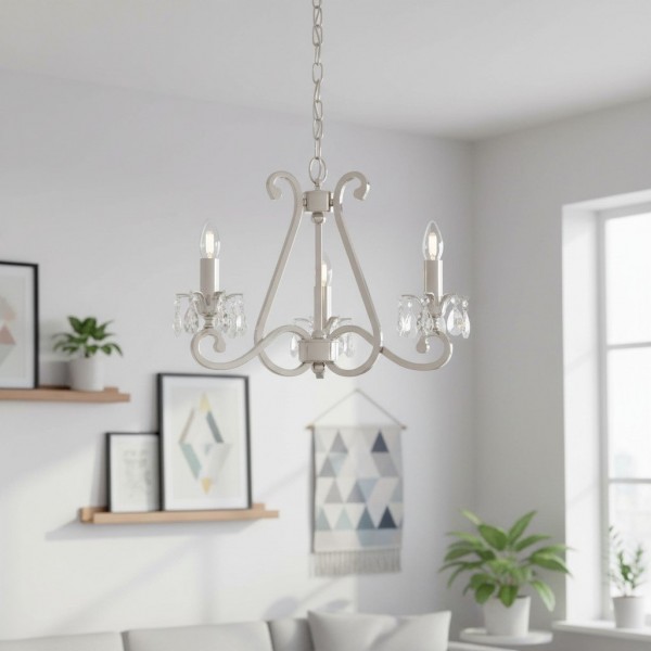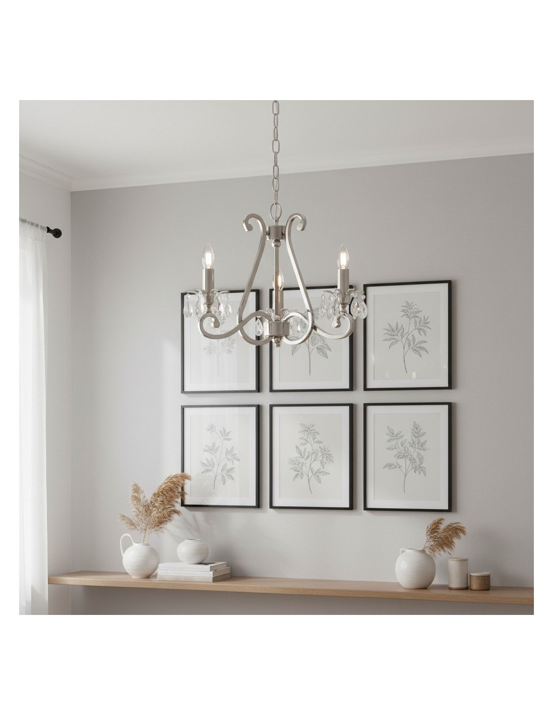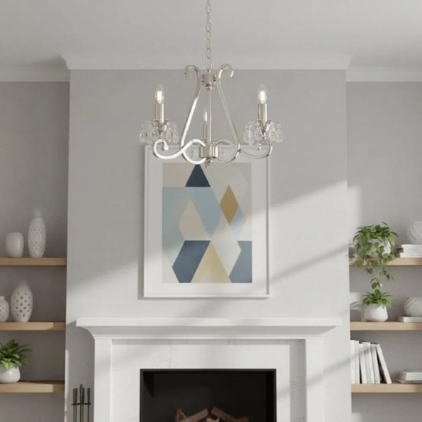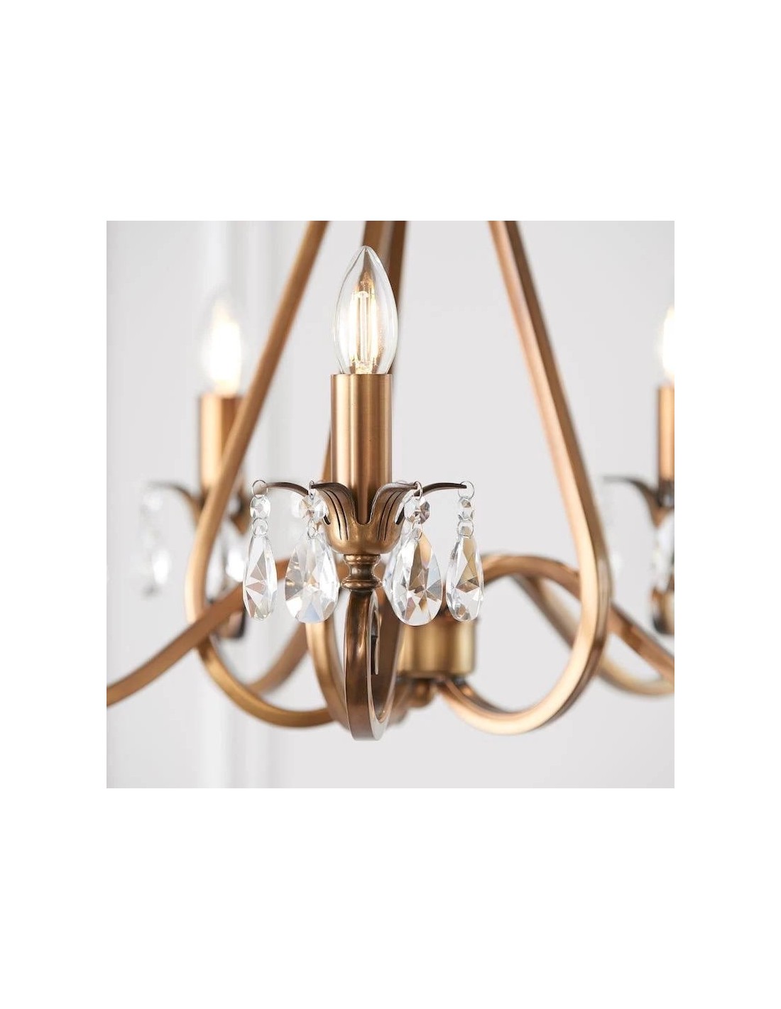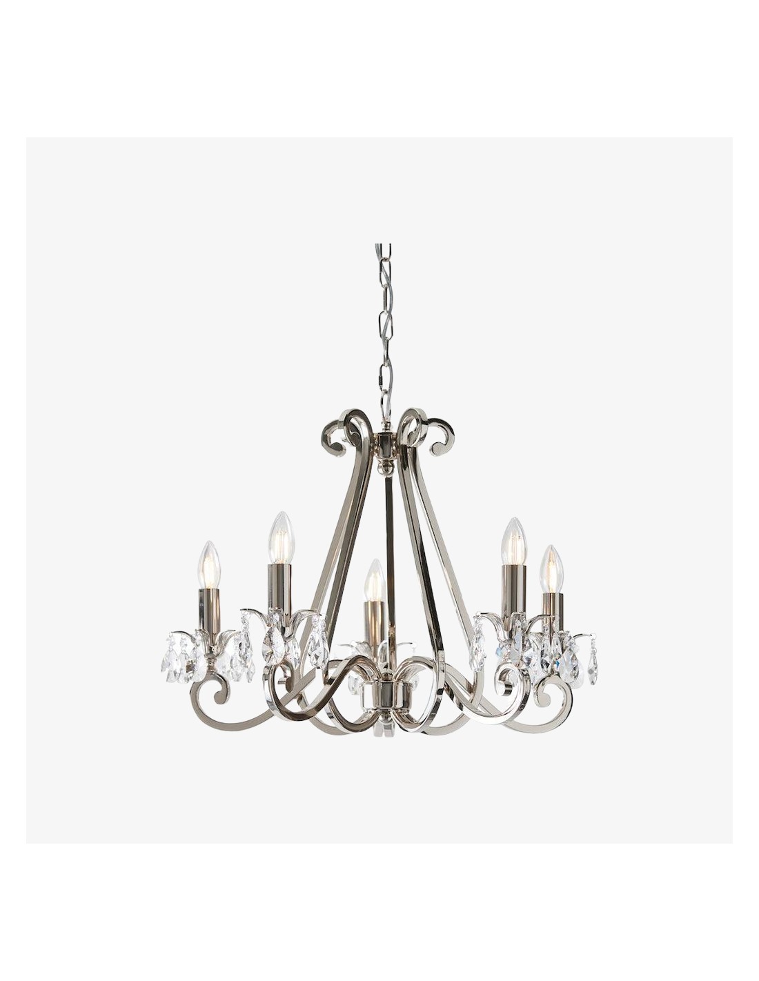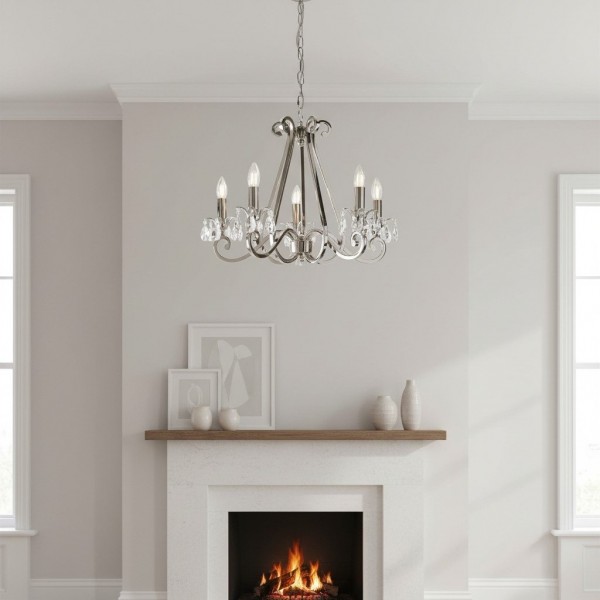 Deze prachtige lamp heeft sierlijk gebogen armen, versierd met delicate kristallen druppels en kappen die bij elke reflectie fonkelen. De verstelbare ketting maakt veelzijdige installatie mogelijk in woonkamers, eetkamers of hoge hallen, en verspreidt een warme en uitnodigende gloed.