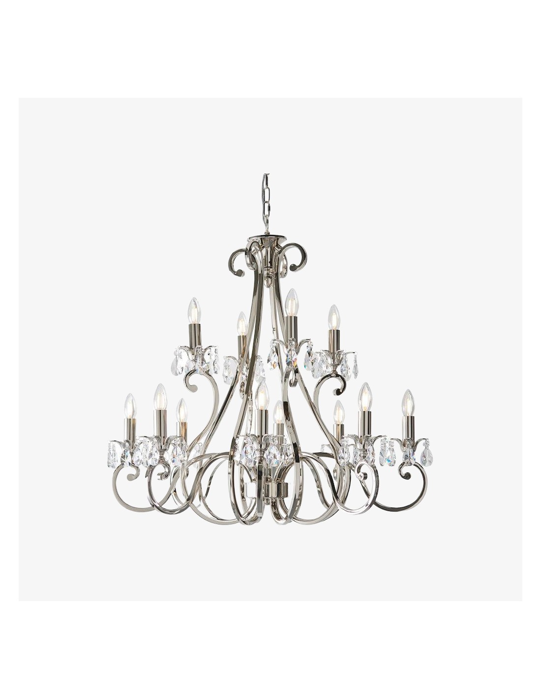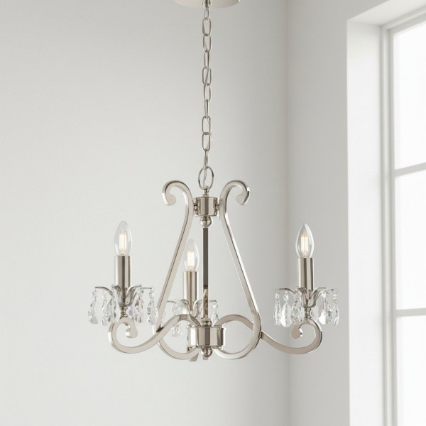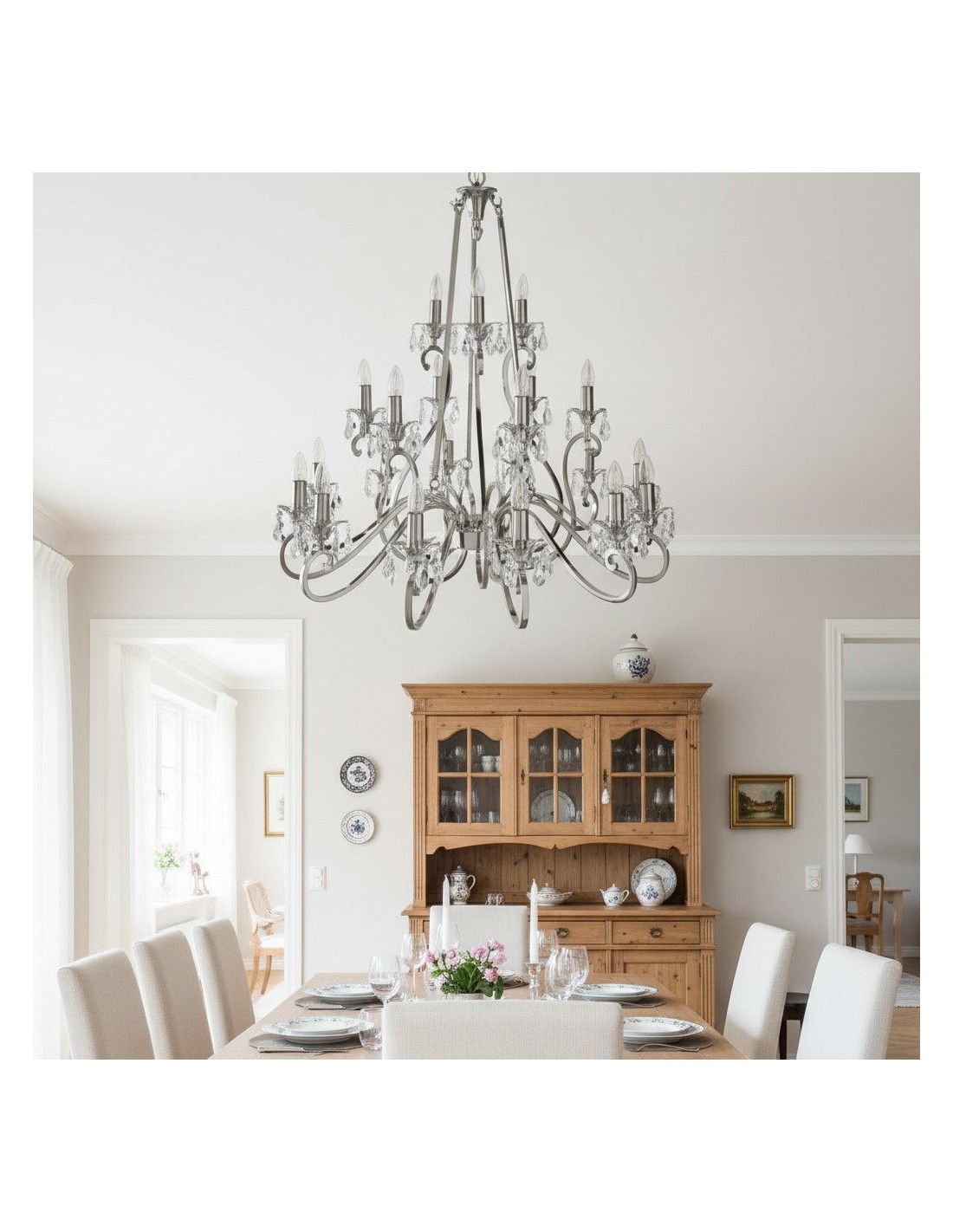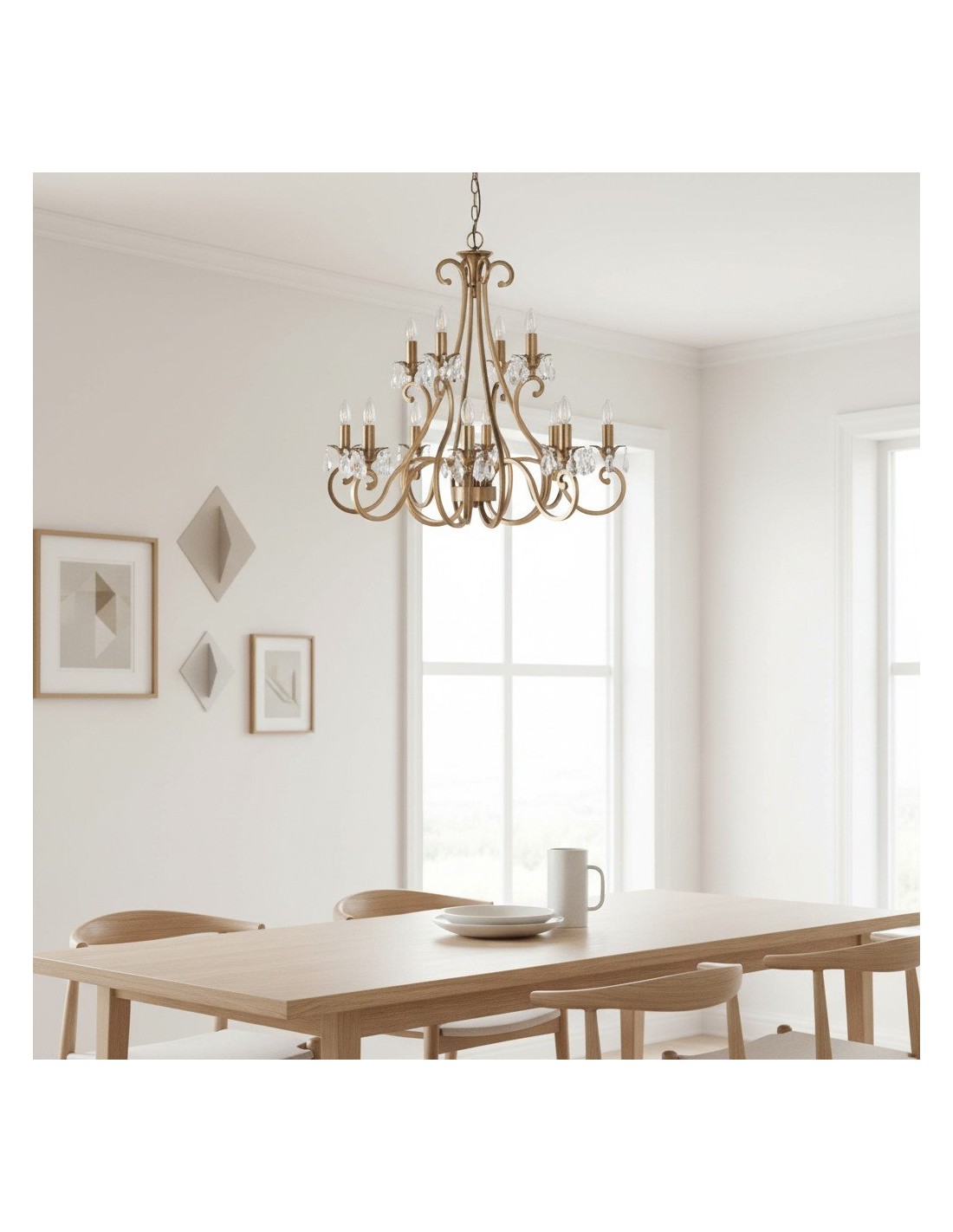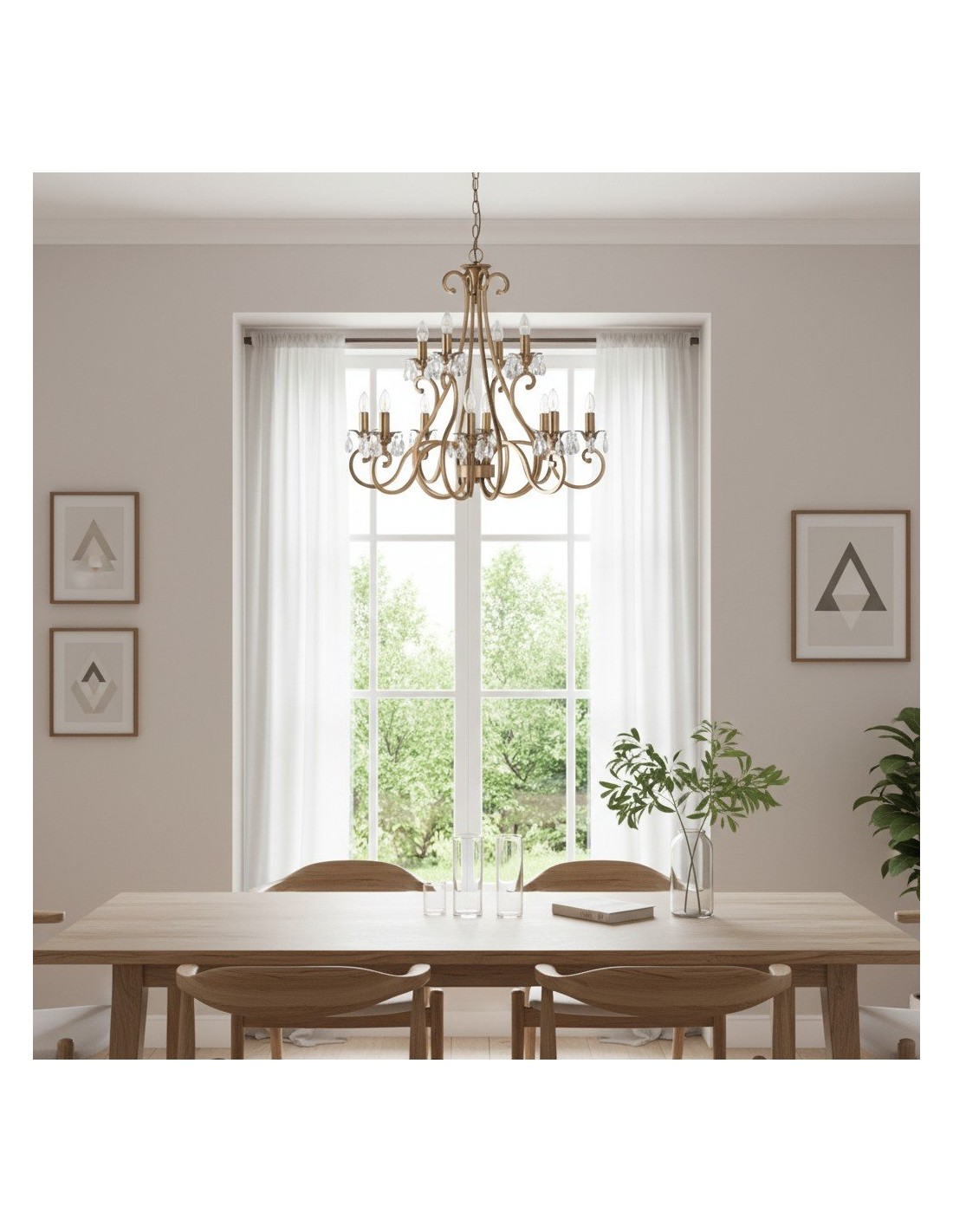 Deze prachtige lamp heeft sierlijk gebogen armen, versierd met delicate kristallen druppels en kappen die bij elke reflectie fonkelen. De verstelbare ketting maakt veelzijdige installatie mogelijk in woonkamers, eetkamers of hoge hallen, en verspreidt een warme en uitnodigende gloed.