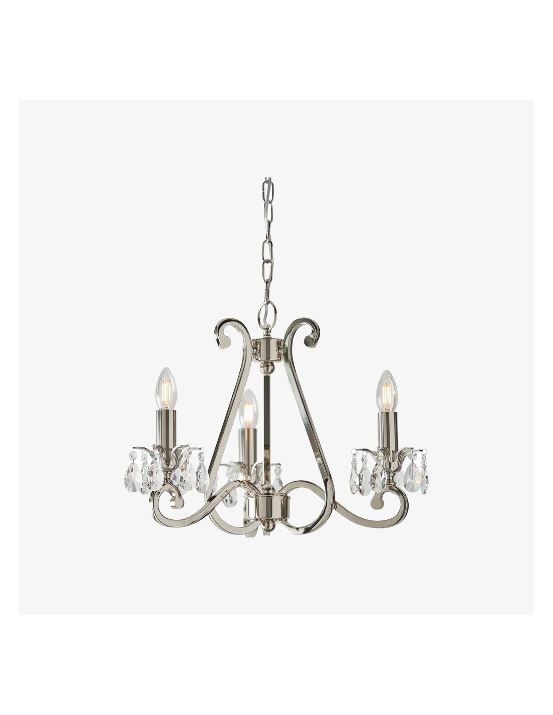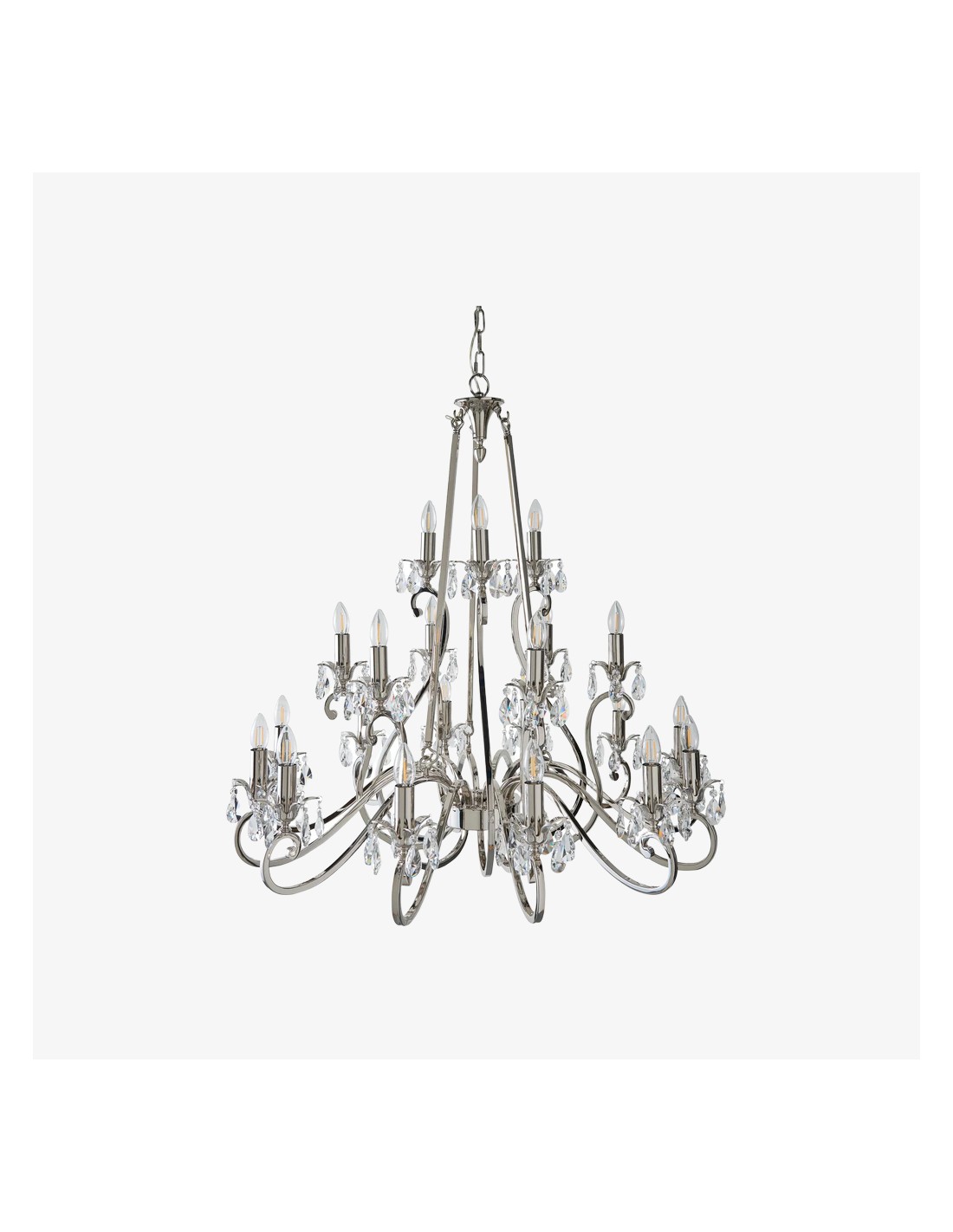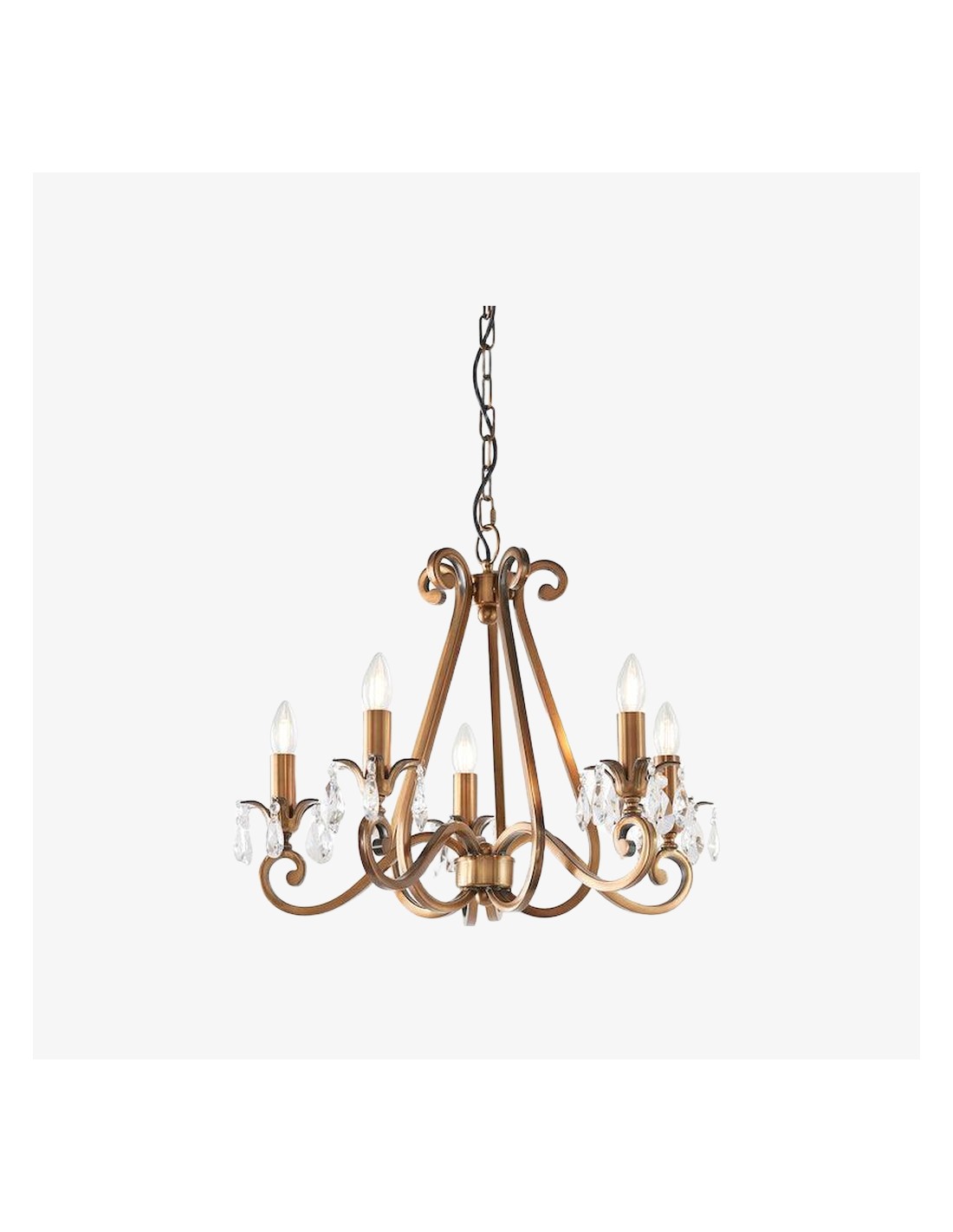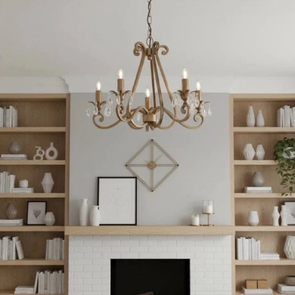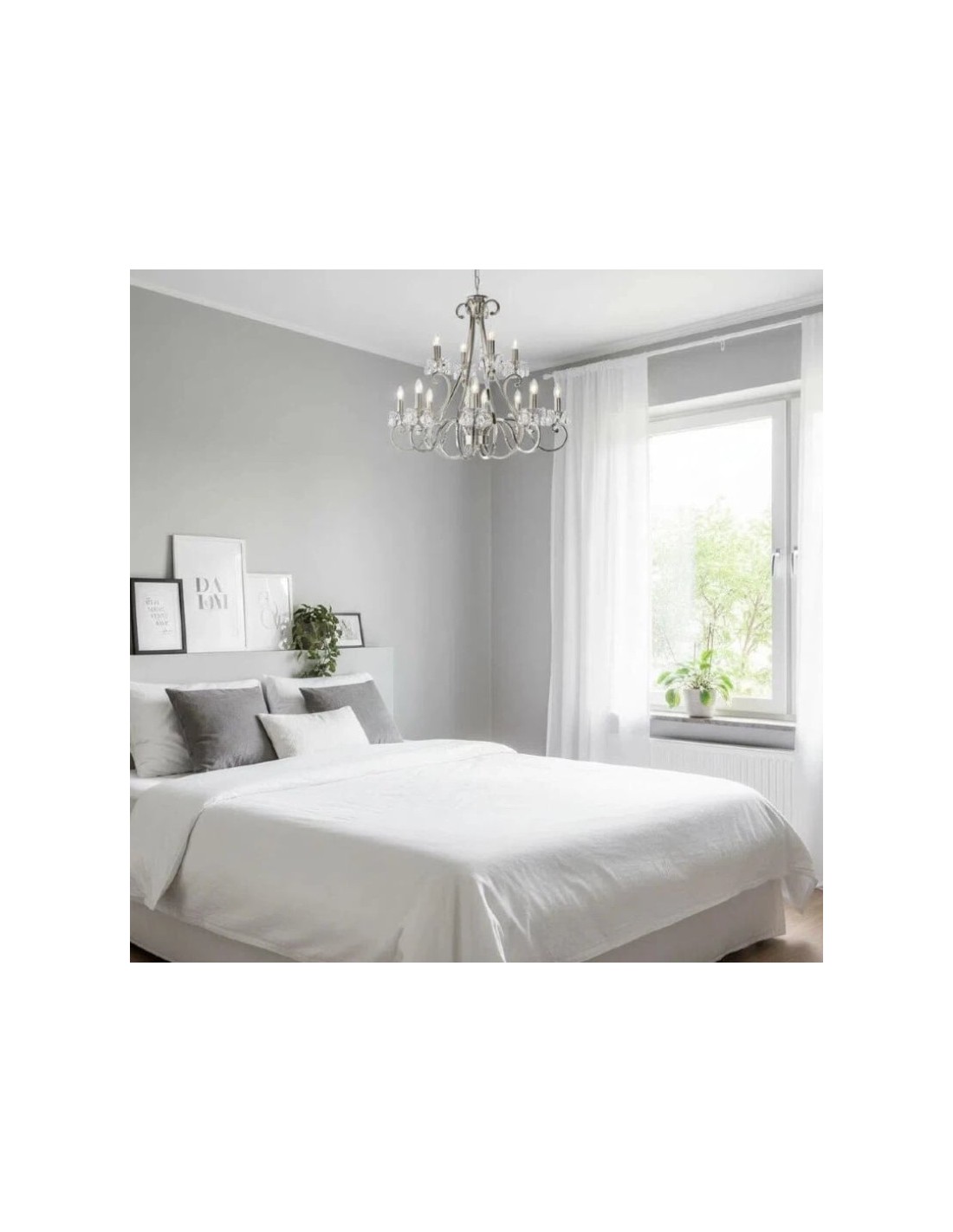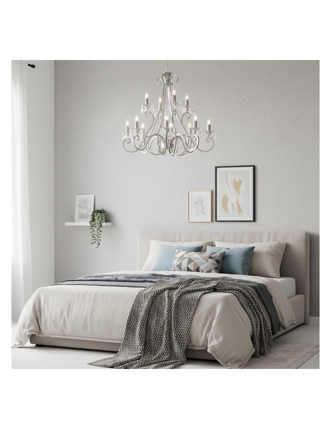 Deze prachtige lamp heeft sierlijk gebogen armen, versierd met delicate kristallen druppels en kappen die bij elke reflectie fonkelen. De verstelbare ketting maakt veelzijdige installatie mogelijk in woonkamers, eetkamers of hoge hallen, en verspreidt een warme en uitnodigende gloed.