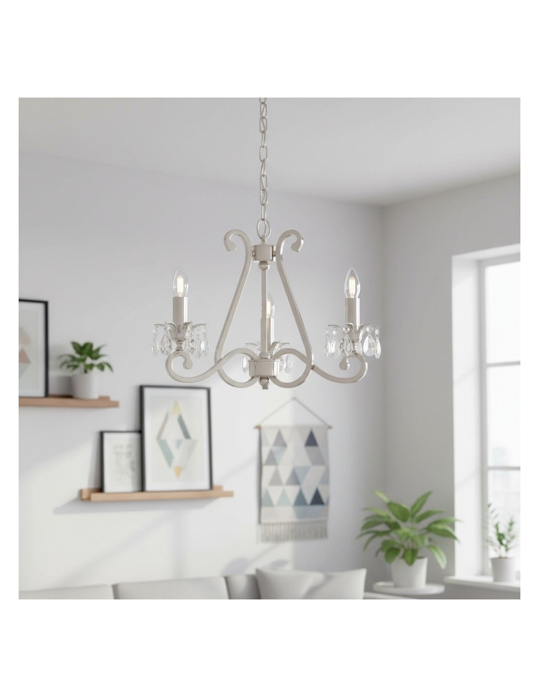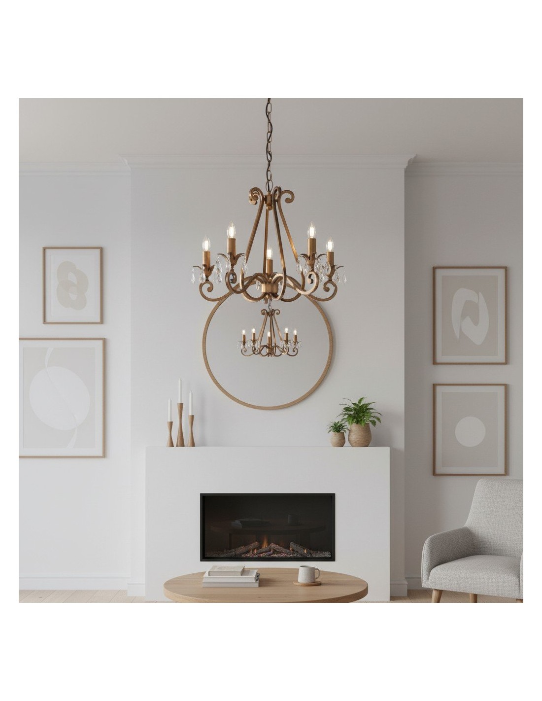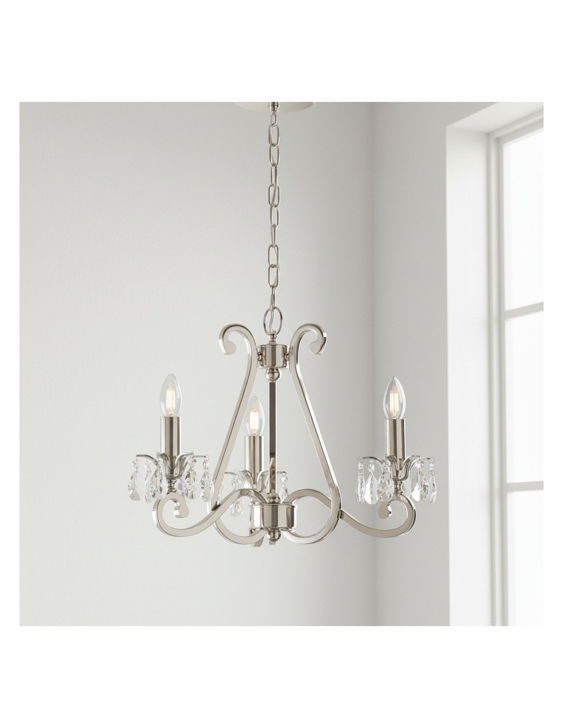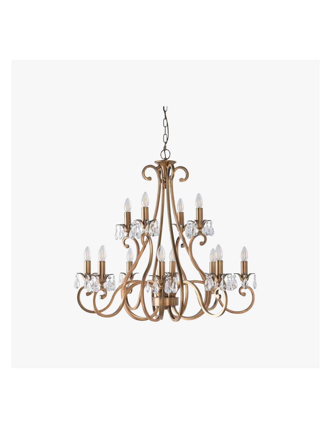 Deze prachtige lamp heeft sierlijk gebogen armen, versierd met delicate kristallen druppels en kappen die bij elke reflectie fonkelen. De verstelbare ketting maakt veelzijdige installatie mogelijk in woonkamers, eetkamers of hoge hallen, en verspreidt een warme en uitnodigende gloed.