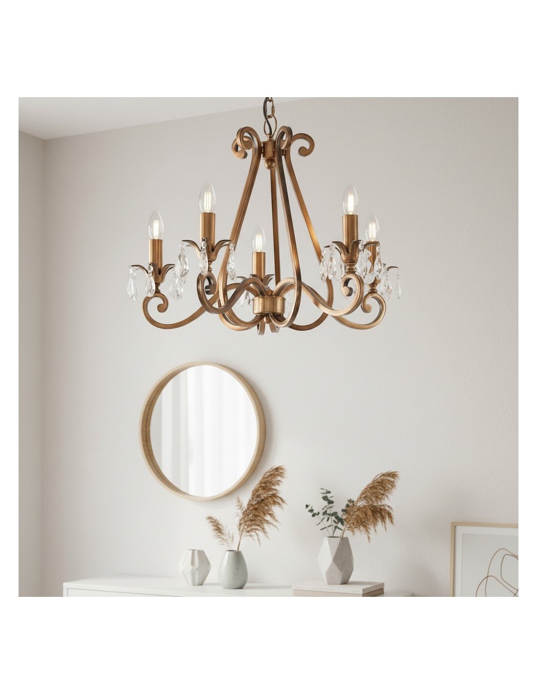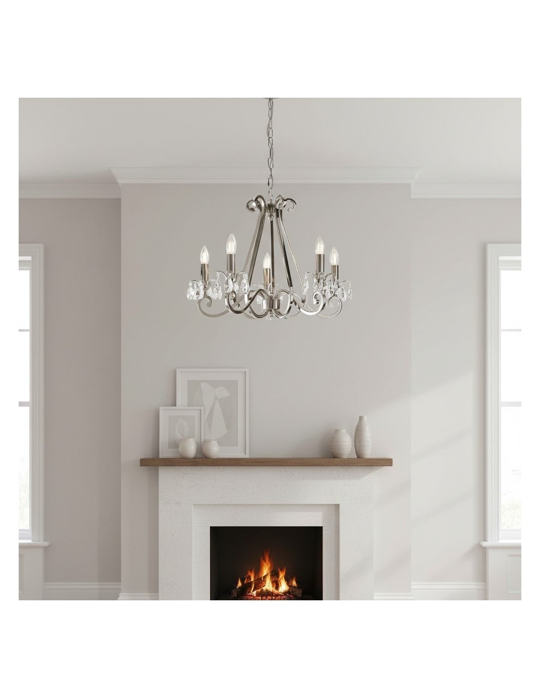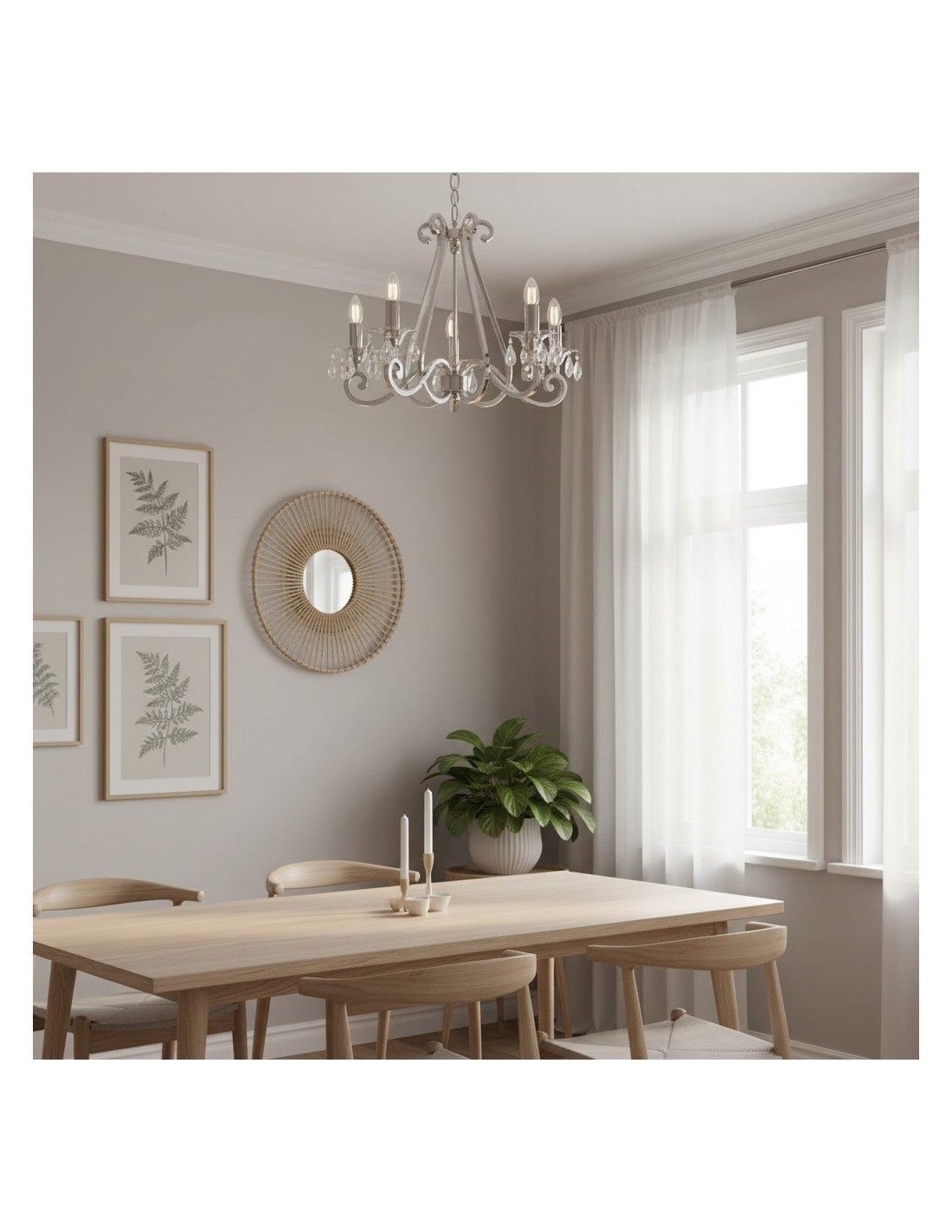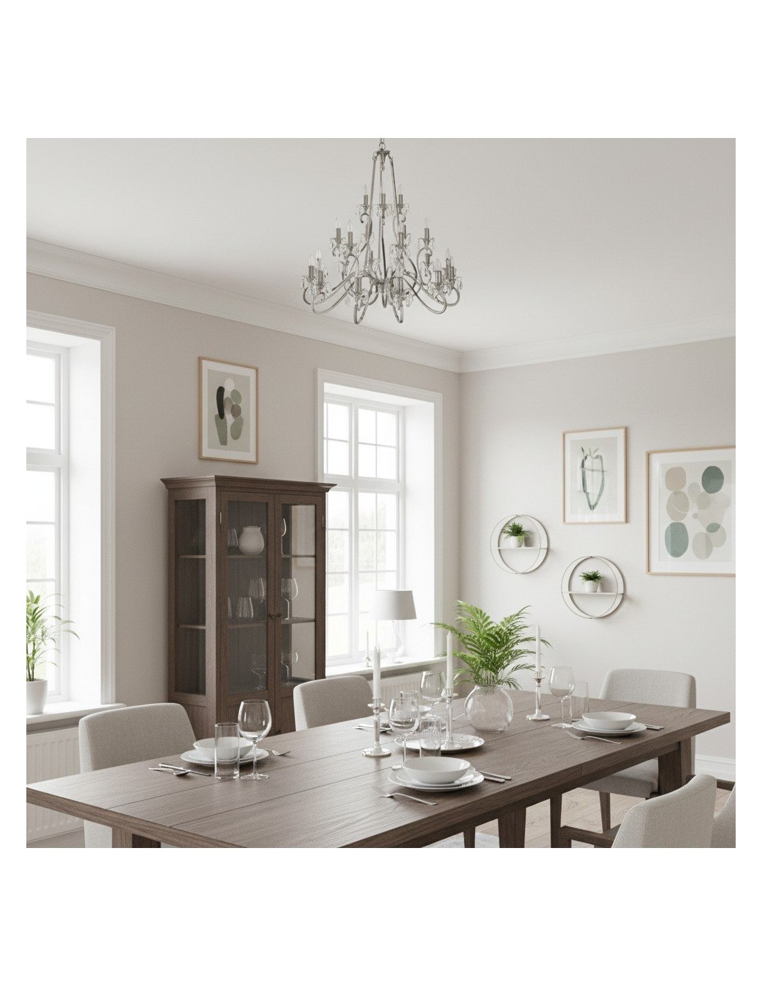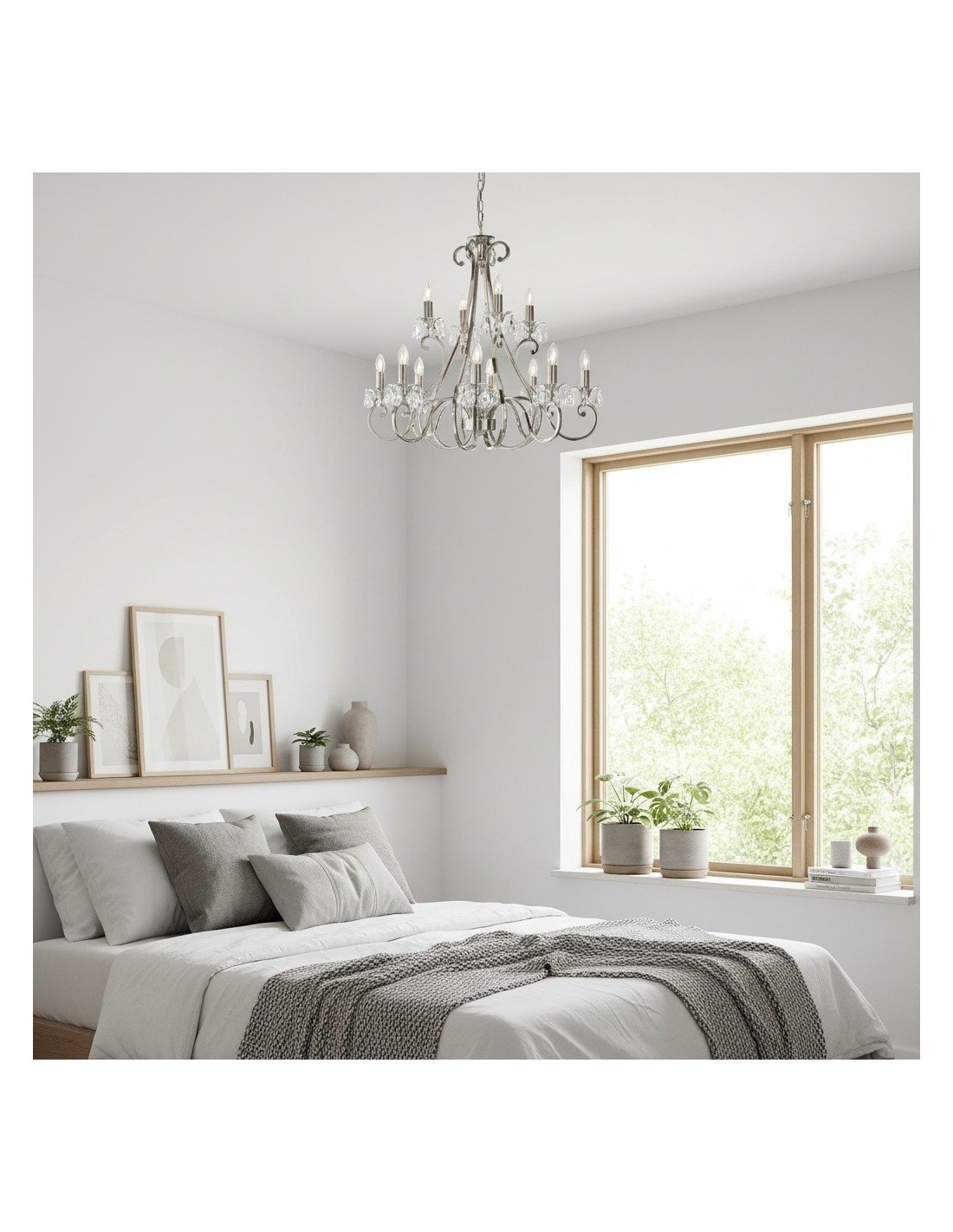 Deze prachtige lamp heeft sierlijk gebogen armen, versierd met delicate kristallen druppels en kappen die bij elke reflectie fonkelen. De verstelbare ketting maakt veelzijdige installatie mogelijk in woonkamers, eetkamers of hoge hallen, en verspreidt een warme en uitnodigende gloed.