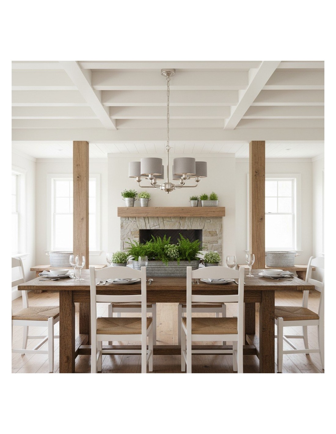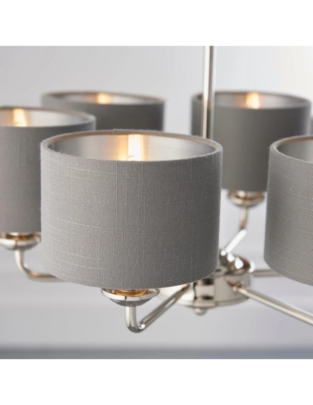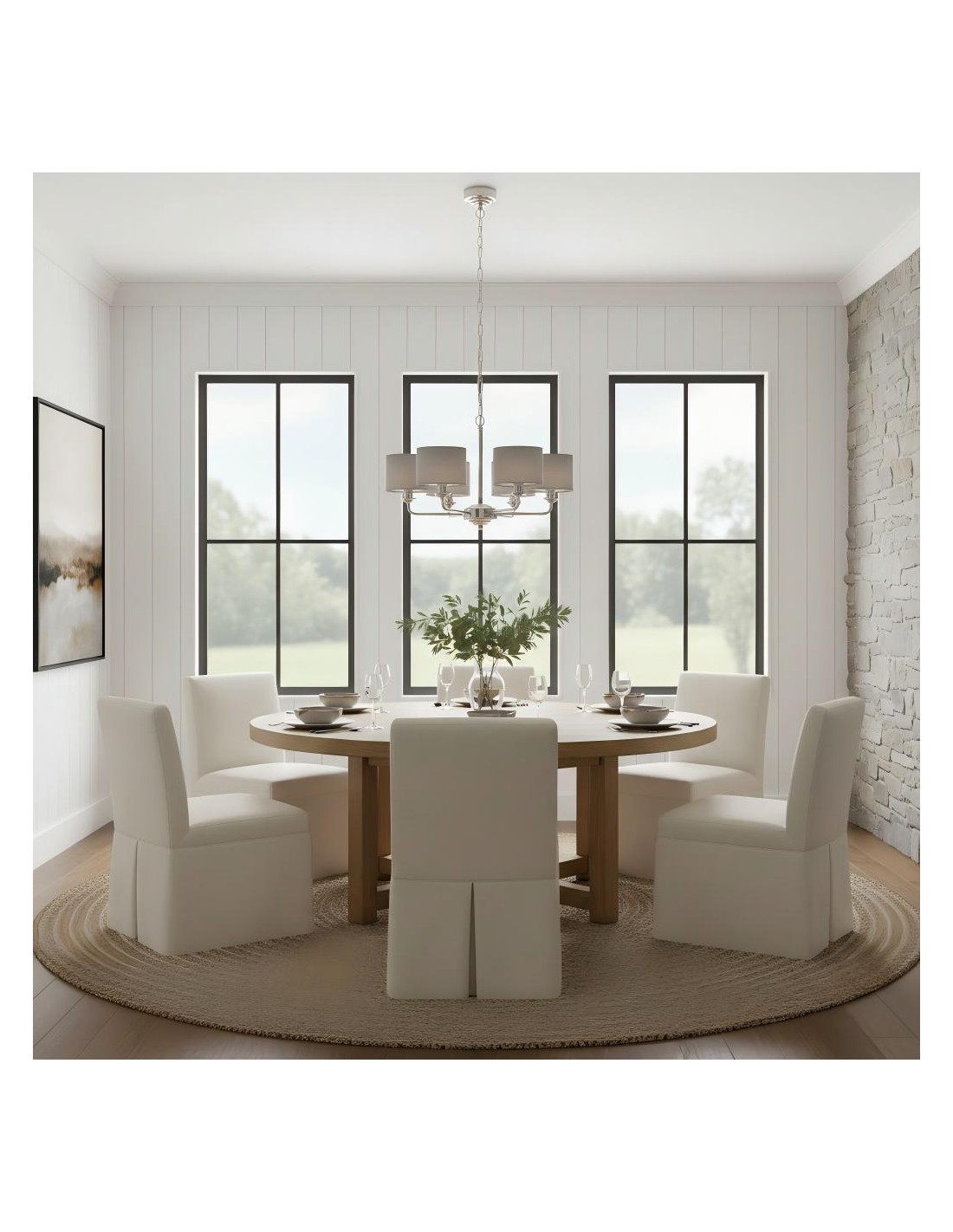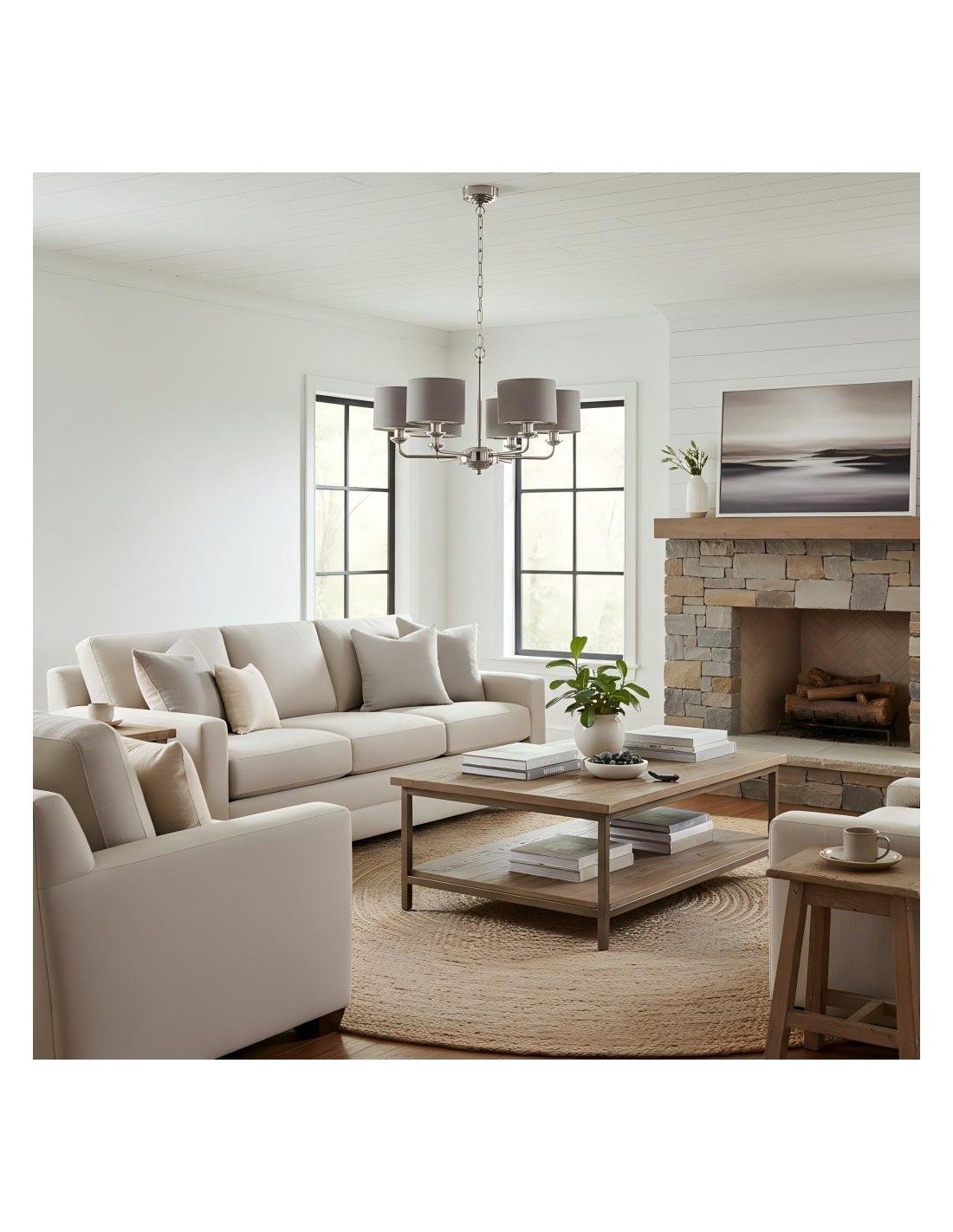 Deze kroonluchter combineert een moderne, klassieke esthetiek met een verfijnd silhouet met meerdere armen, waardoor een zachte en evenwichtige gloed ontstaat door de stoffen kappen. Ontworpen als een opvallende kroonluchter, is hij geschikt voor eetkamers, woonkamers en restaurants, en voegt hij een stijlvolle en tijdloze uitstraling toe aan elk interieur.
