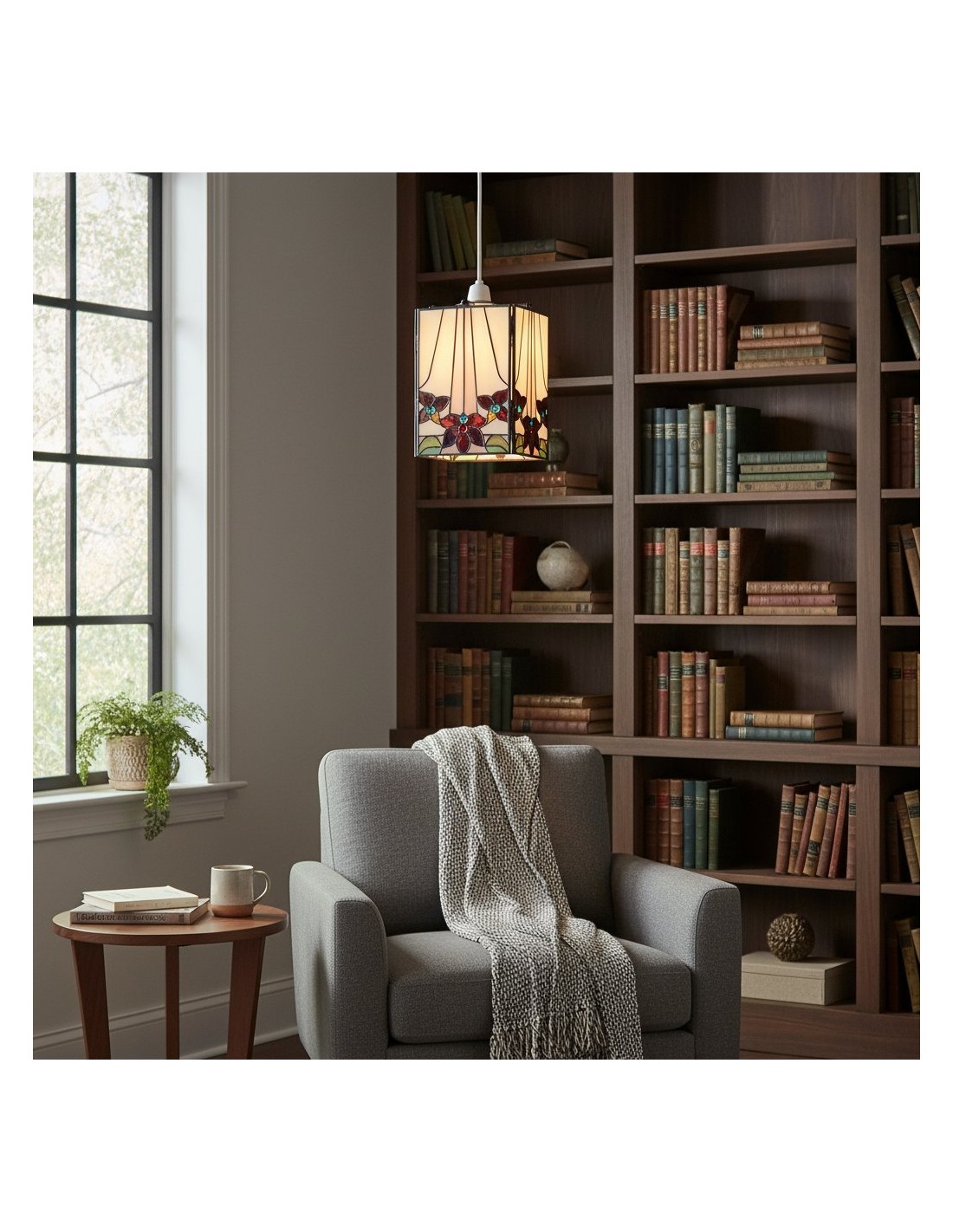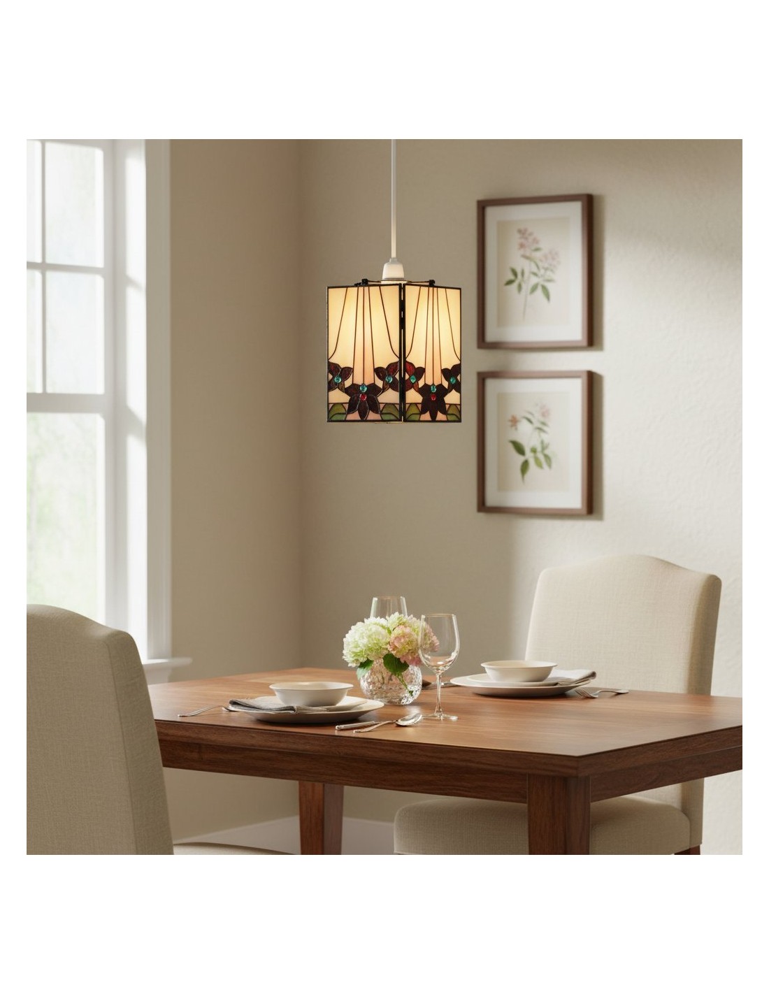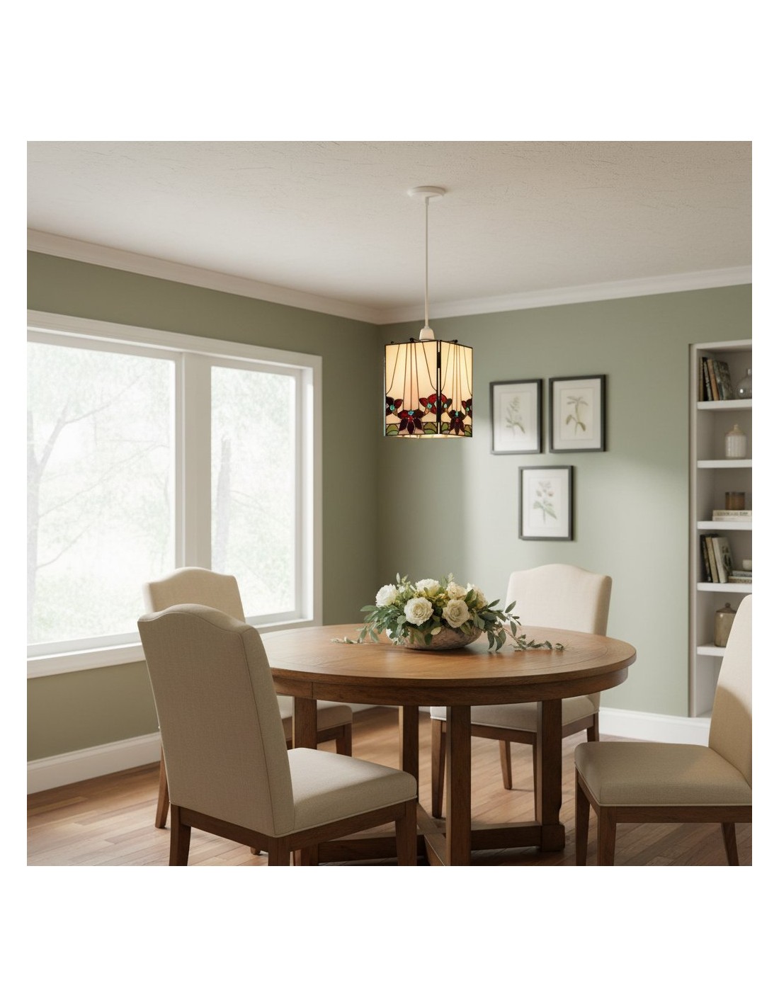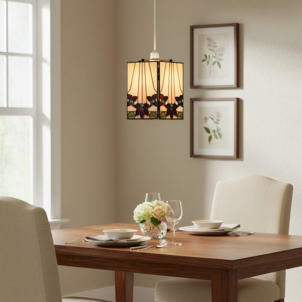 Deze lampenkap, met zijn vierkante lantaarnvorm en delicate, bloemrijke glazen randen, belichaamt perfect de tijdloze charme van Tiffany-design en creëert een warme en comfortabele sfeer. Het is een veelzijdig decoratief element voor de eetkamer, woonkamer of een knusse hoek.