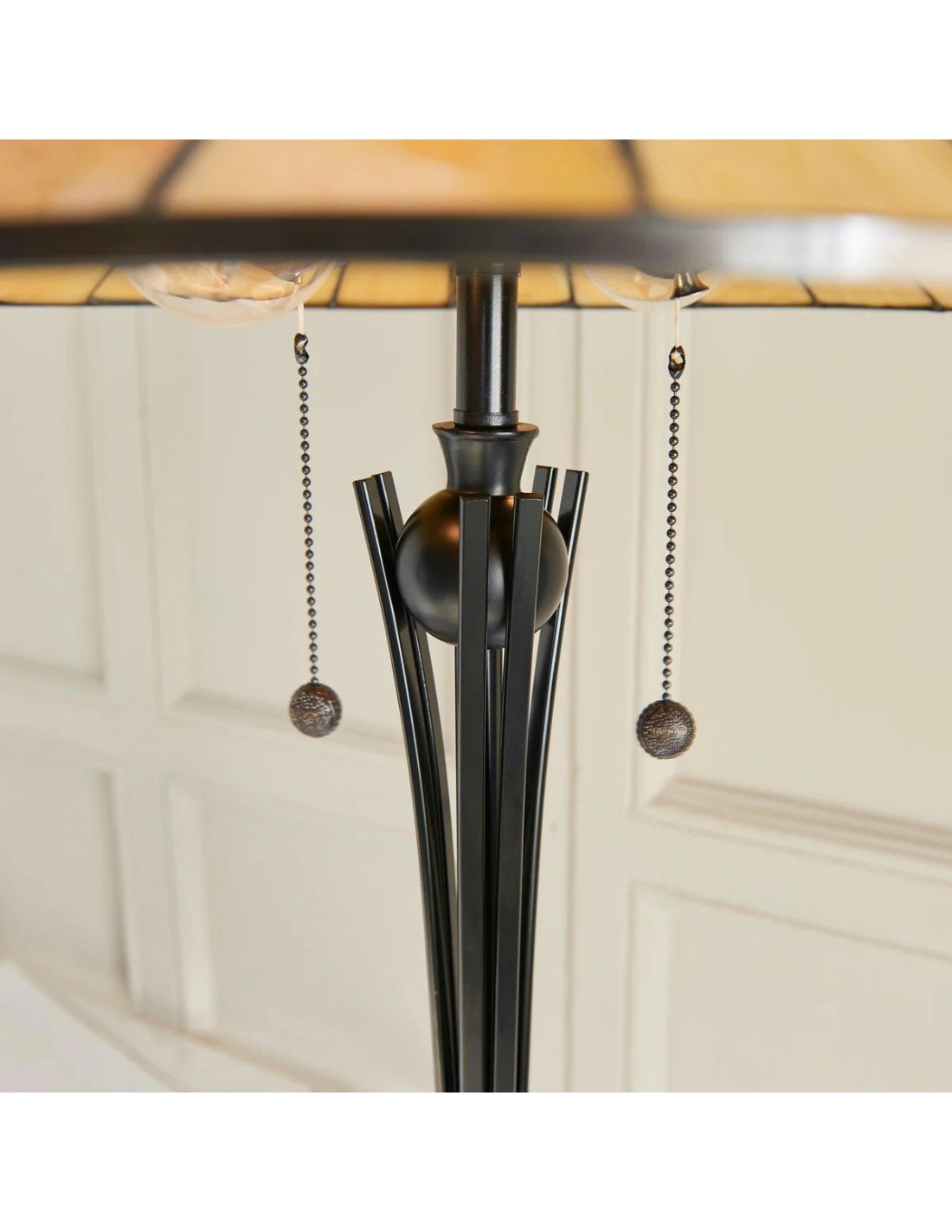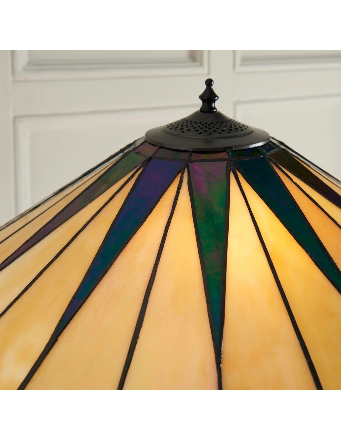 Geïnspireerd door klassieke glas-in-loodkunst, heeft deze lamp een geometrische kap met sterrenpatroon die diepte en zacht, sfeervol licht in elke ruimte brengt. De combinatie van een fraai vormgegeven glazen kap en een verfijnde metalen structuur creëert een tijdloze blikvanger voor woonkamers, slaapkamers of leeshoekjes.