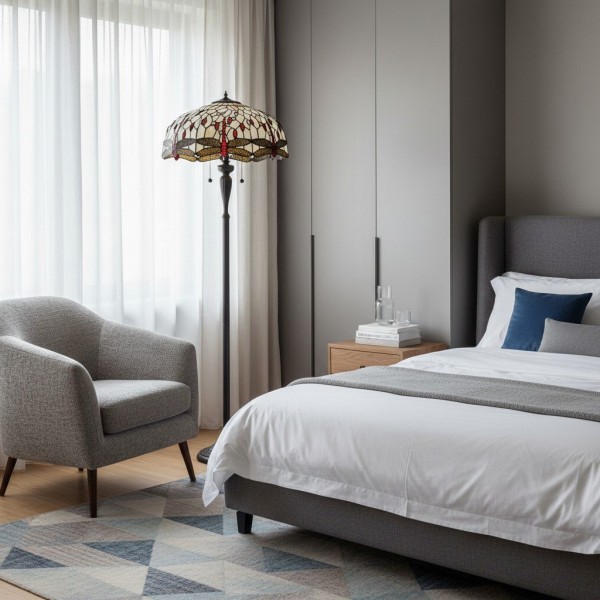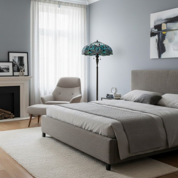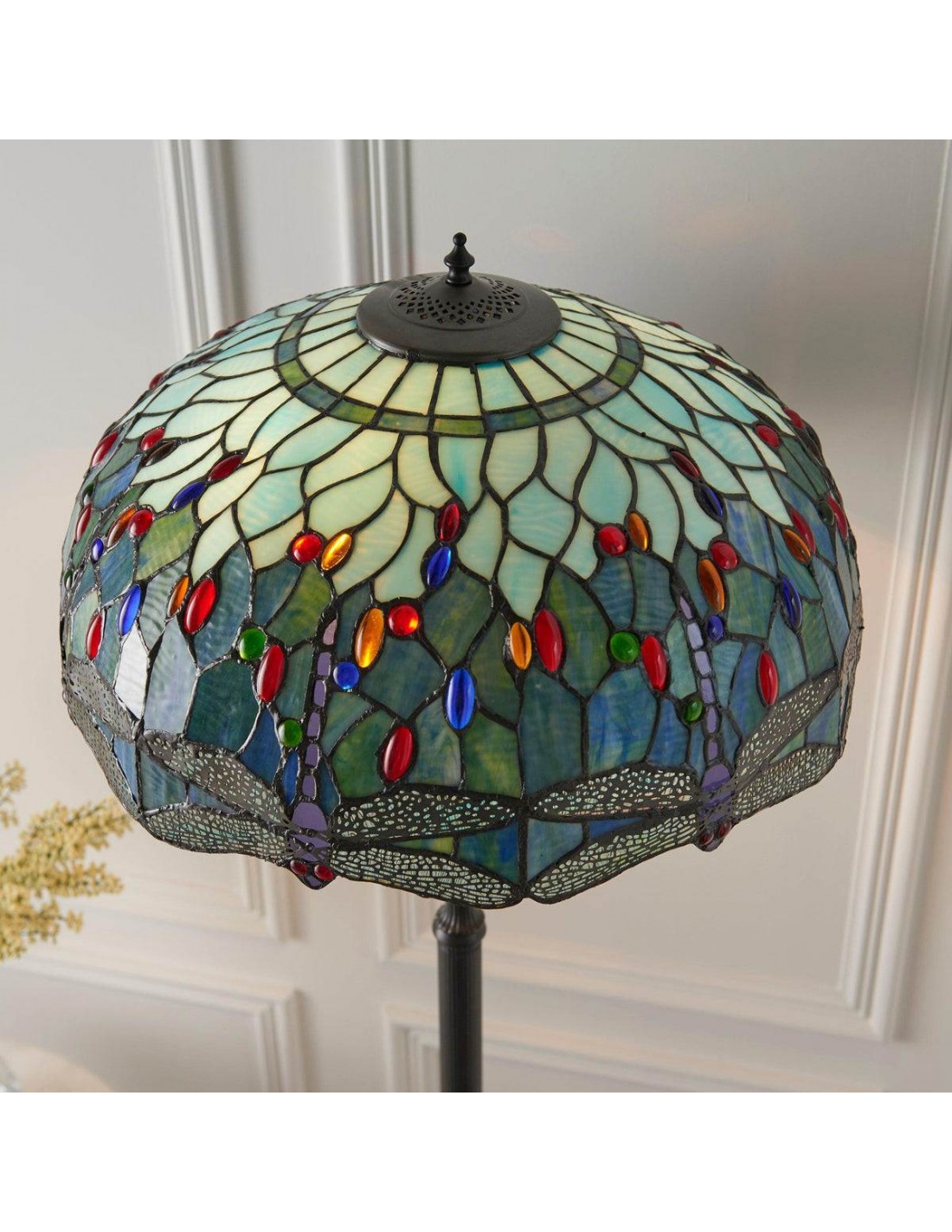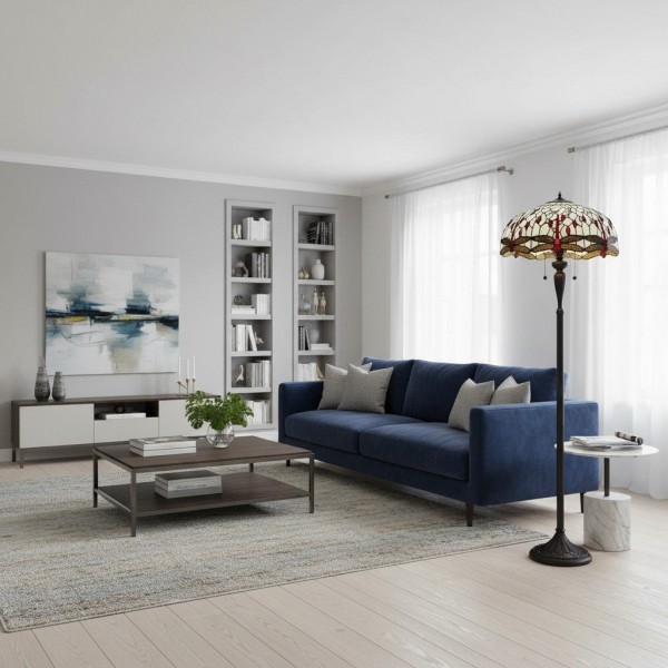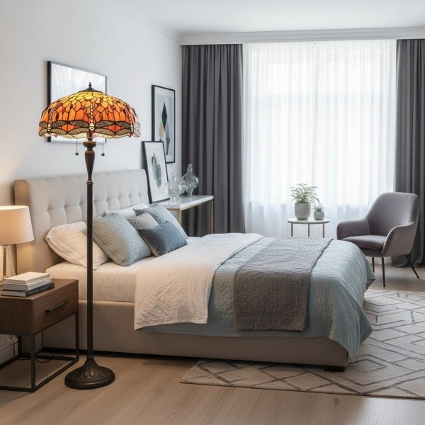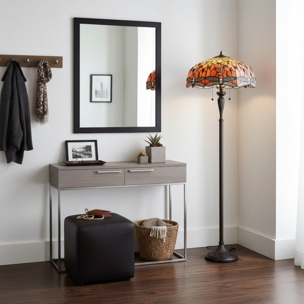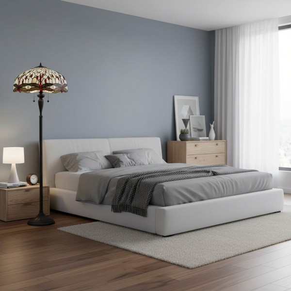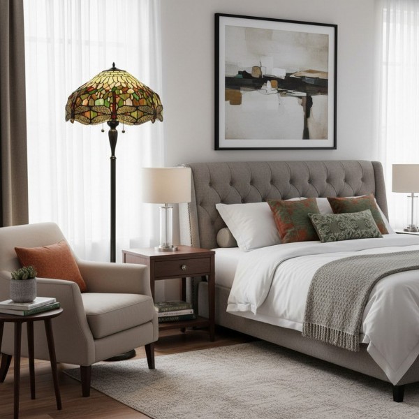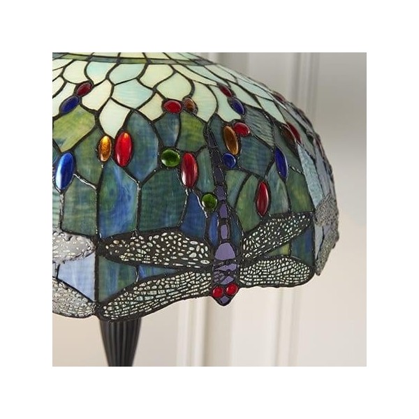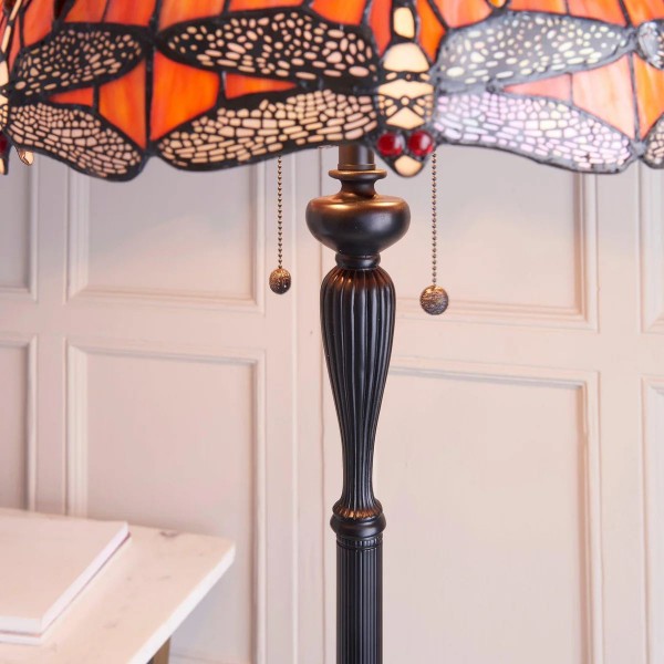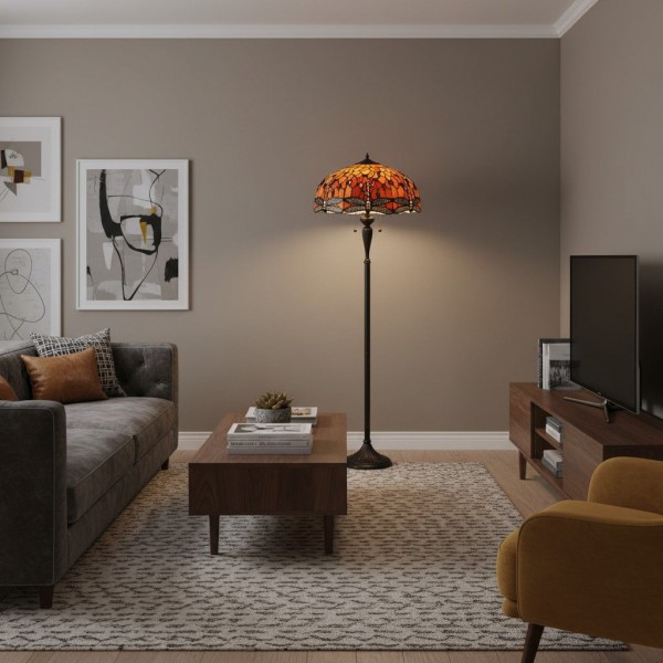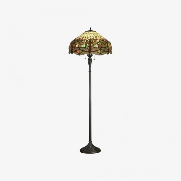 TF Dragonfly vloerlamp met een handgemaakte kap van glas-in-loodmozaïek met libellenmotieven en panelen in juweelkleuren. Perfect voor woonkamers, leeshoekjes en slaapkamers om te zorgen voor warm, decoratief sfeerlicht.