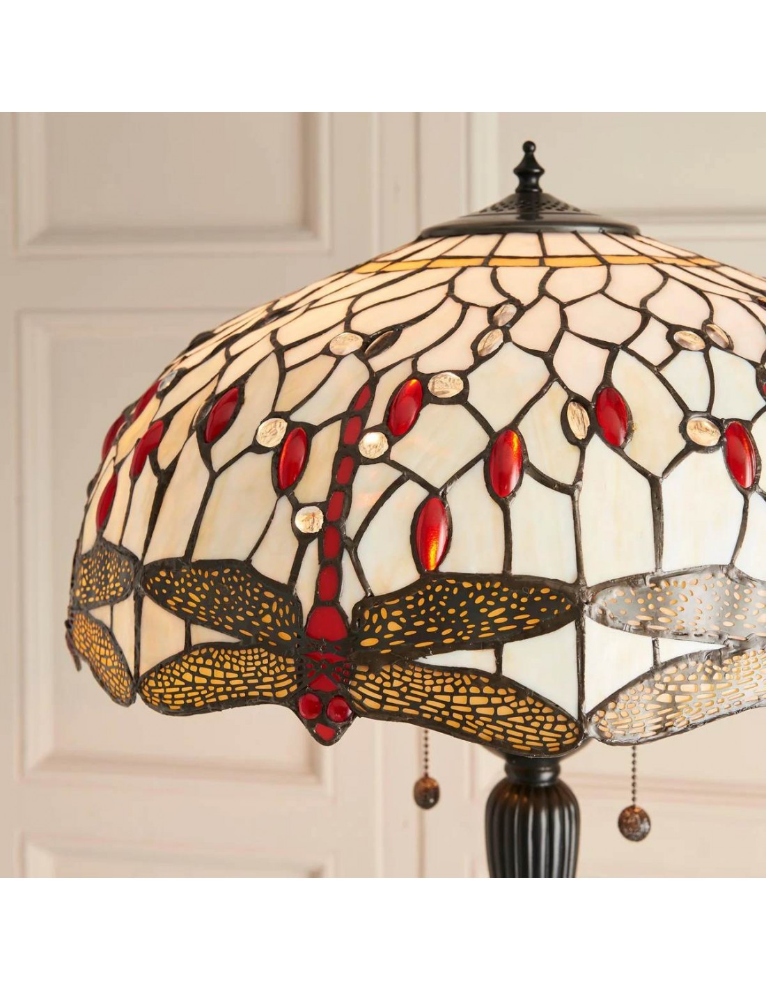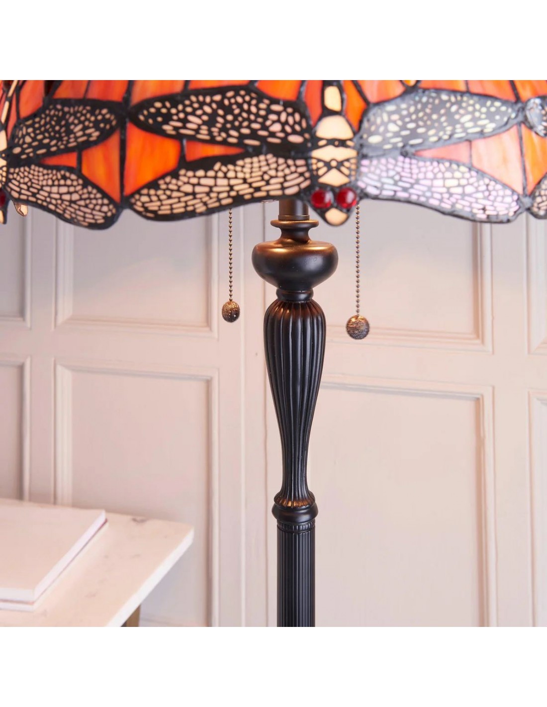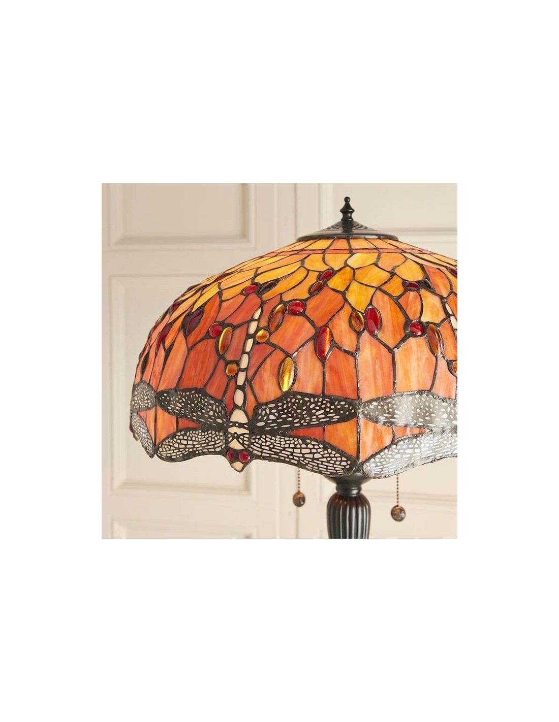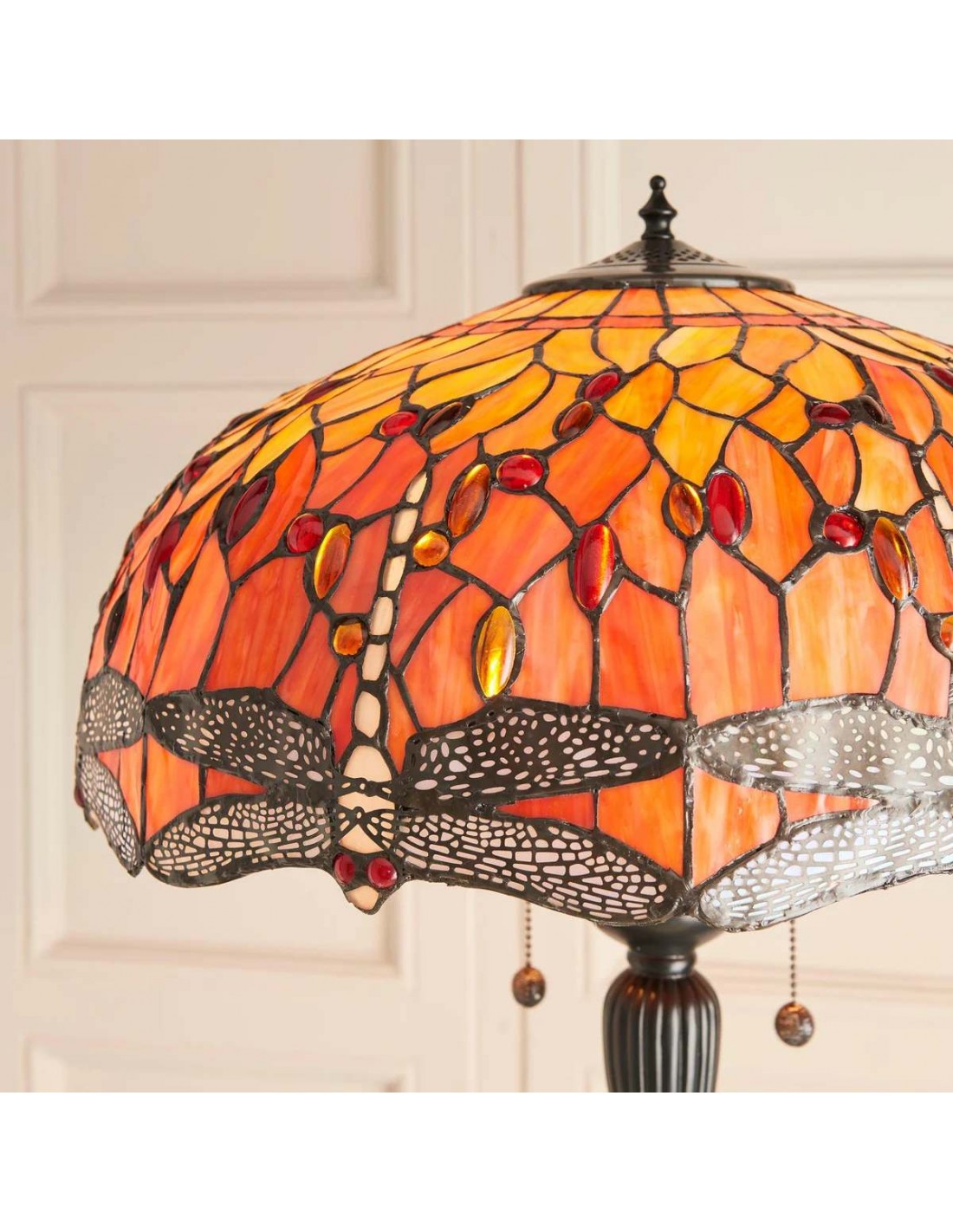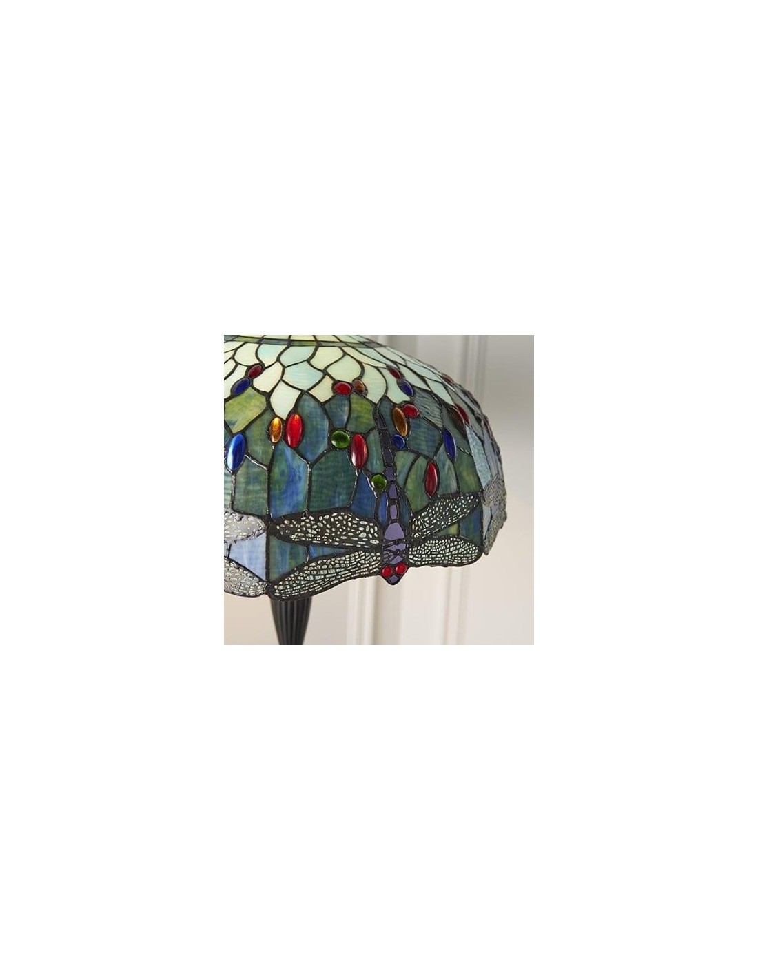 TF Dragonfly vloerlamp met een handgemaakte kap van glas-in-loodmozaïek met libellenmotieven en panelen in juweelkleuren. Perfect voor woonkamers, leeshoekjes en slaapkamers om te zorgen voor warm, decoratief sfeerlicht.