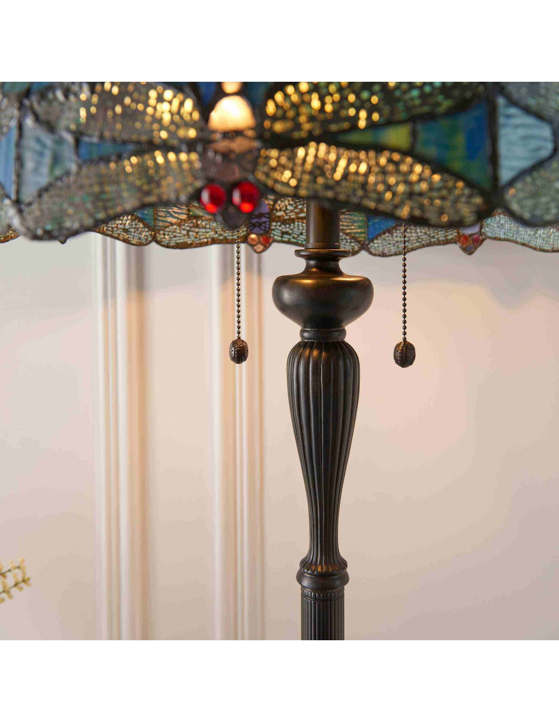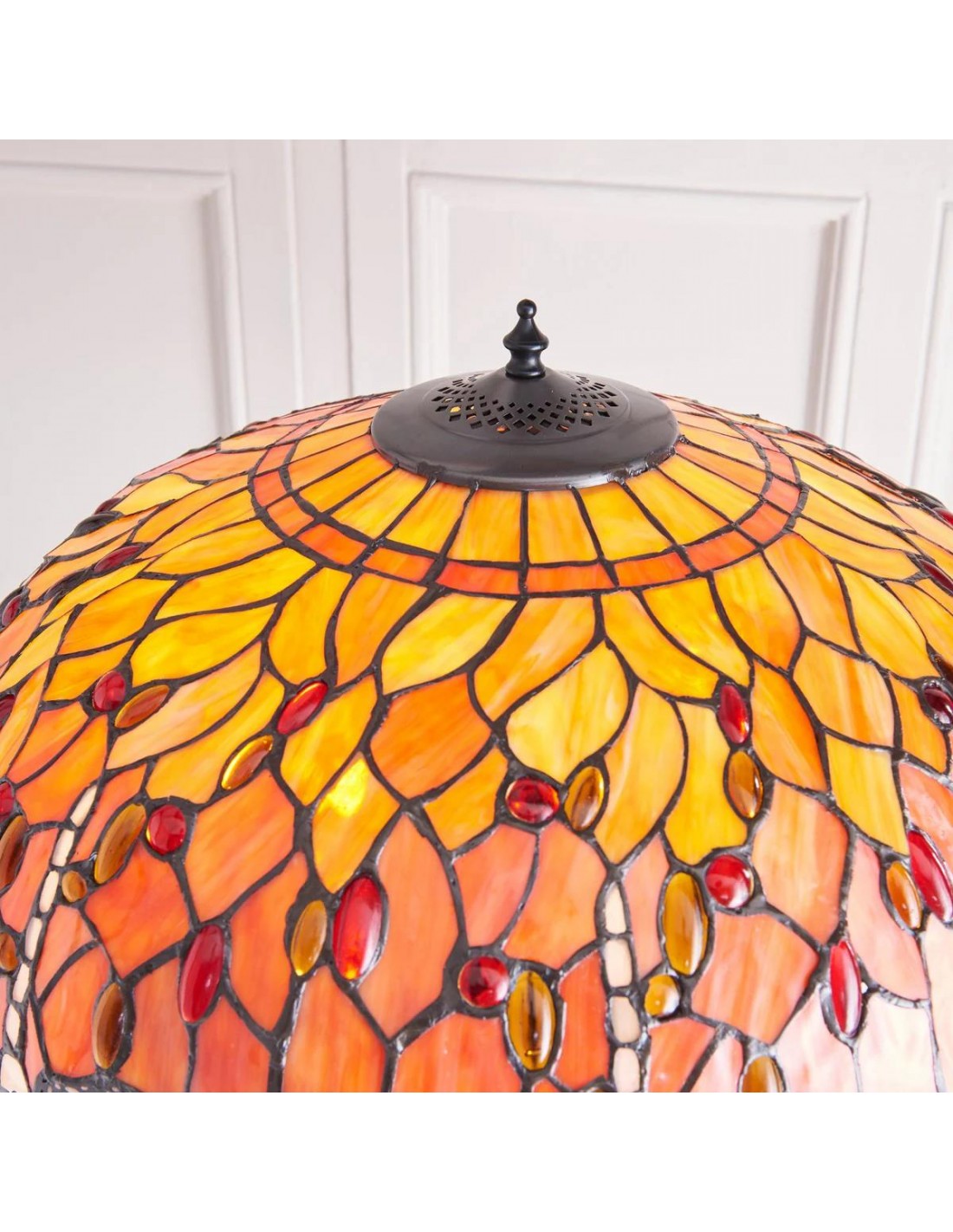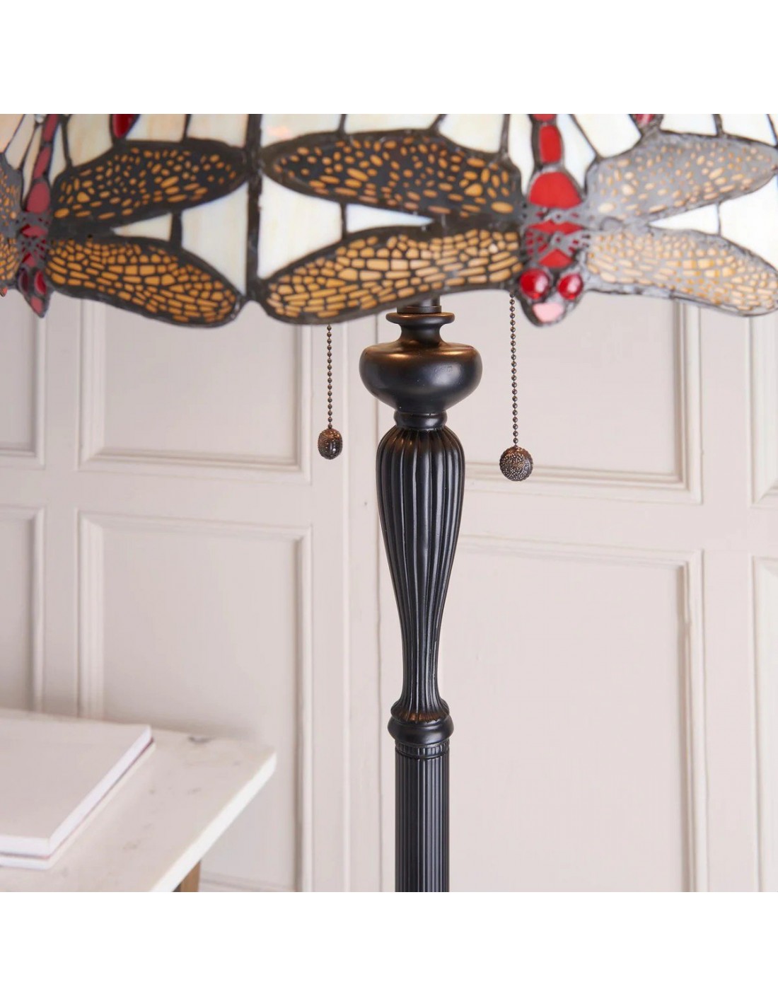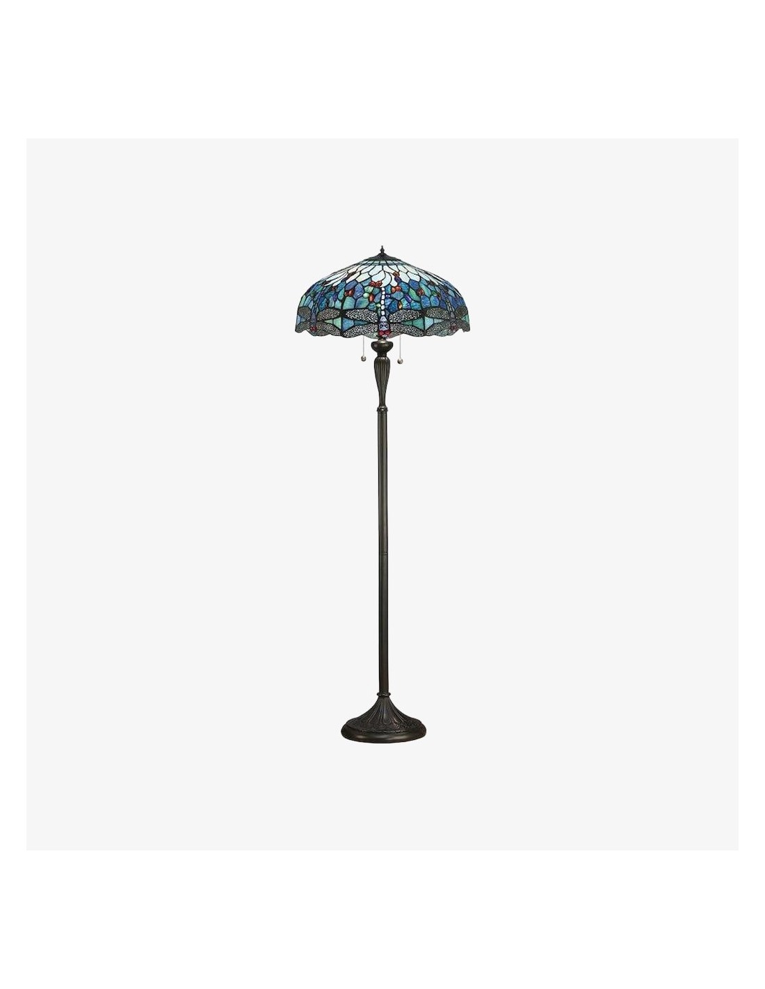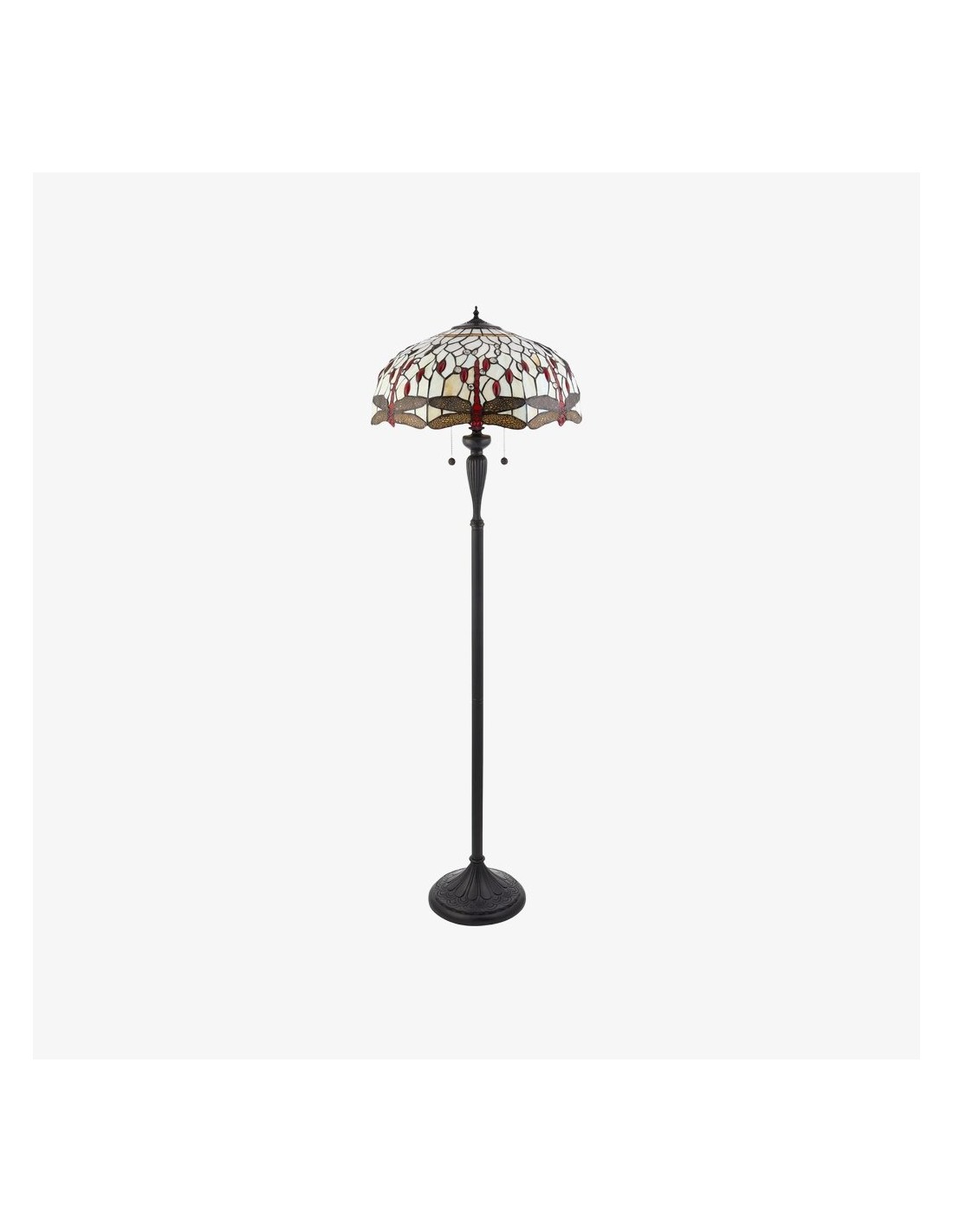 TF Dragonfly vloerlamp met een handgemaakte kap van glas-in-loodmozaïek met libellenmotieven en panelen in juweelkleuren. Perfect voor woonkamers, leeshoekjes en slaapkamers om te zorgen voor warm, decoratief sfeerlicht.
