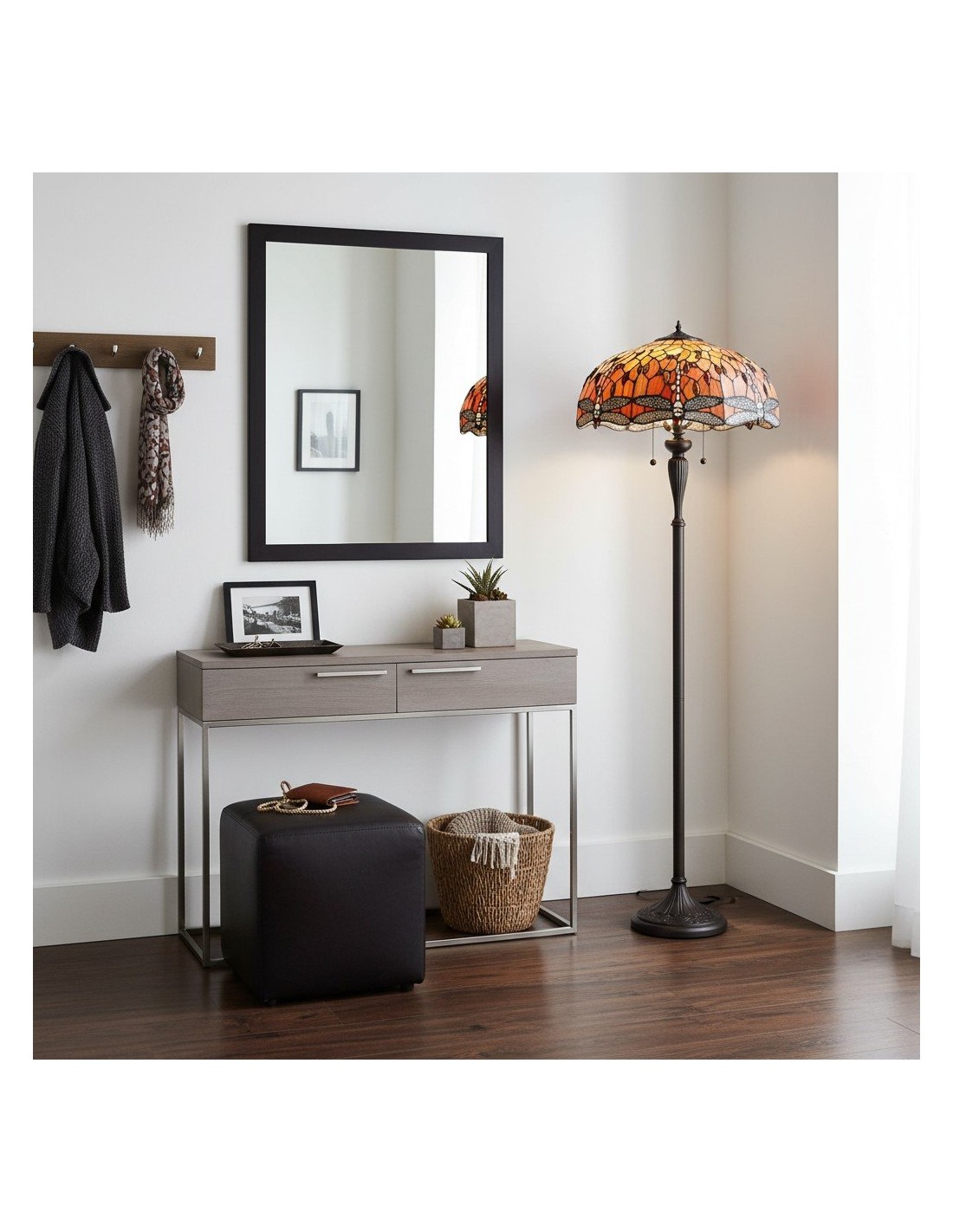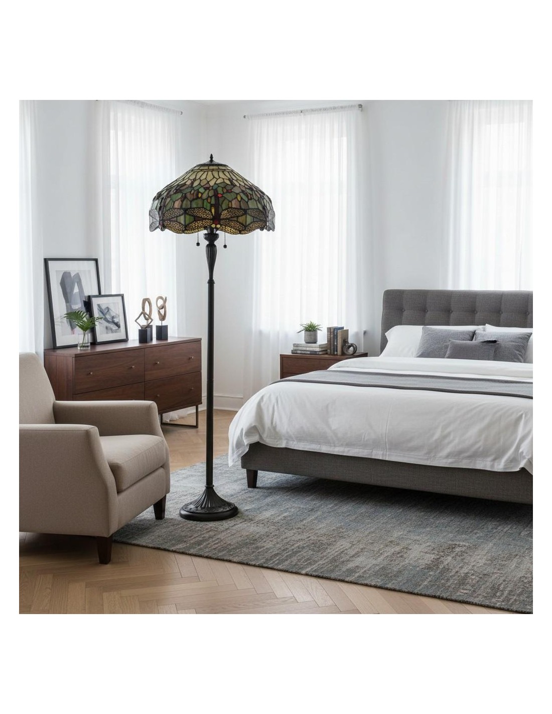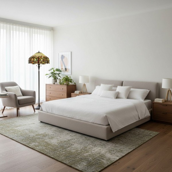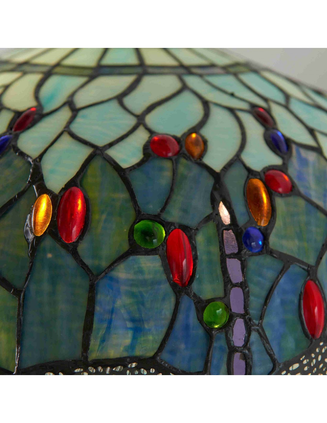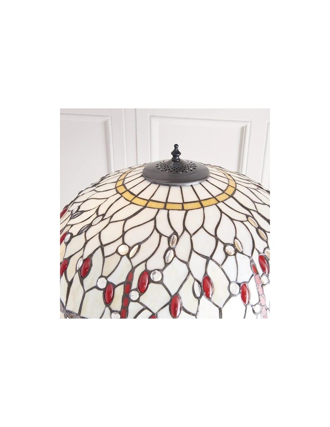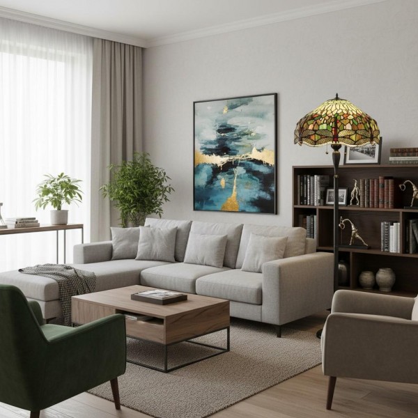 TF Dragonfly vloerlamp met een handgemaakte kap van glas-in-loodmozaïek met libellenmotieven en panelen in juweelkleuren. Perfect voor woonkamers, leeshoekjes en slaapkamers om te zorgen voor warm, decoratief sfeerlicht.