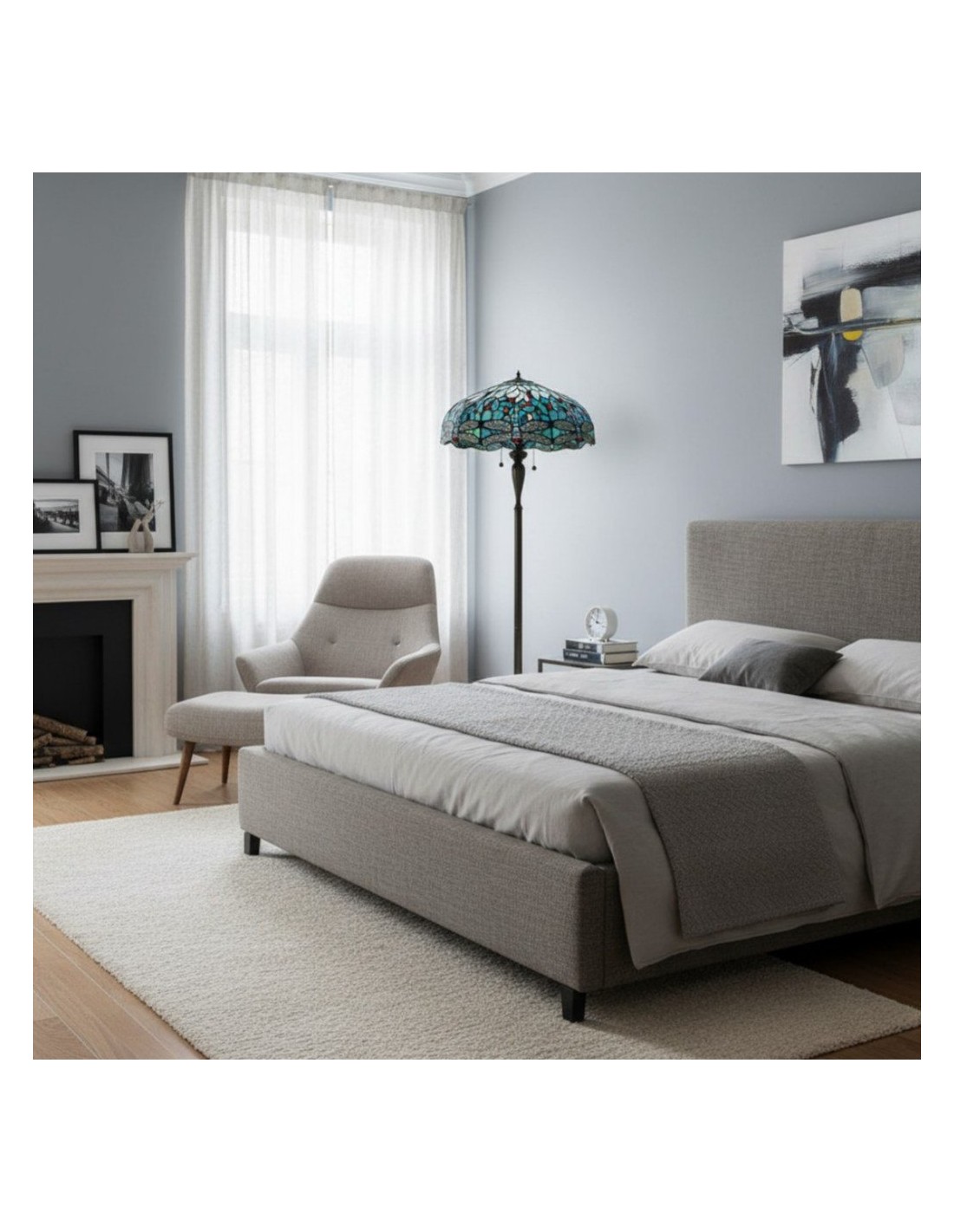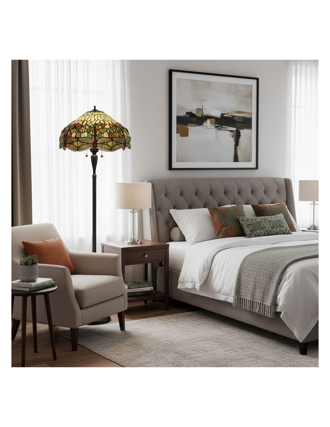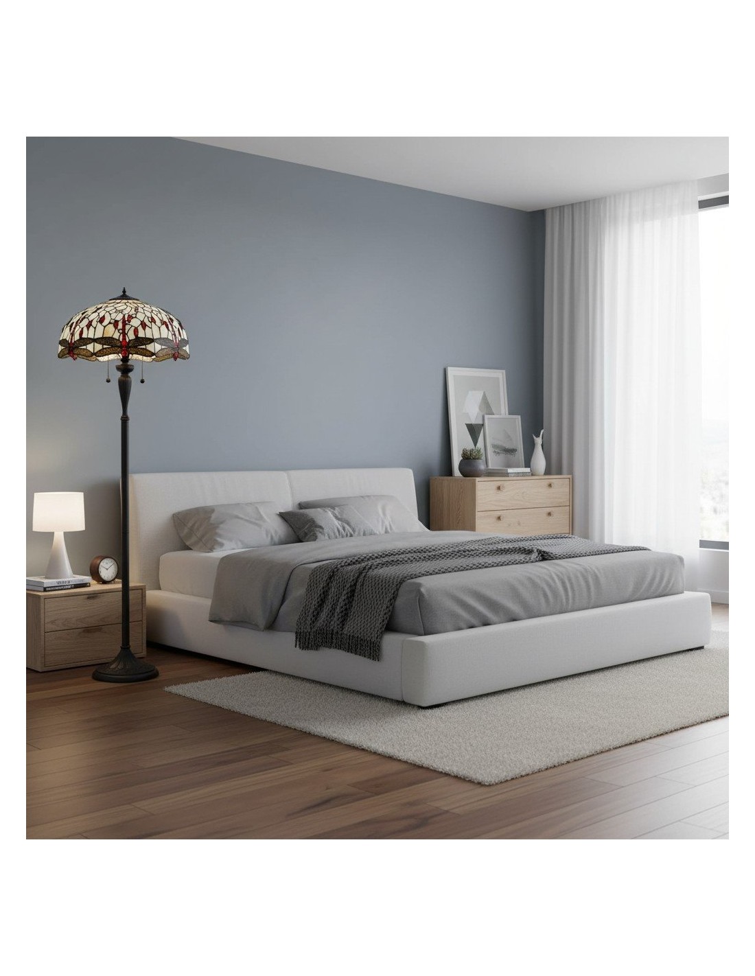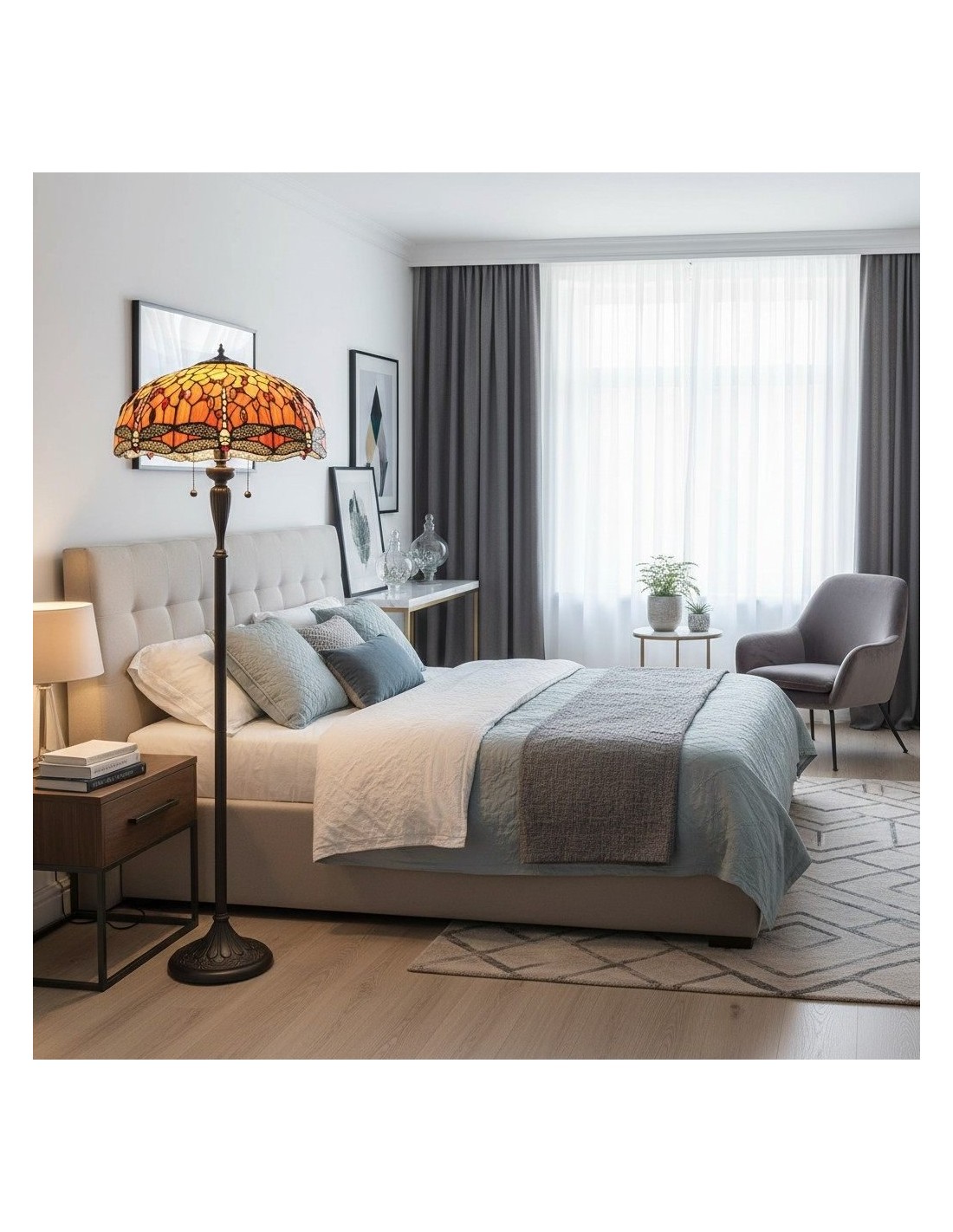 TF Dragonfly vloerlamp met een handgemaakte kap van glas-in-loodmozaïek met libellenmotieven en panelen in juweelkleuren. Perfect voor woonkamers, leeshoekjes en slaapkamers om te zorgen voor warm, decoratief sfeerlicht.