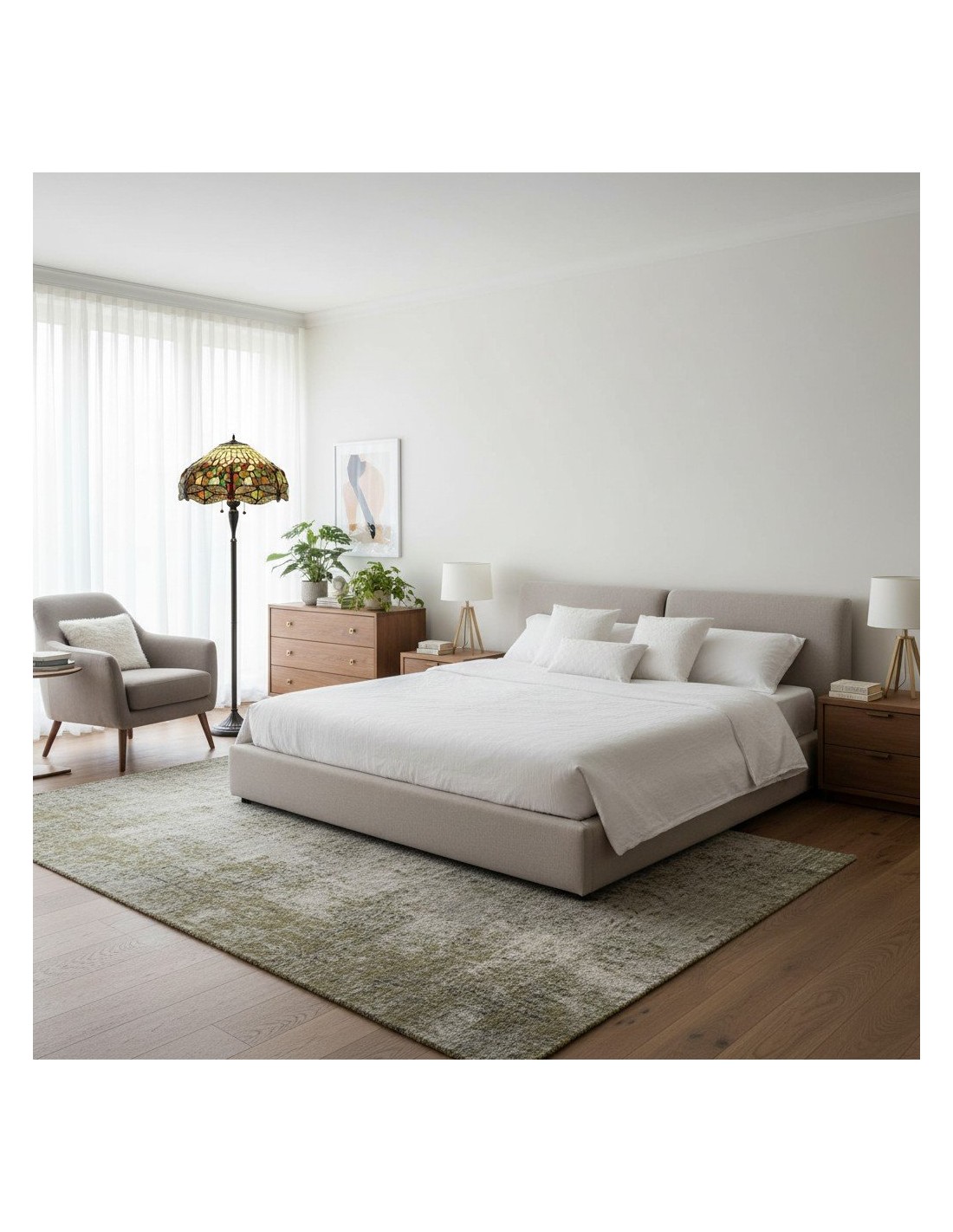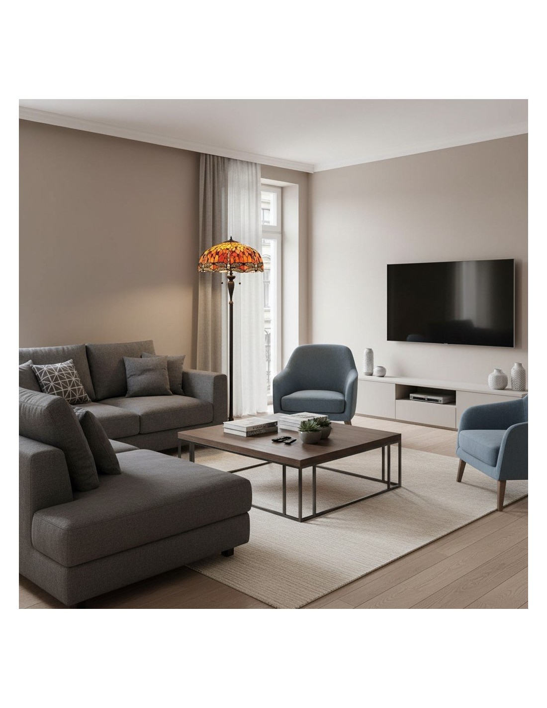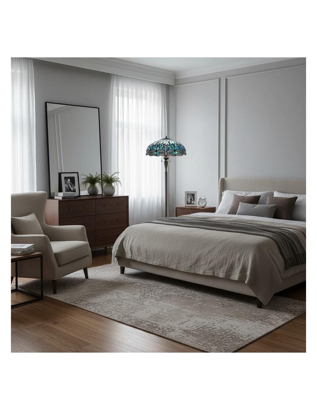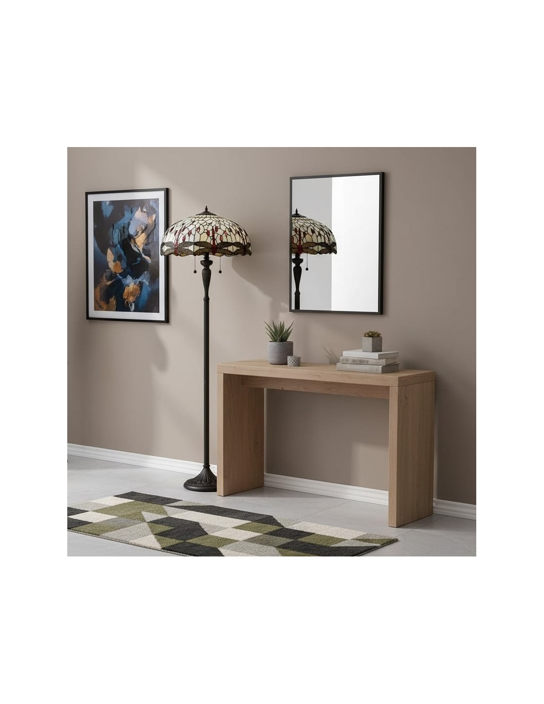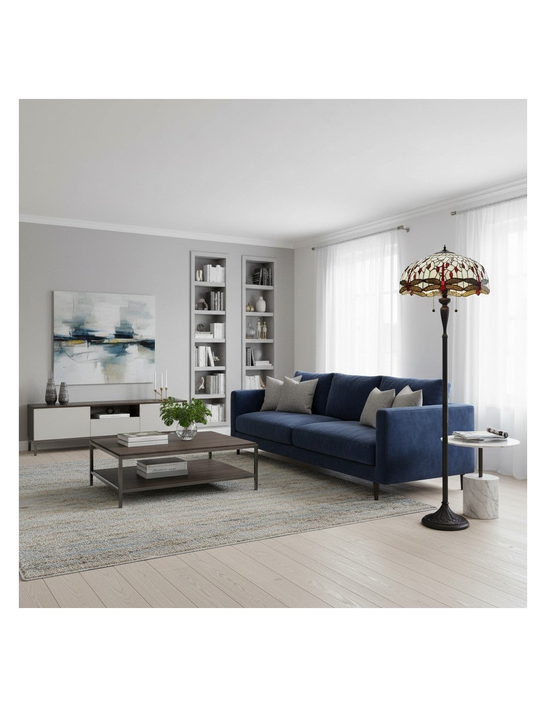 TF Dragonfly vloerlamp met een handgemaakte kap van glas-in-loodmozaïek met libellenmotieven en panelen in juweelkleuren. Perfect voor woonkamers, leeshoekjes en slaapkamers om te zorgen voor warm, decoratief sfeerlicht.