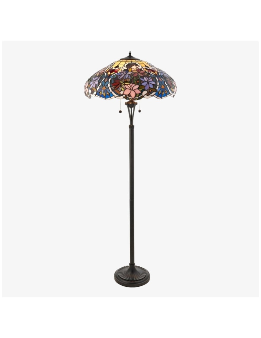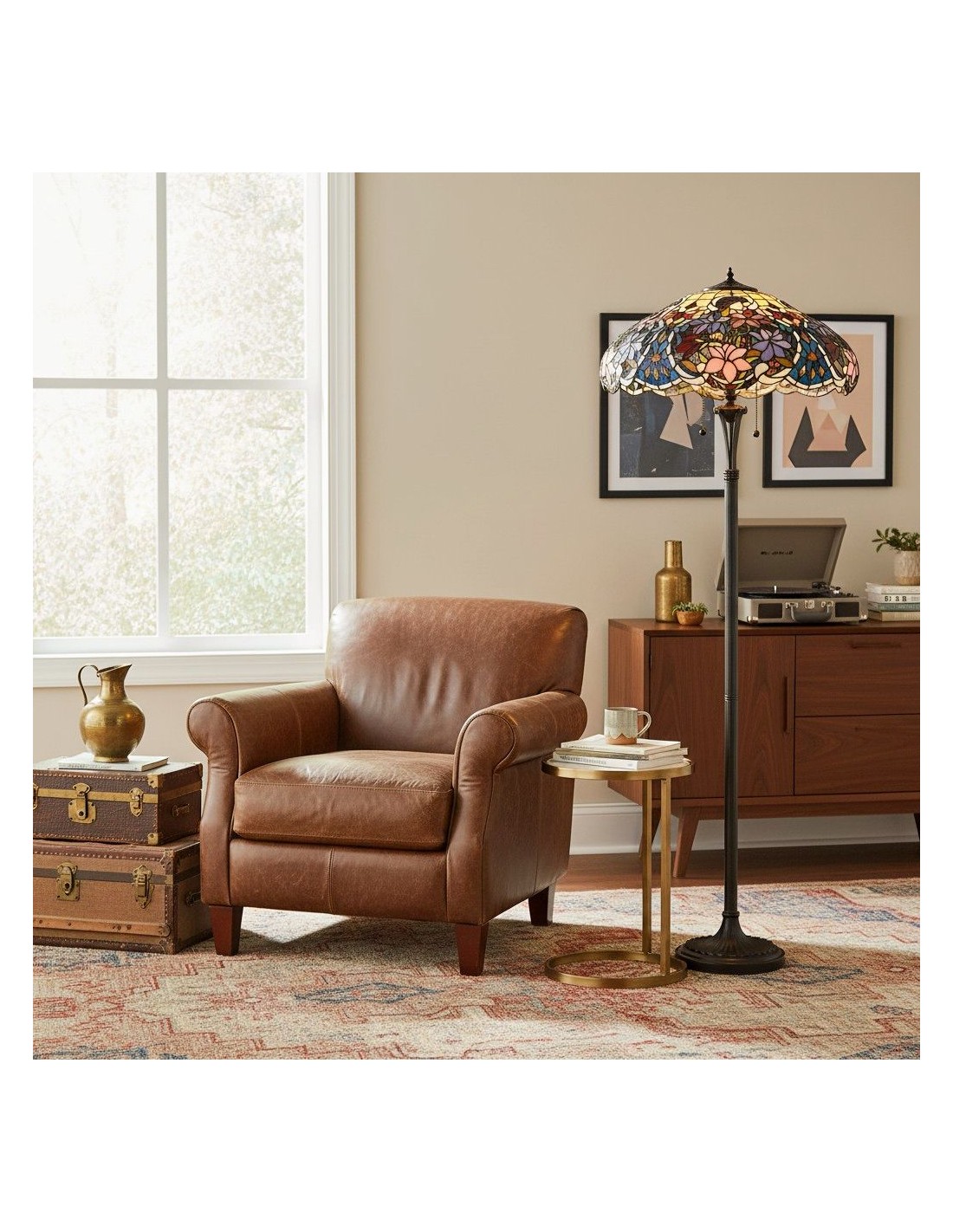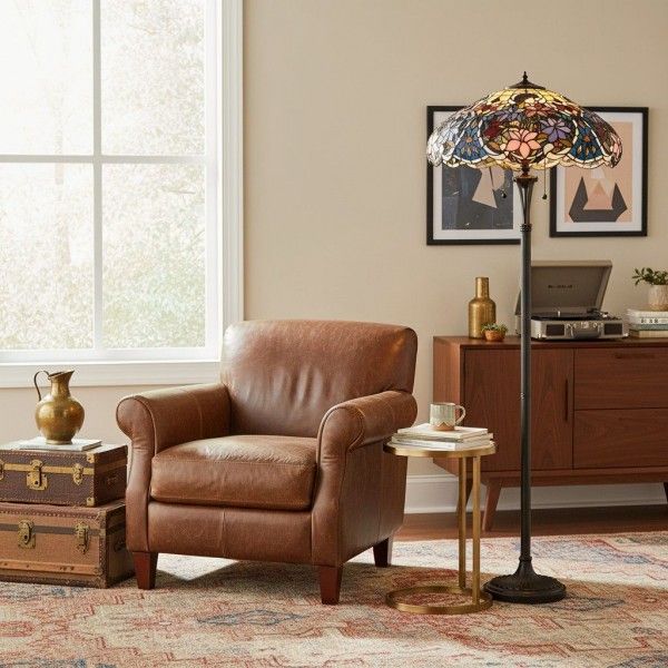 De Sullivan Tiffany vloerlamp heeft een handgemaakte kap van gebrandschilderd glas met een ingewikkeld bloemenpatroon. Hij straalt warmte uit en dient als verfijnde leeslamp of als elegante blikvanger naast uw bed of in uw woonkamer.