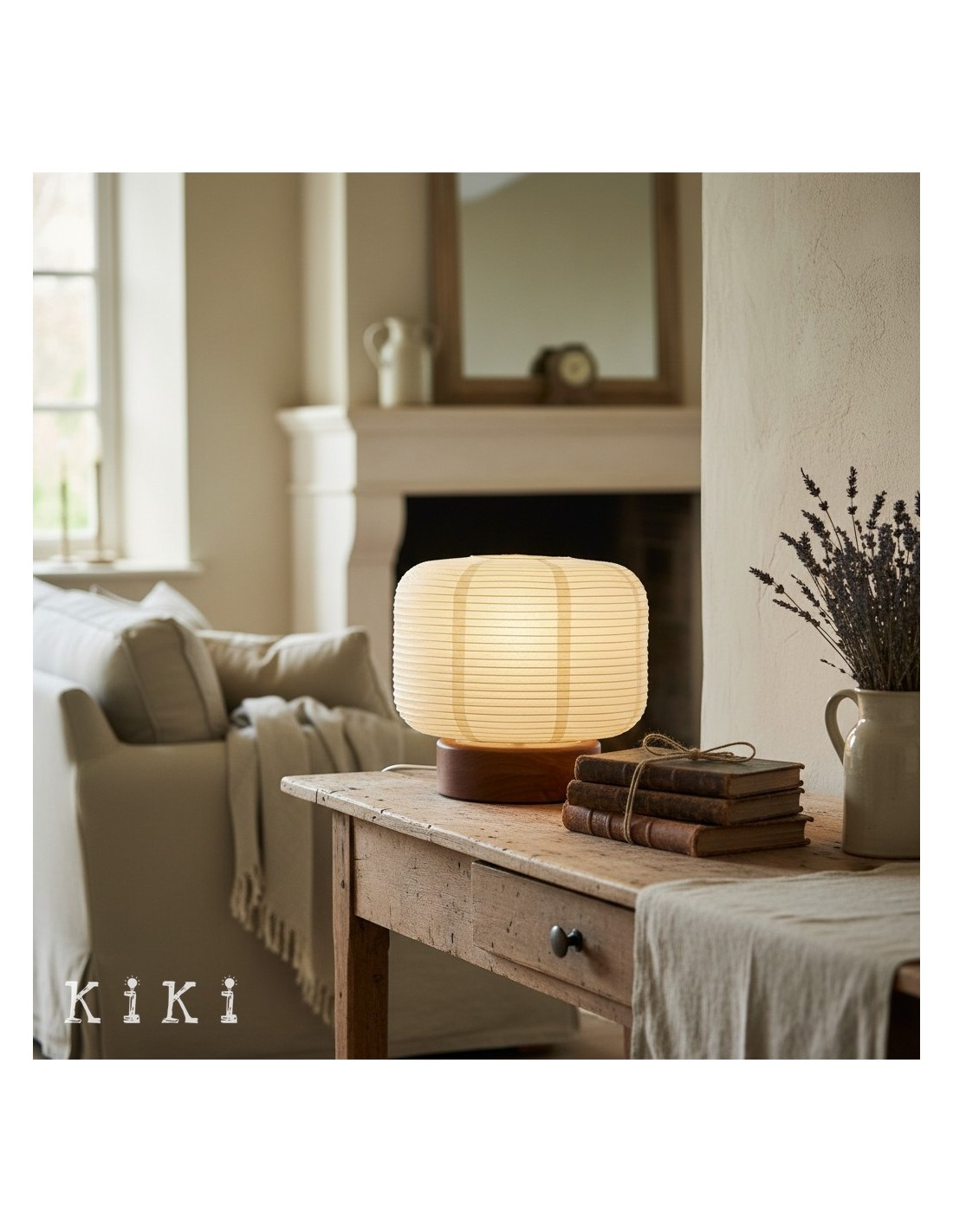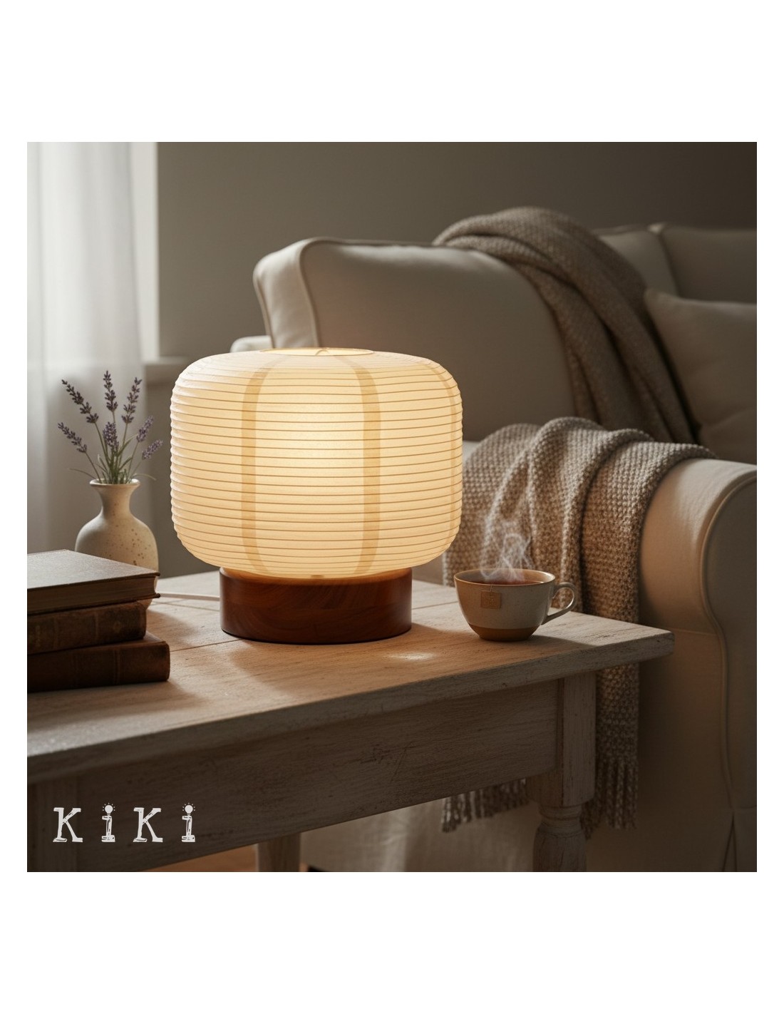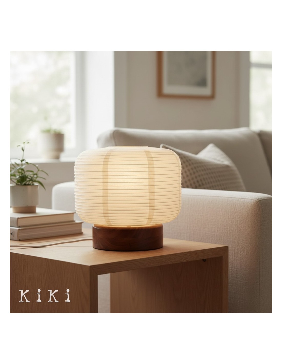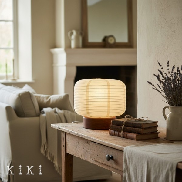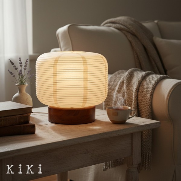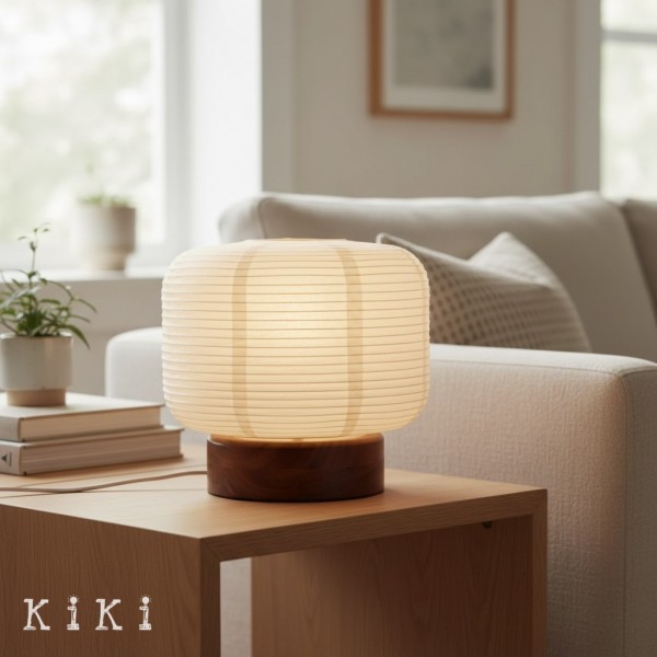 Deze op Japan geïnspireerde tafellamp heeft een geribbelde papieren lampenkap in combinatie met een houten voet, wat resulteert in een compact maar visueel aantrekkelijk ontwerp. De papieren kap vormt een zachte, lantaarnachtige vorm, die het licht subtiel verspreidt en textuur en warmte aan de ruimte toevoegt.