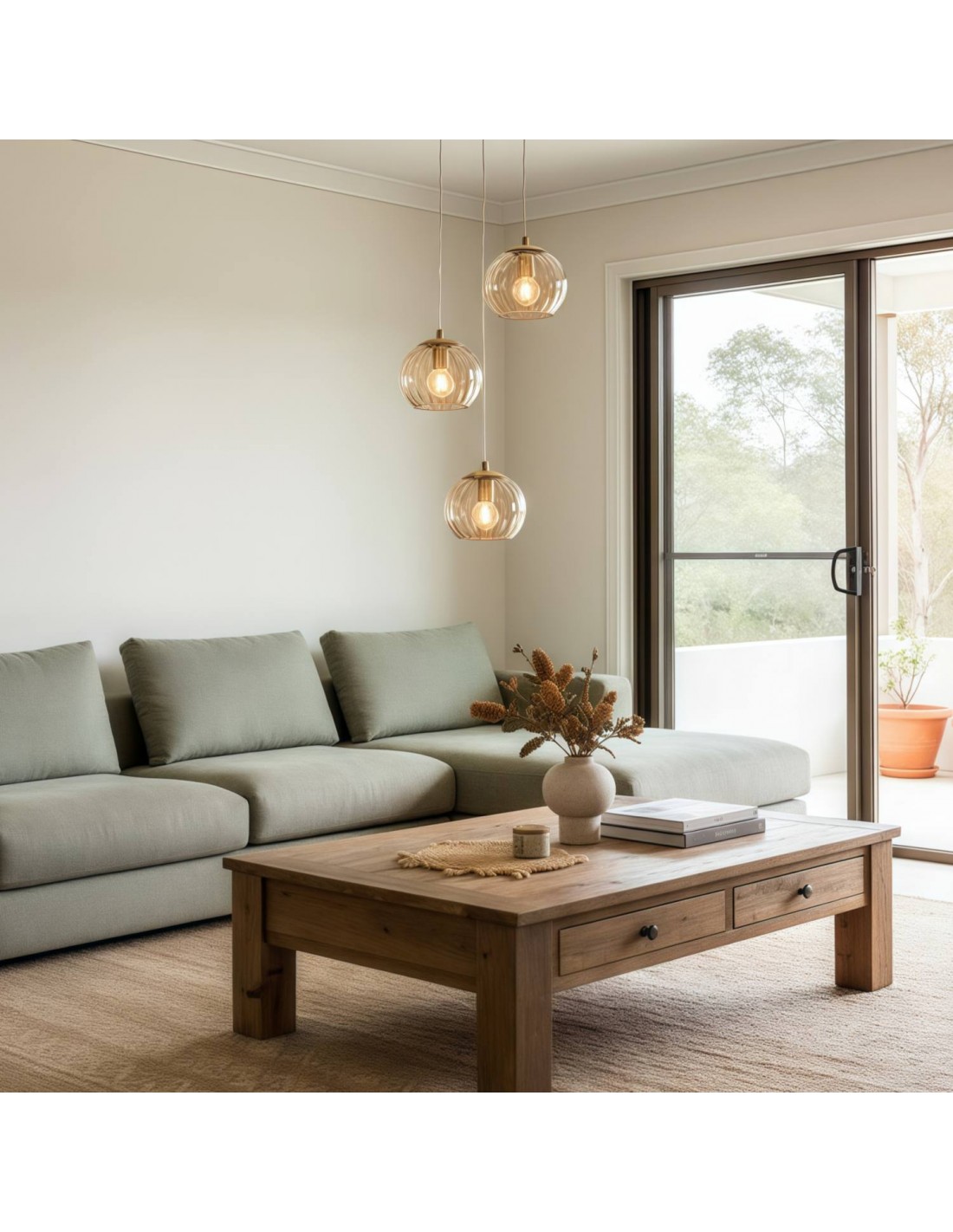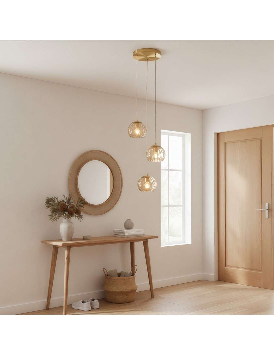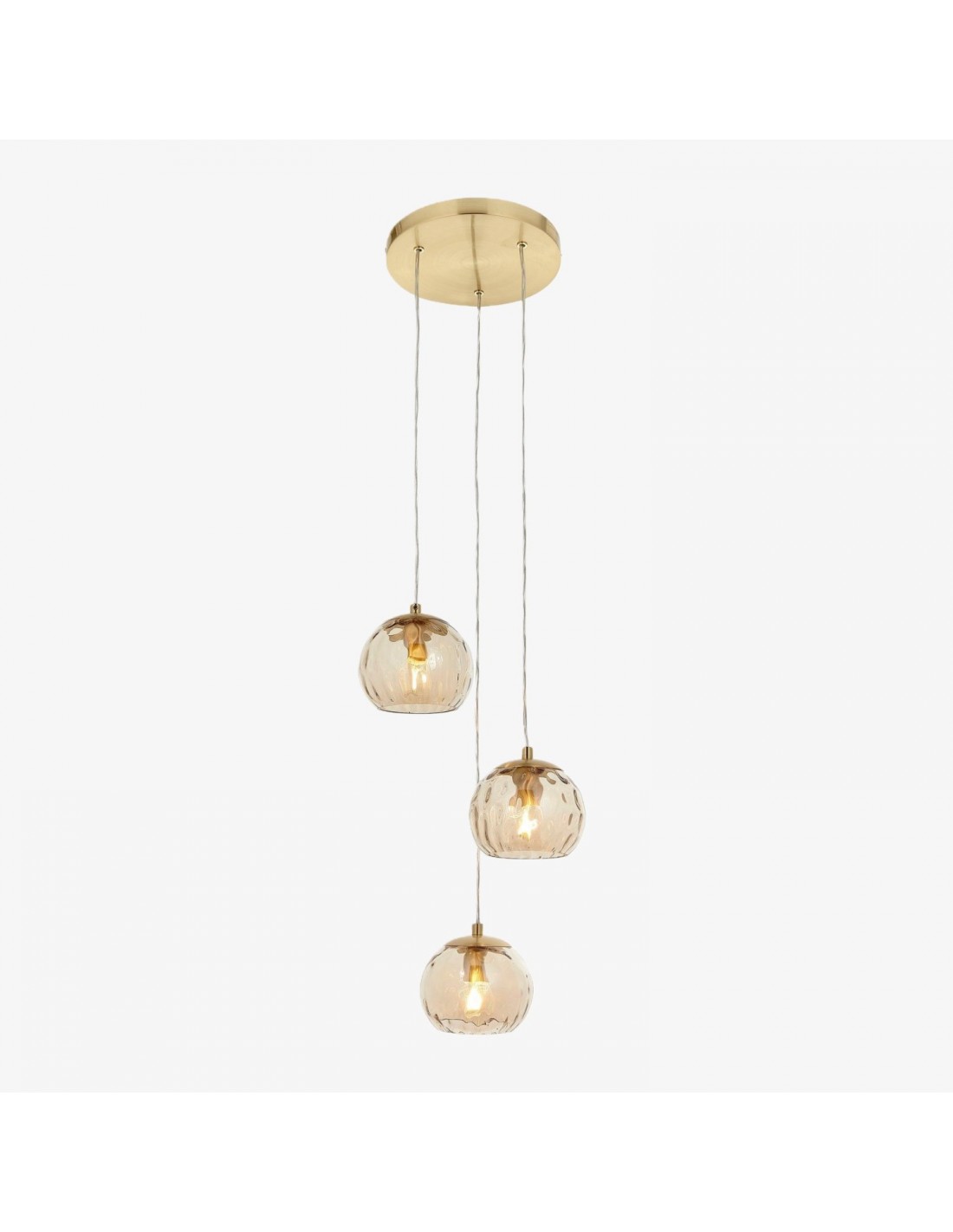 Breng een warme, sculpturale gloed in huis met de Dimpled Globes 3-lichts hanglamp. De met de hand bewerkte glazen bollen verspreiden een zacht, getextureerd licht via het messingkleurige metalen frame. Dankzij de verstelbare hoogte kan de lamp boven een eettafel, in de hal of in de woonkamer worden geplaatst, wat zorgt voor een moderne en sfeervolle verlichting.