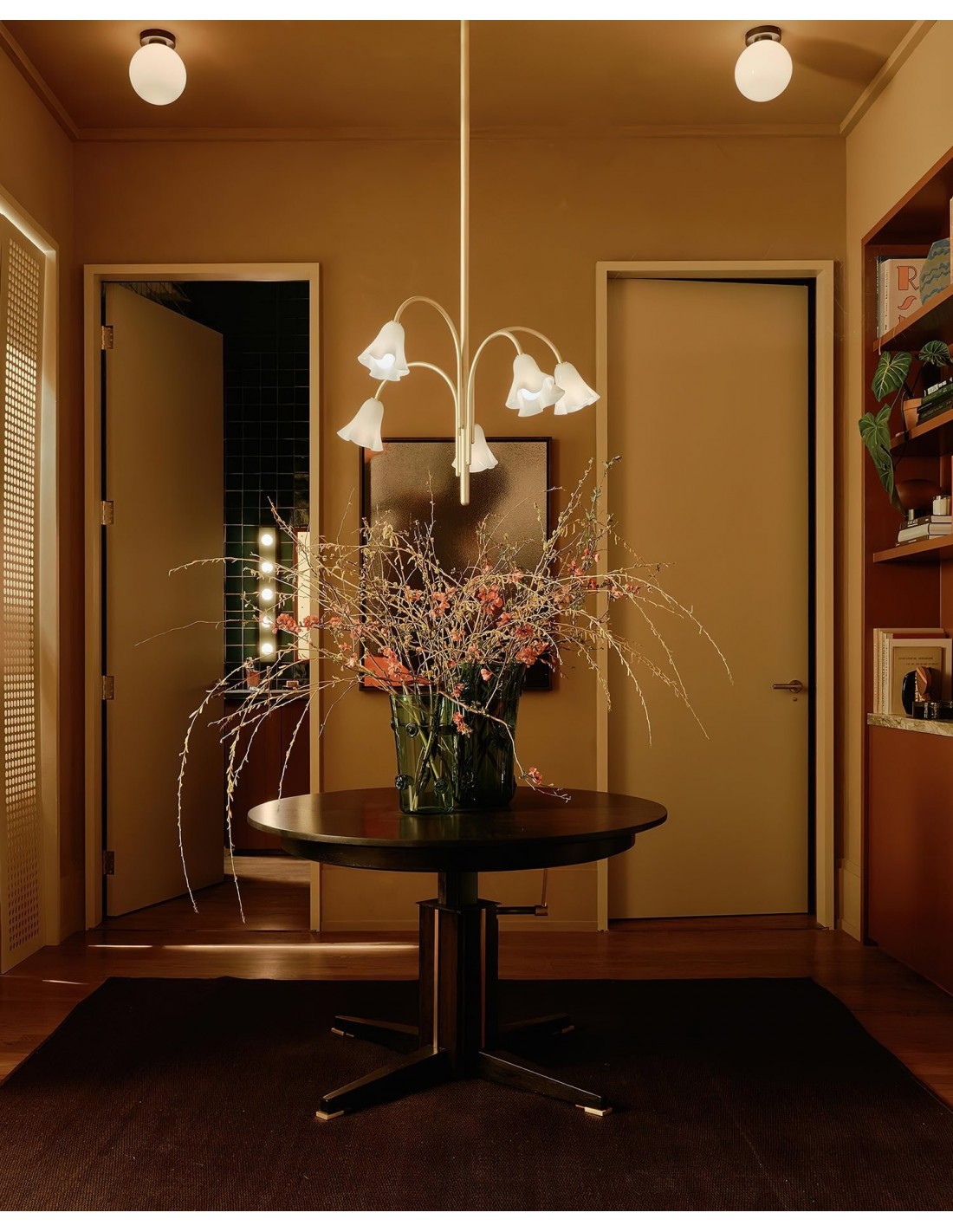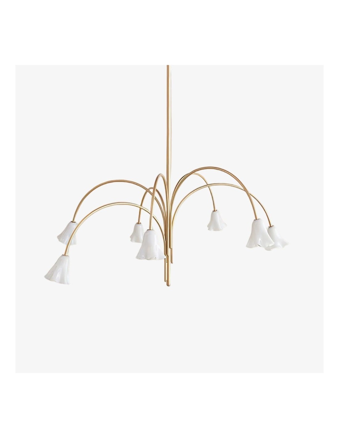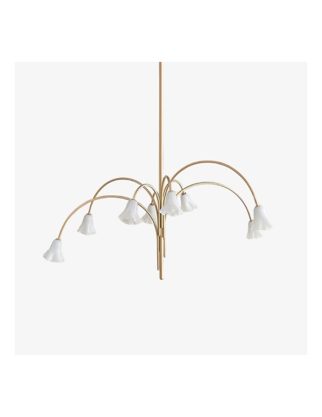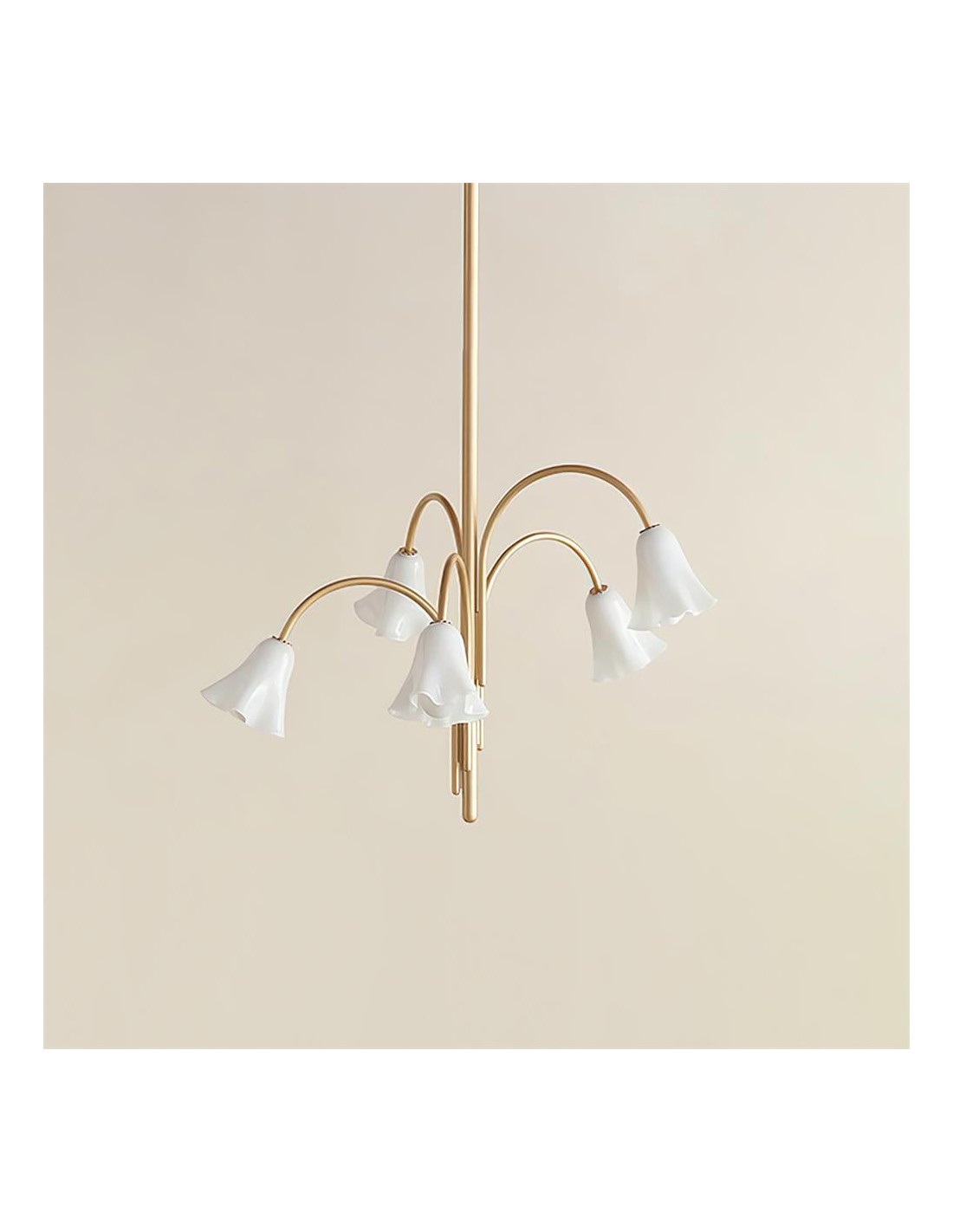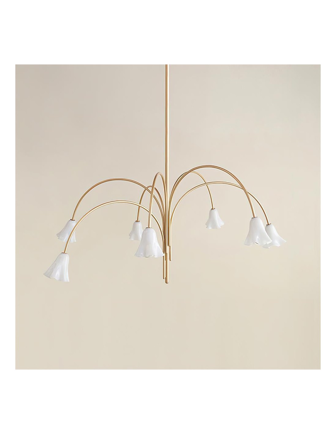 Geef je ruimte een romantische, moderne touch met de kroonluchter. Met gebogen armen van geborsteld metaal en handgevormde witte glazen kappen creëert dit armatuur een zachte, elegante gloed. Het minimalistische botanische ontwerp, geïnspireerd op lelies, voegt sierlijke beweging toe aan eetkamers, entrees of kleedkamers en combineert artisticiteit met eigentijdse elegantie.
