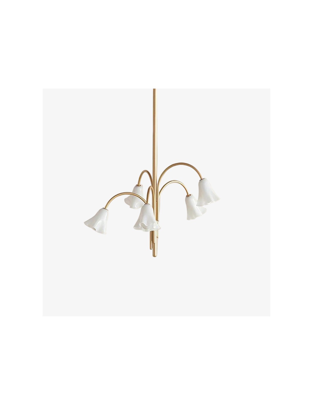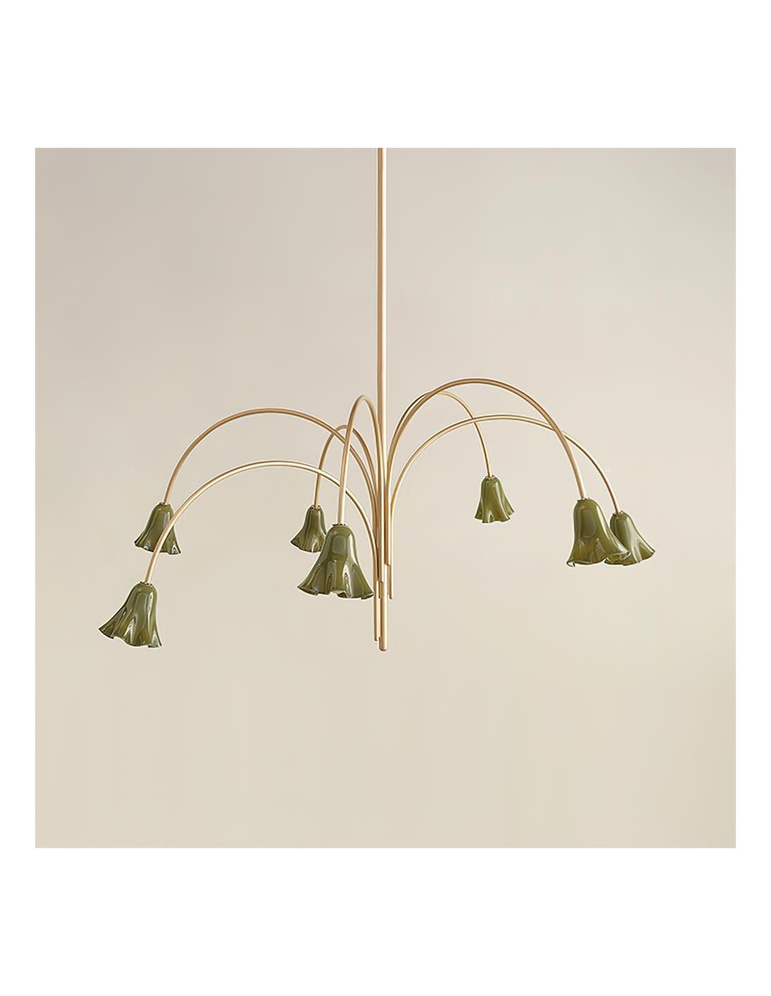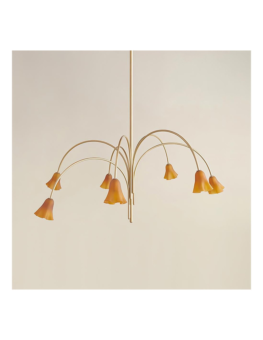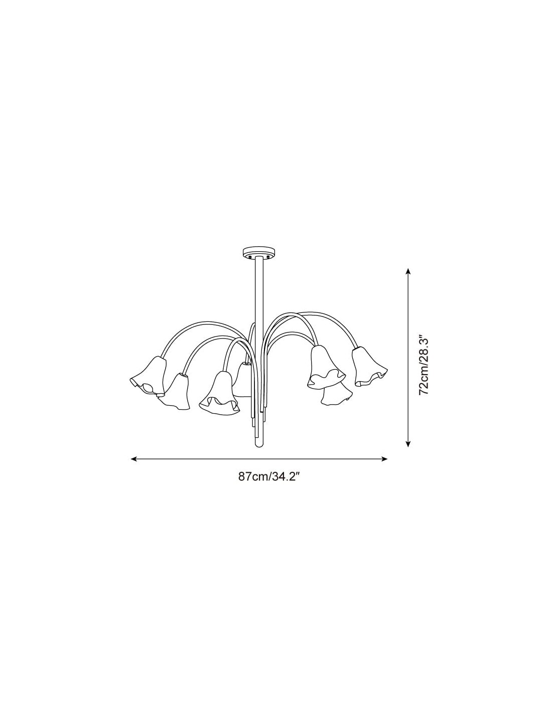 Geef je ruimte een romantische, moderne touch met de kroonluchter. Met gebogen armen van geborsteld metaal en handgevormde witte glazen kappen creëert dit armatuur een zachte, elegante gloed. Het minimalistische botanische ontwerp, geïnspireerd op lelies, voegt sierlijke beweging toe aan eetkamers, entrees of kleedkamers en combineert artisticiteit met eigentijdse elegantie.