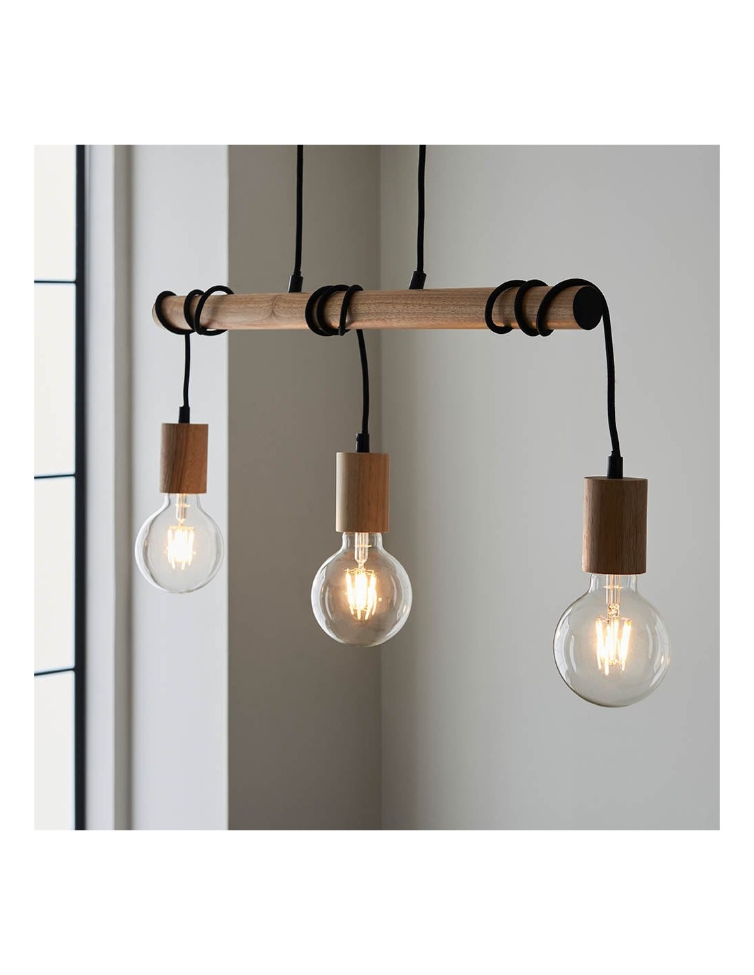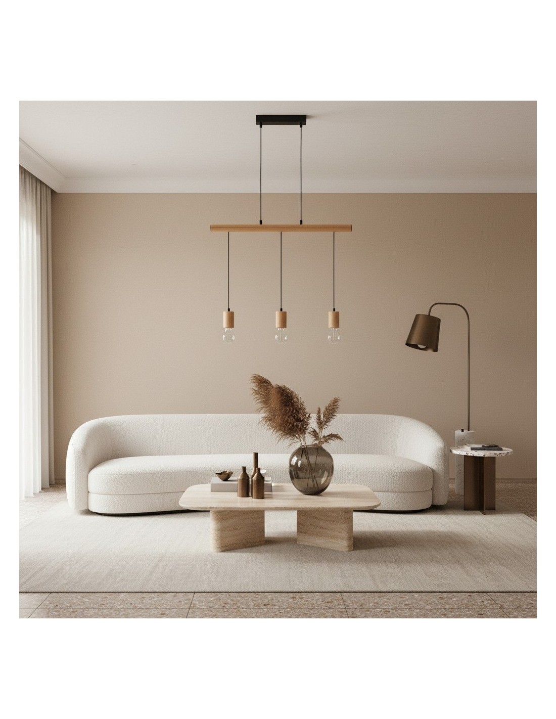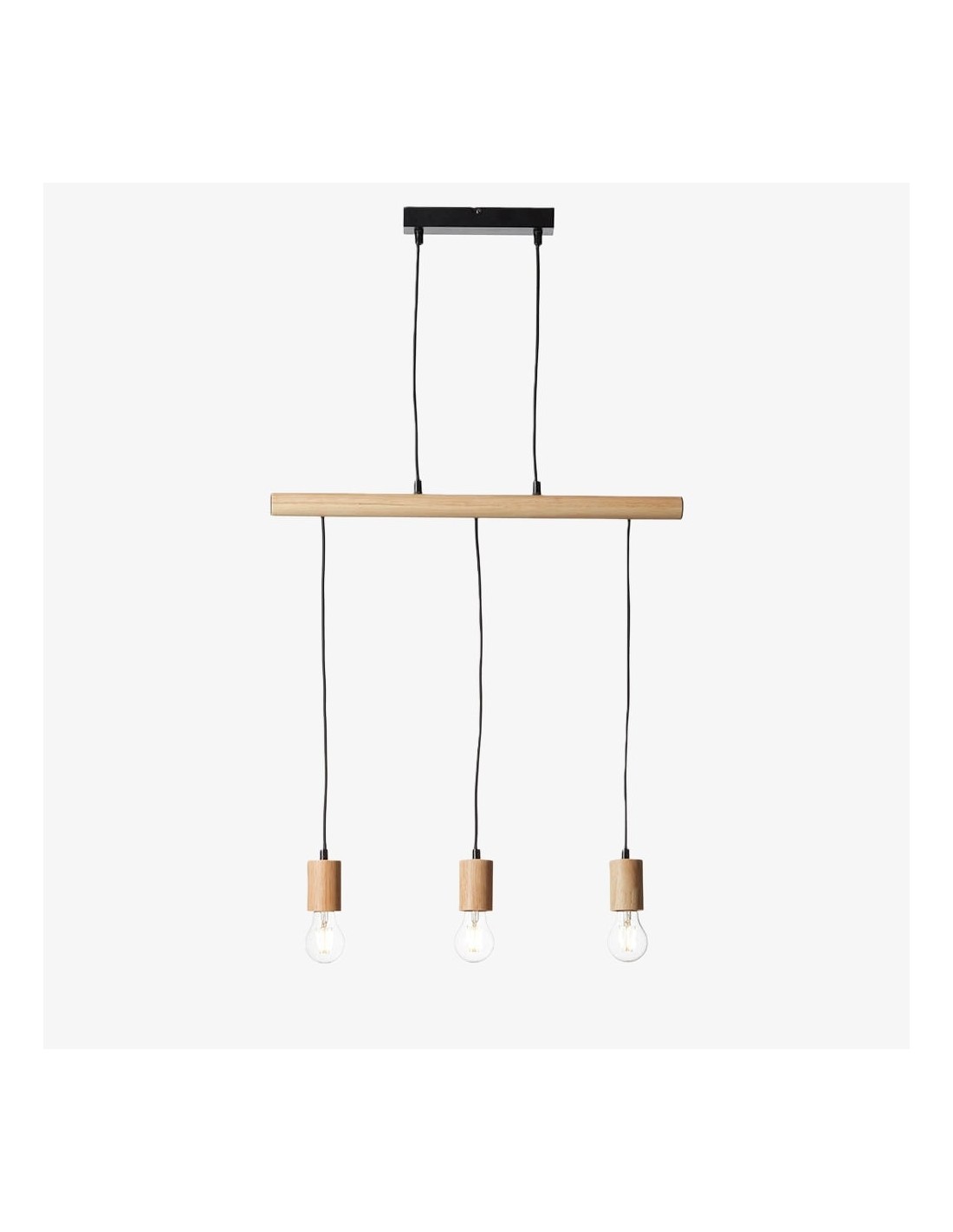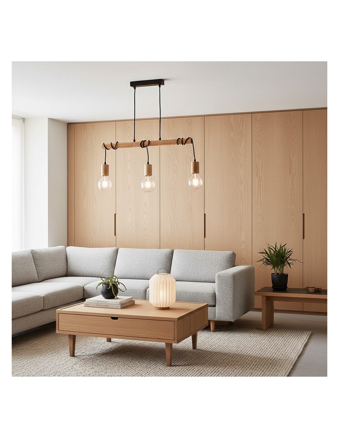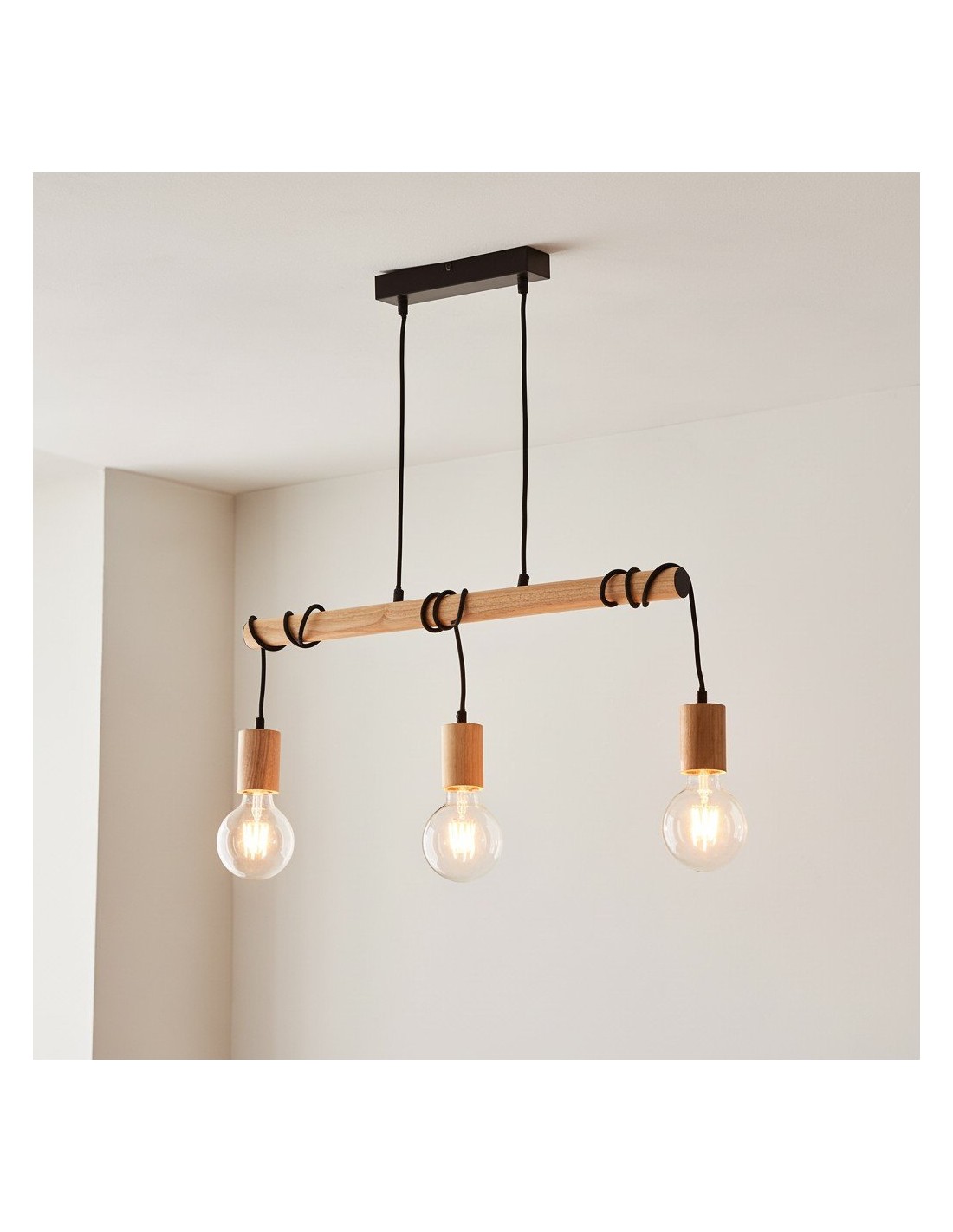 De Virell 3-lichts houten lineaire hanglamp combineert op meesterlijke wijze natuurlijk hout met industrieel metaal tot een modern, milieubewust verlichtingsarmatuur. Deze armatuur is vervaardigd uit duurzaam geproduceerd licht hout en omlijst met matzwart metaal. De ophanghoogte is verstelbaar dankzij een zwart stoffen snoer. De lamp is perfect te combineren met gloeilampen en zorgt voor een warme, sfeervolle gloed, waardoor hij ideaal is voor eetkamers, keukens of werkruimtes waar stijl en functionaliteit hand in hand gaan.