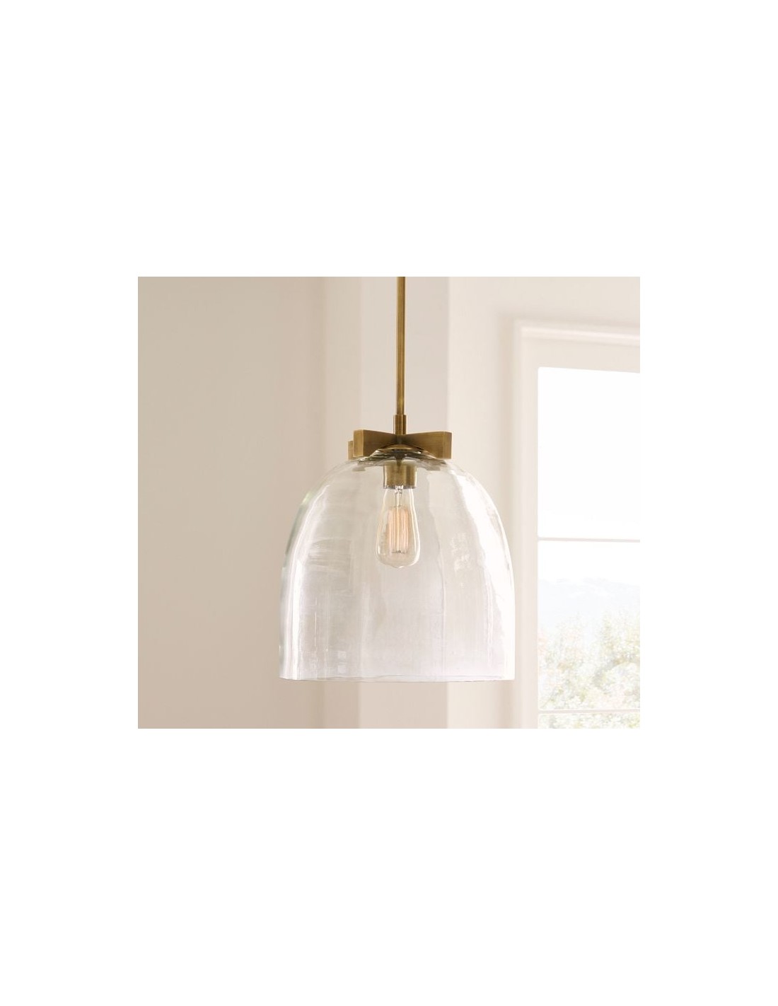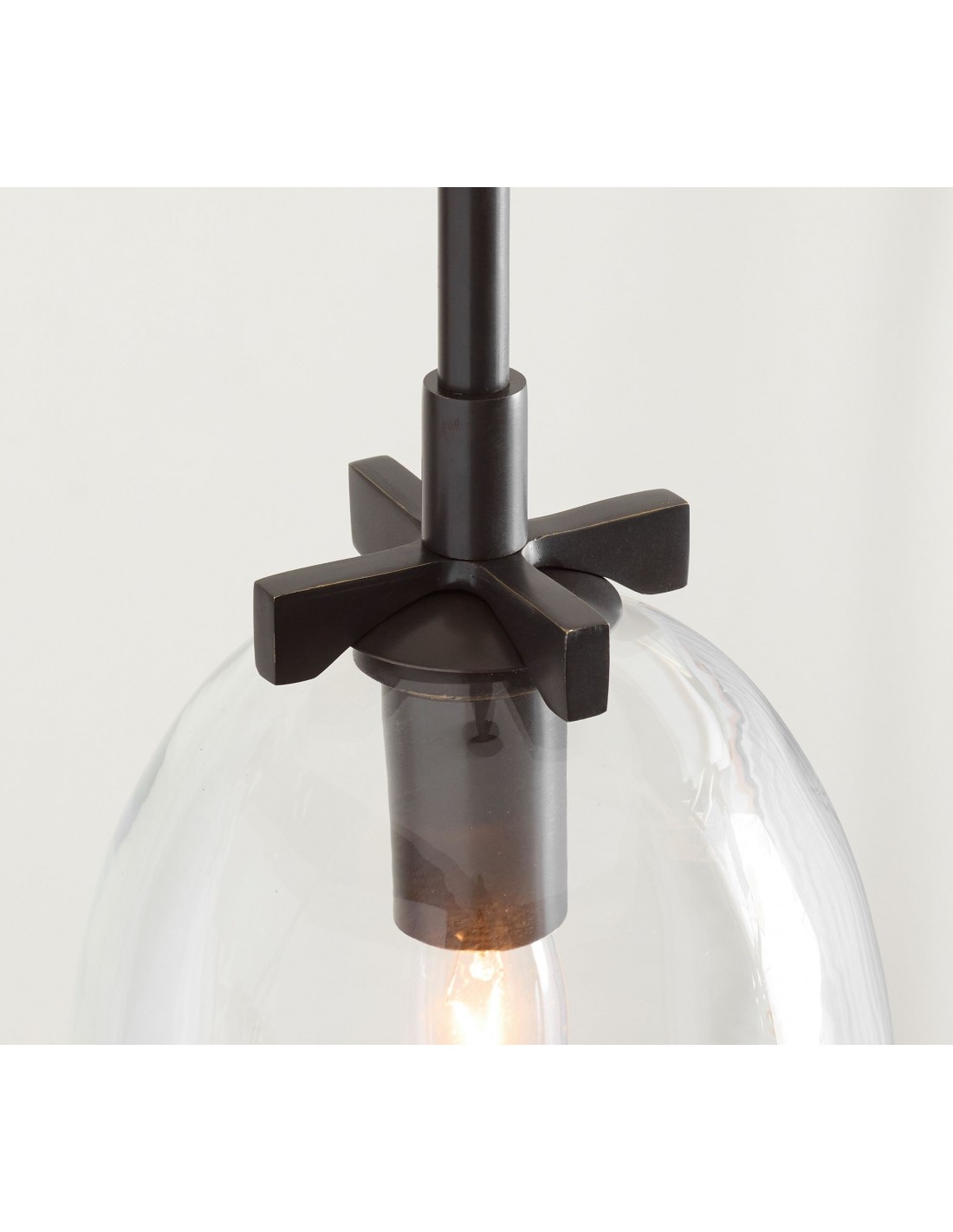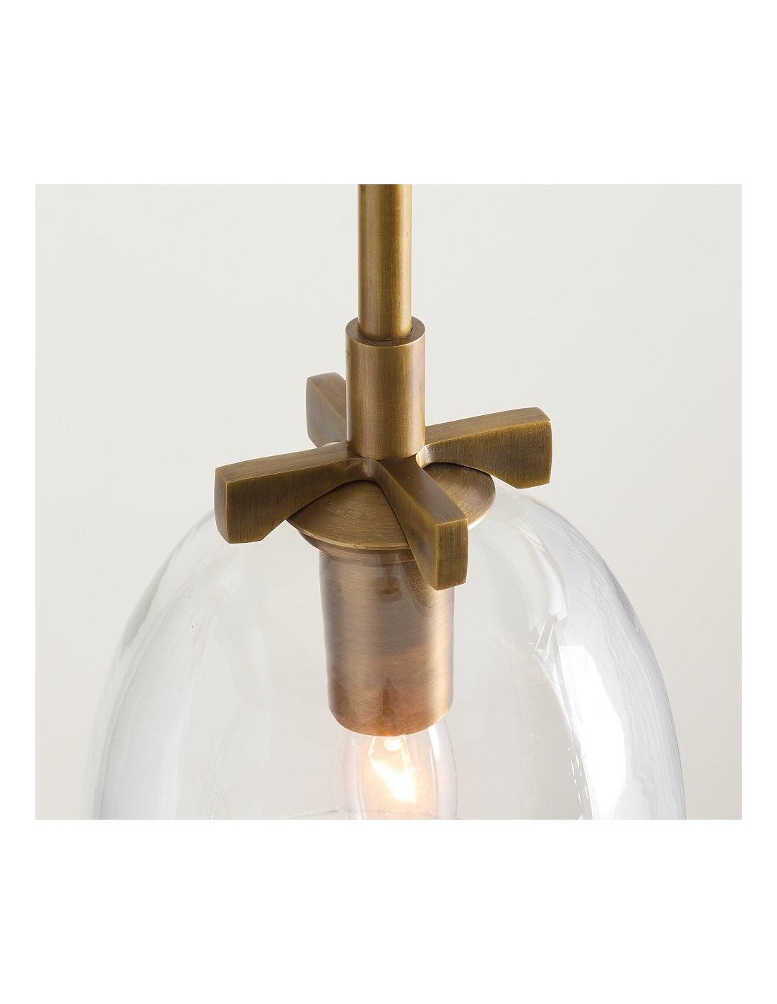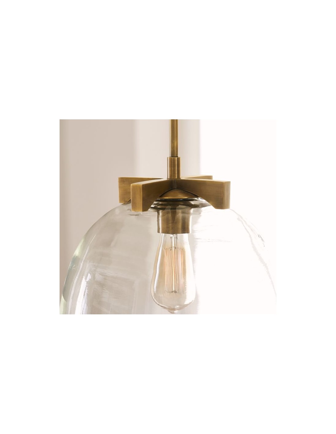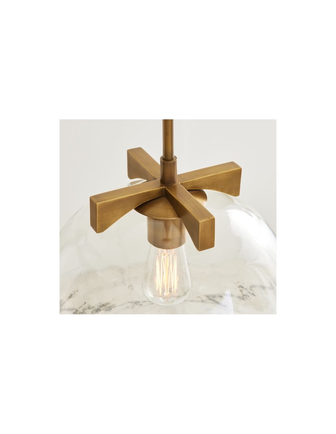 Fabriquée en laiton massif, cette suspension en métal offre une finition laiton vieilli ou bronze, associée à un abat-jour en verre soufflé transparent. Compatible avec un variateur d'intensité et certifiée UL, elle est idéale pour les salles de bains, les cuisines ou les terrasses couvertes.