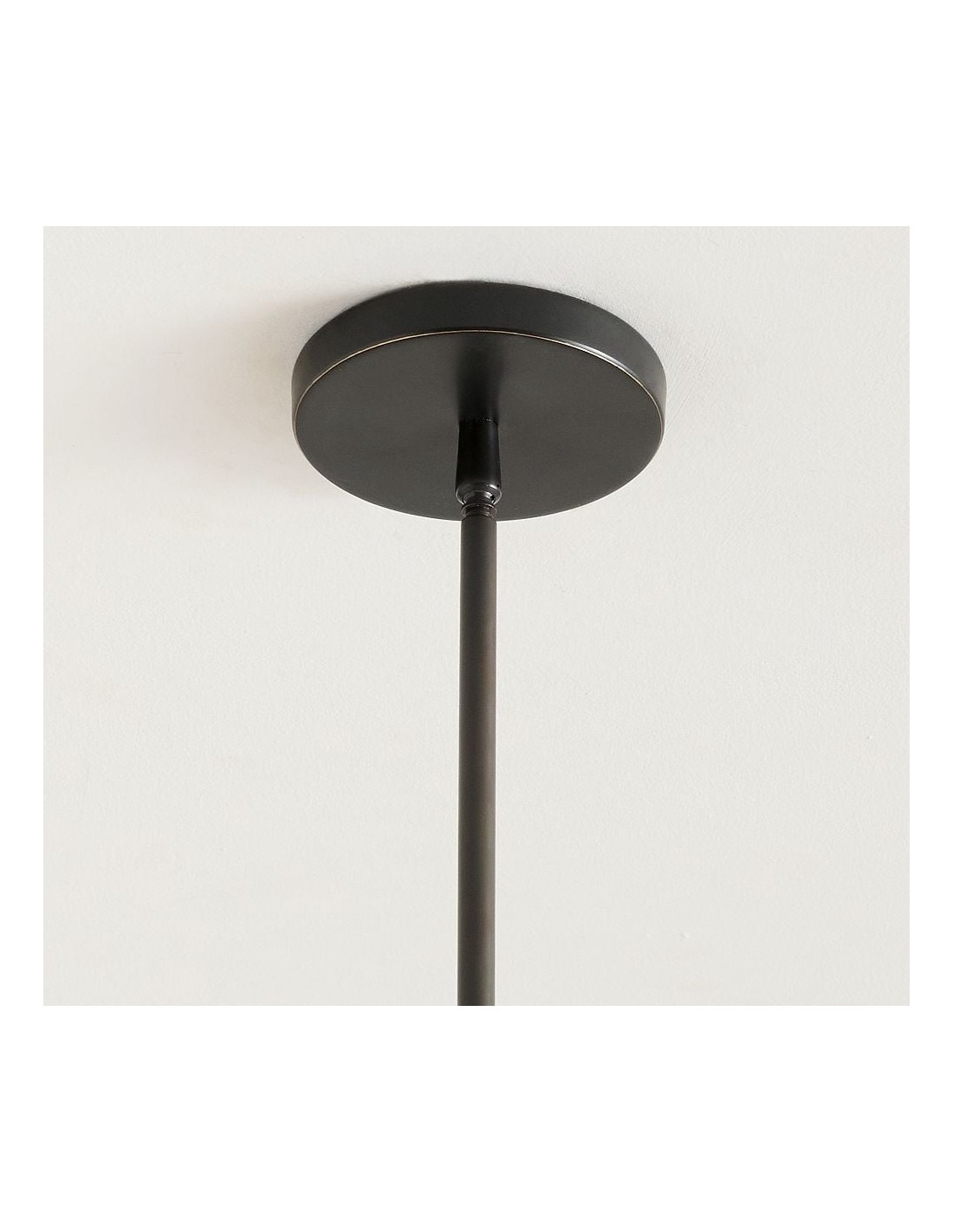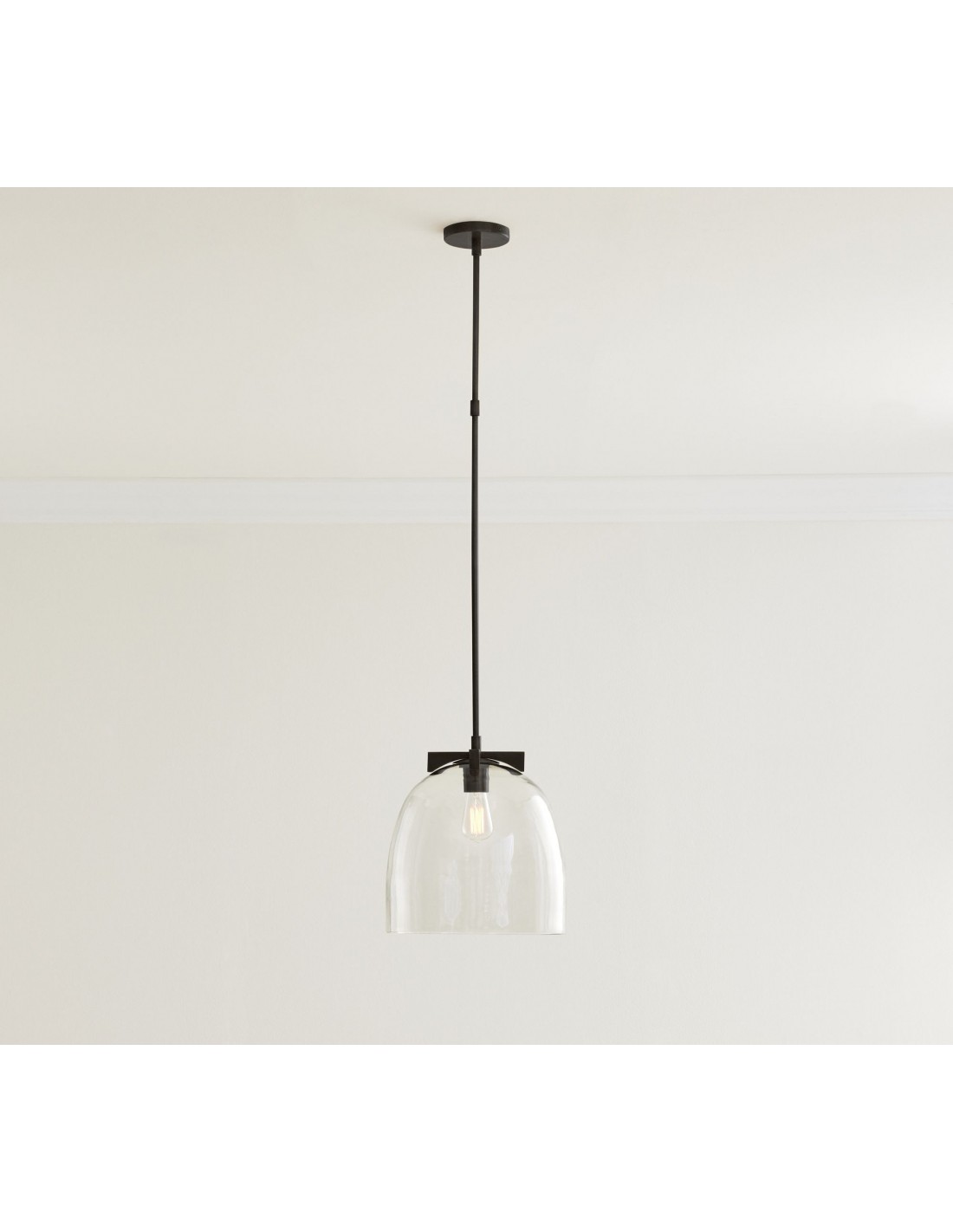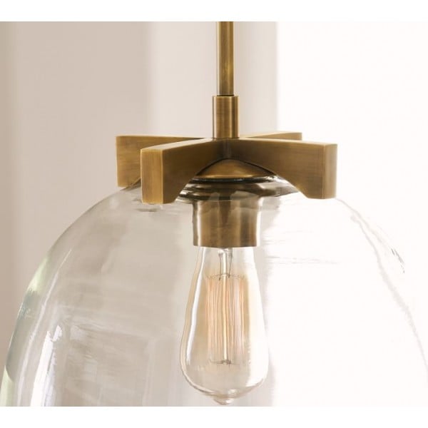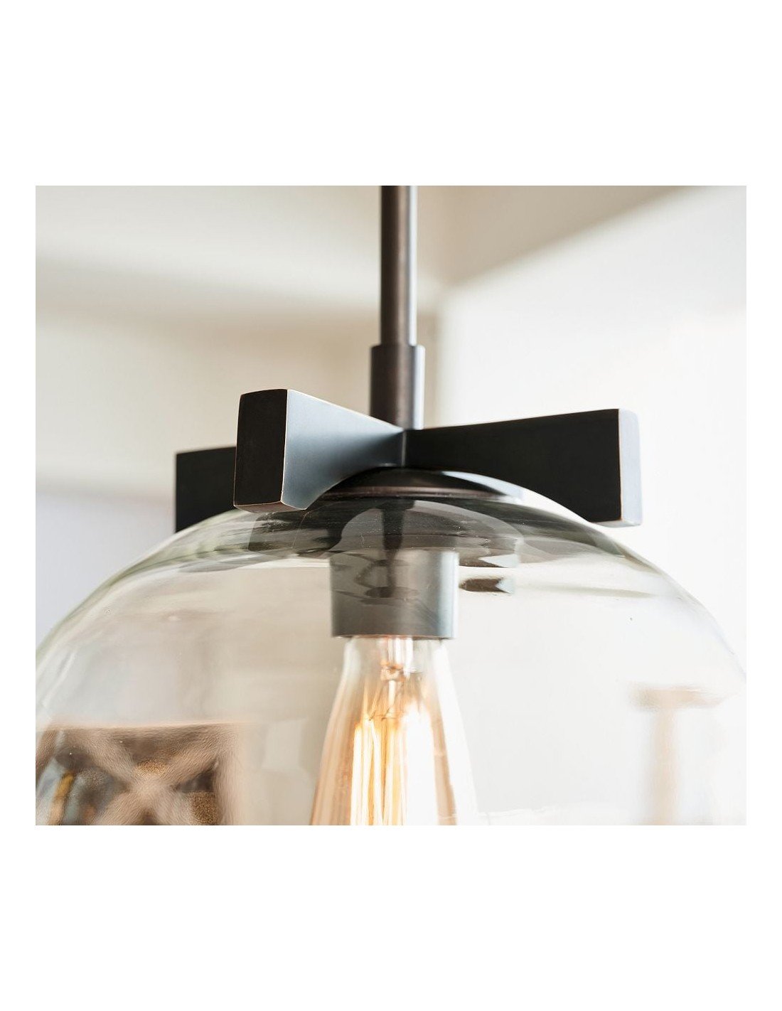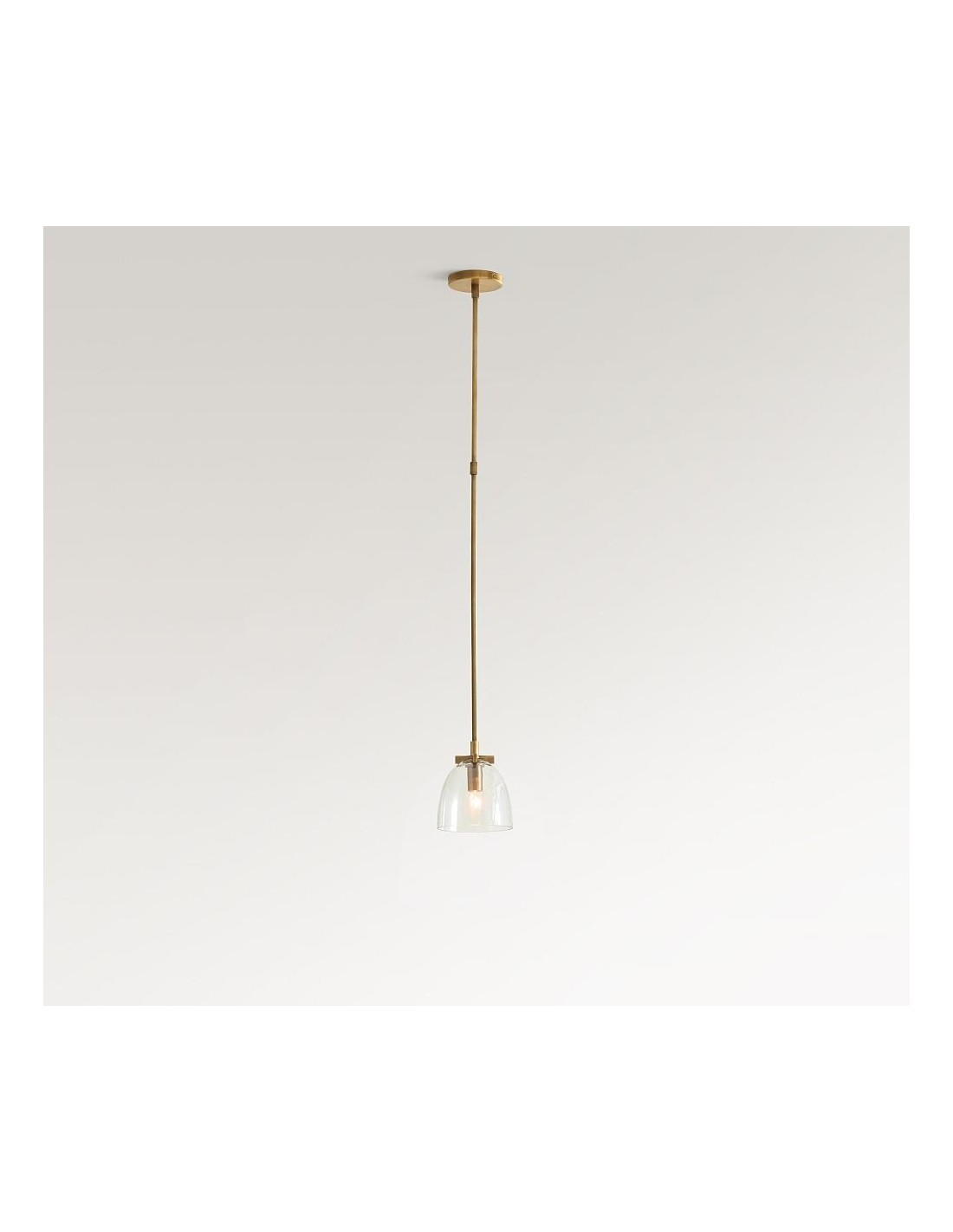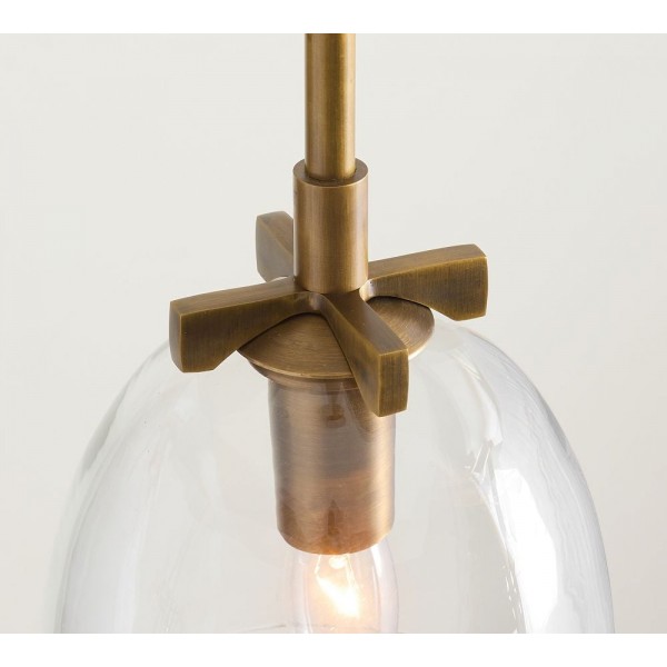 Fabriquée en laiton massif, cette suspension en métal offre une finition laiton vieilli ou bronze, associée à un abat-jour en verre soufflé transparent. Compatible avec un variateur d'intensité et certifiée UL, elle est idéale pour les salles de bains, les cuisines ou les terrasses couvertes.