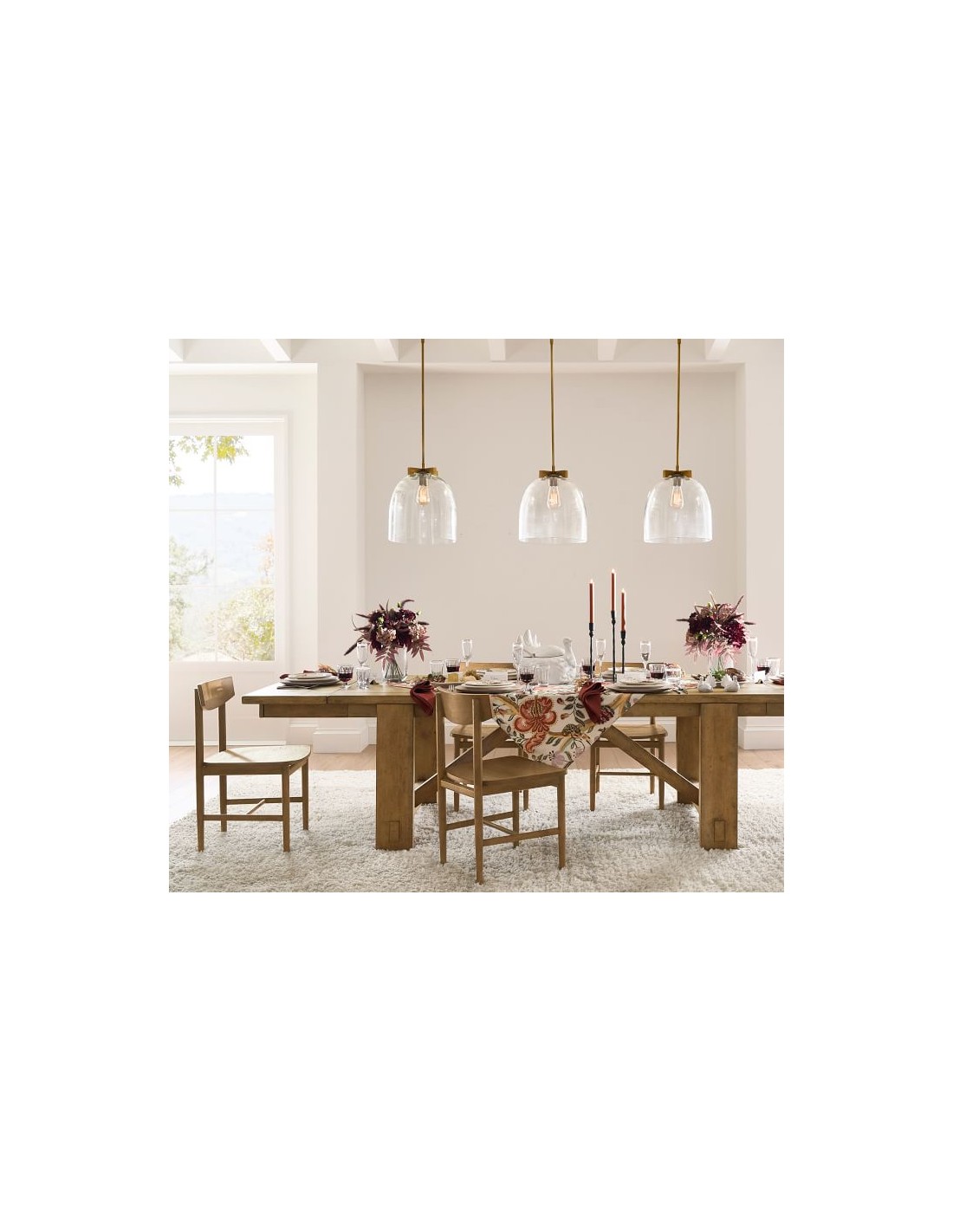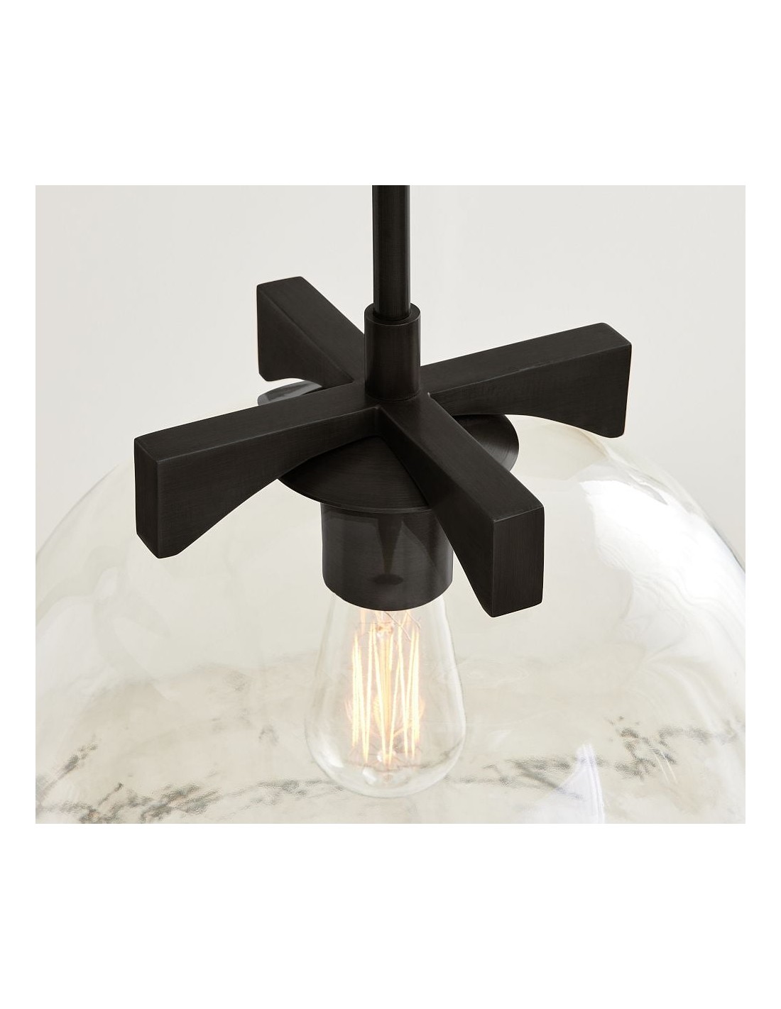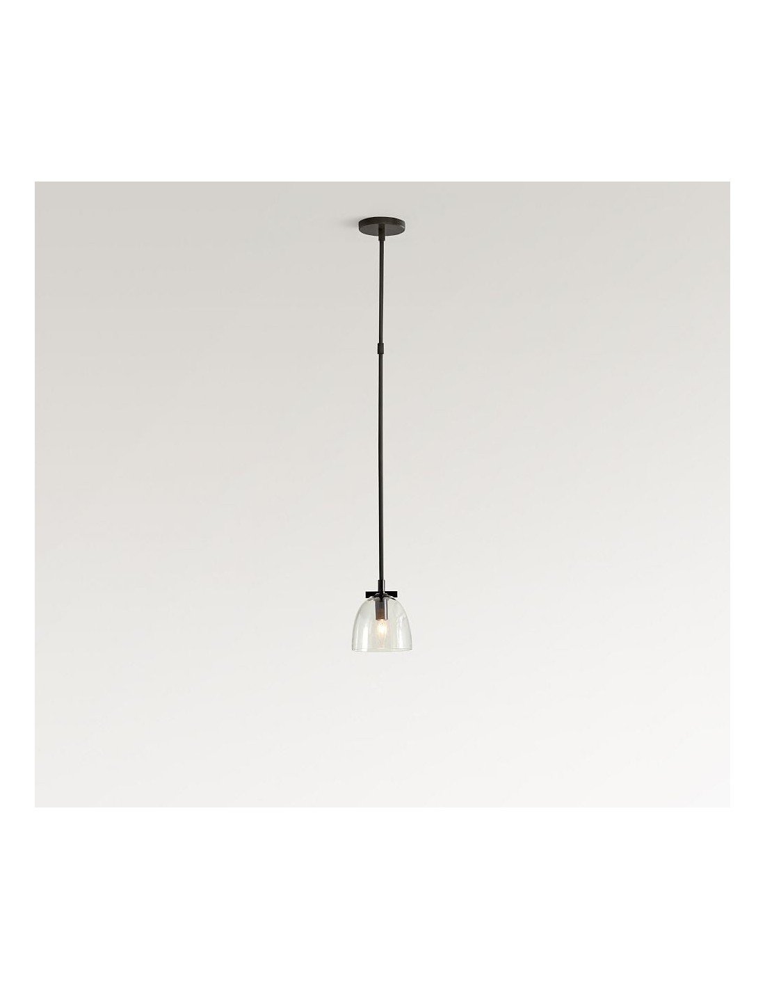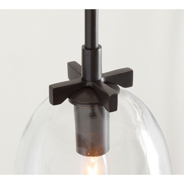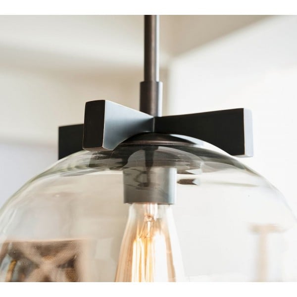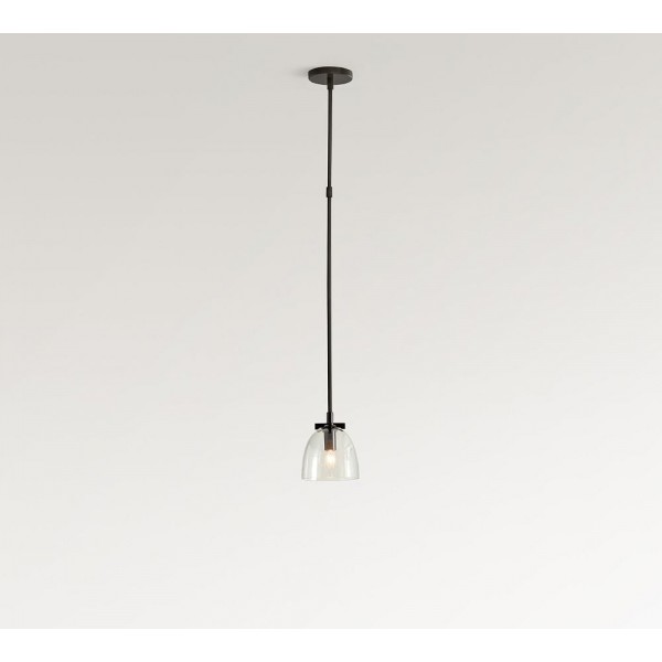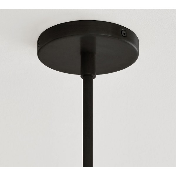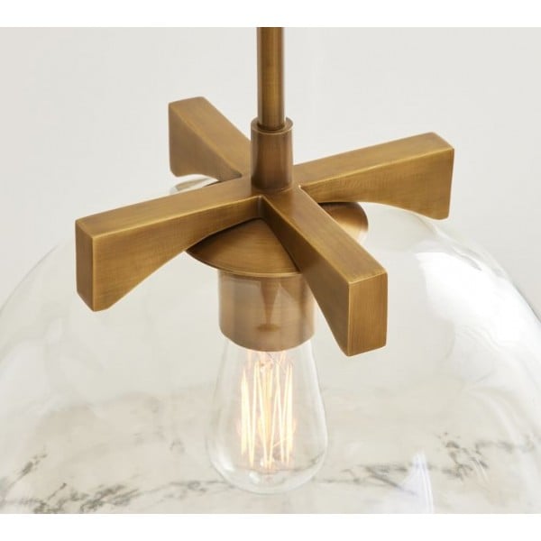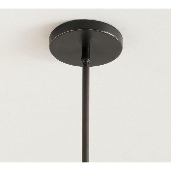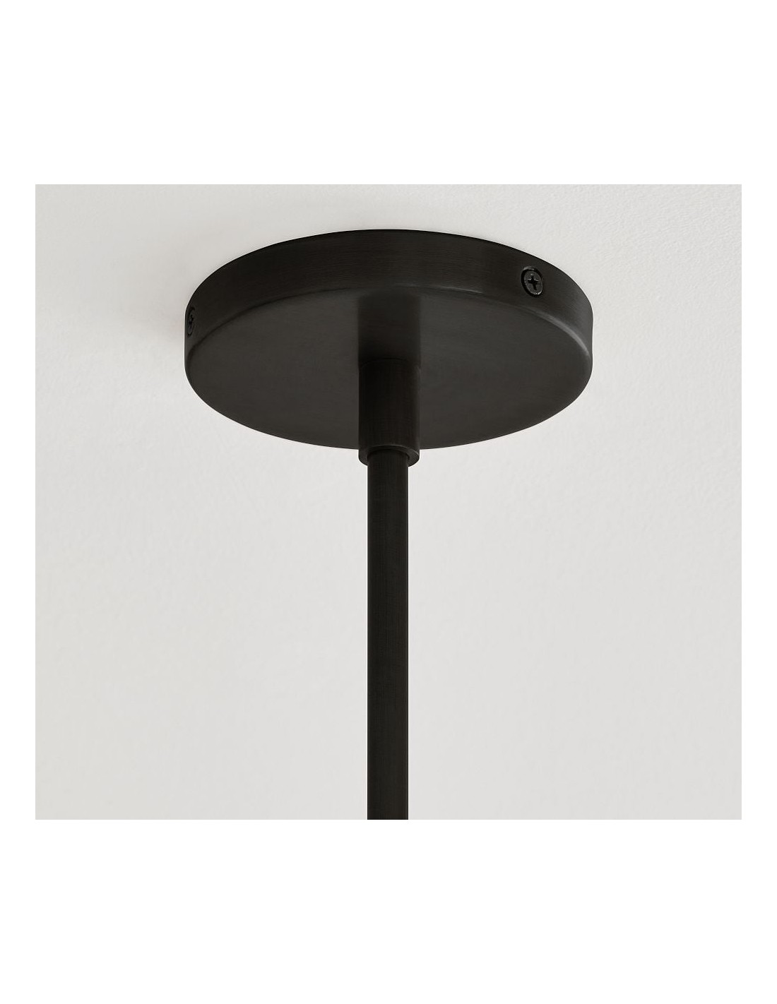 Fabriquée en laiton massif, cette suspension en métal offre une finition laiton vieilli ou bronze, associée à un abat-jour en verre soufflé transparent. Compatible avec un variateur d'intensité et certifiée UL, elle est idéale pour les salles de bains, les cuisines ou les terrasses couvertes.
