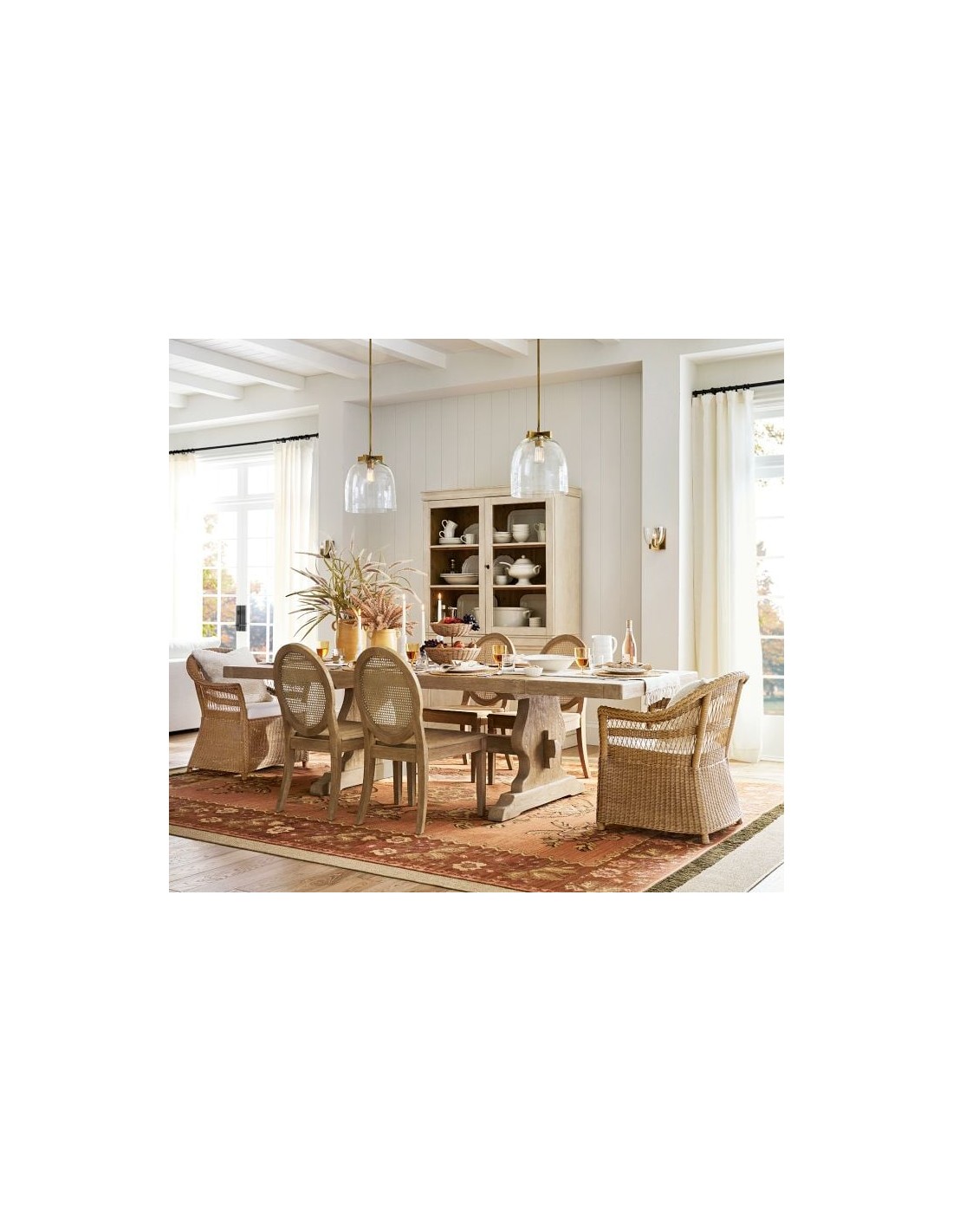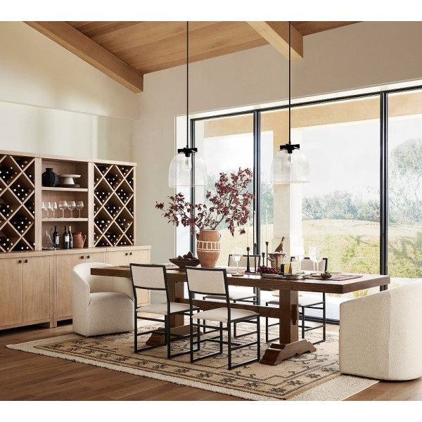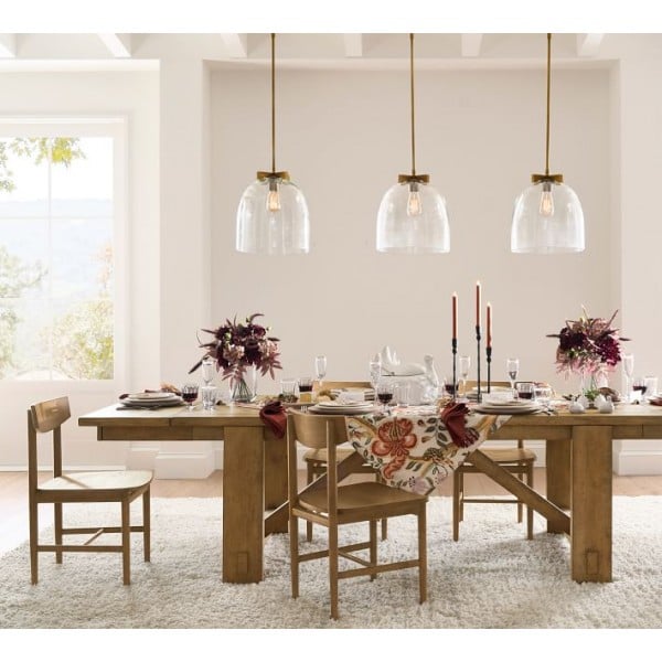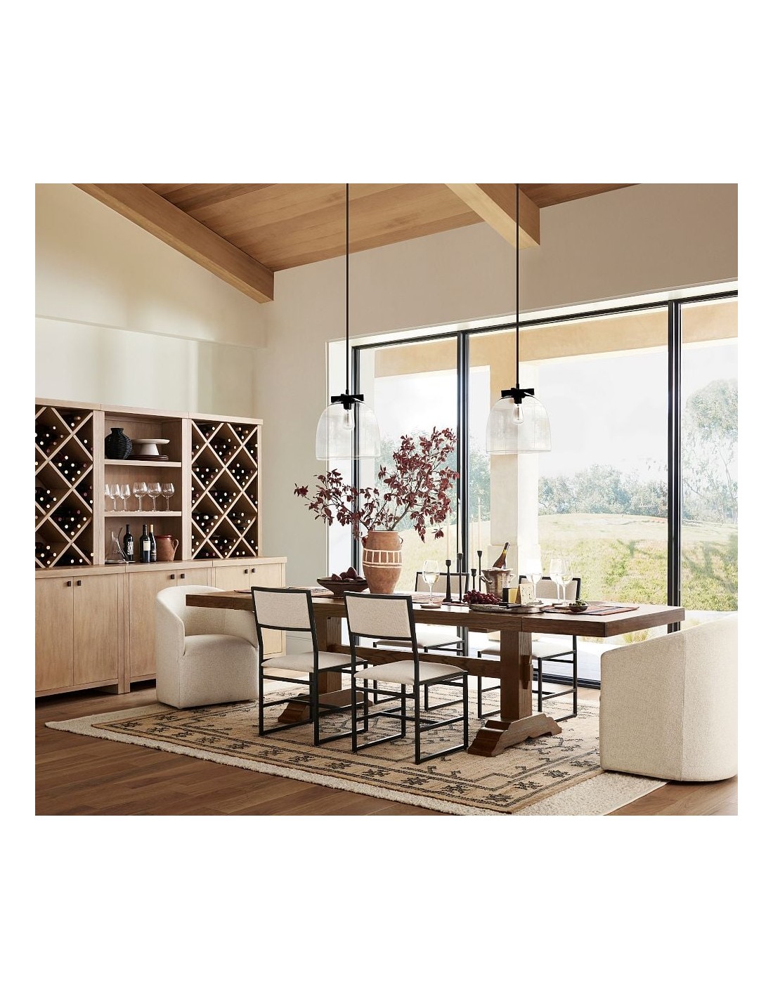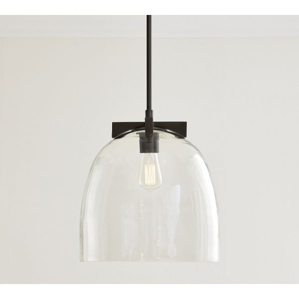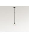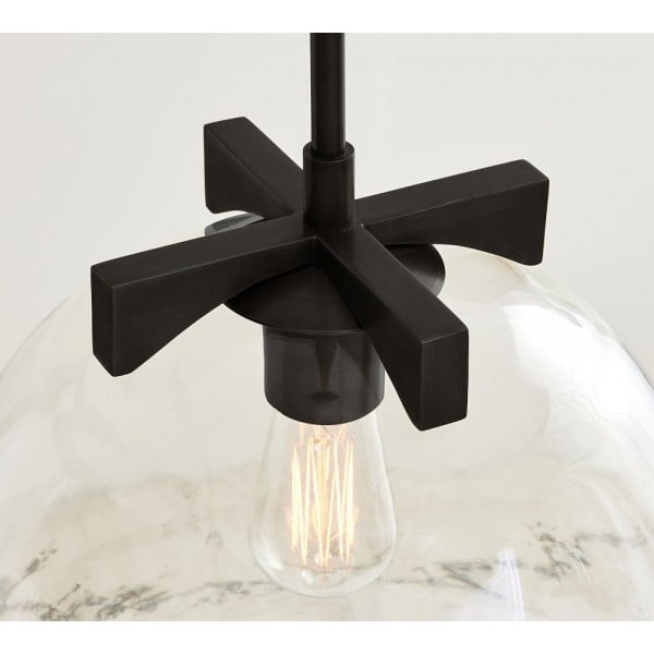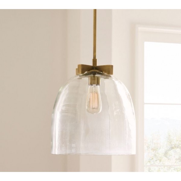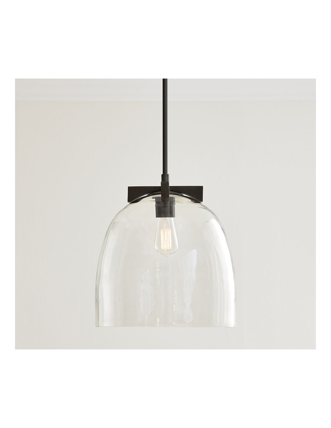Fabriquée en laiton massif, cette suspension en métal offre une finition laiton vieilli ou bronze, associée à un abat-jour en verre soufflé transparent. Compatible avec un variateur d'intensité et certifiée UL, elle est idéale pour les salles de bains, les cuisines ou les terrasses couvertes.