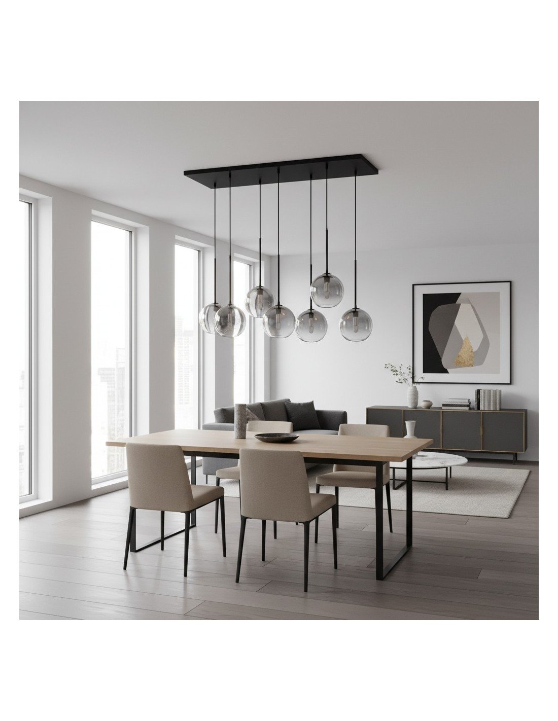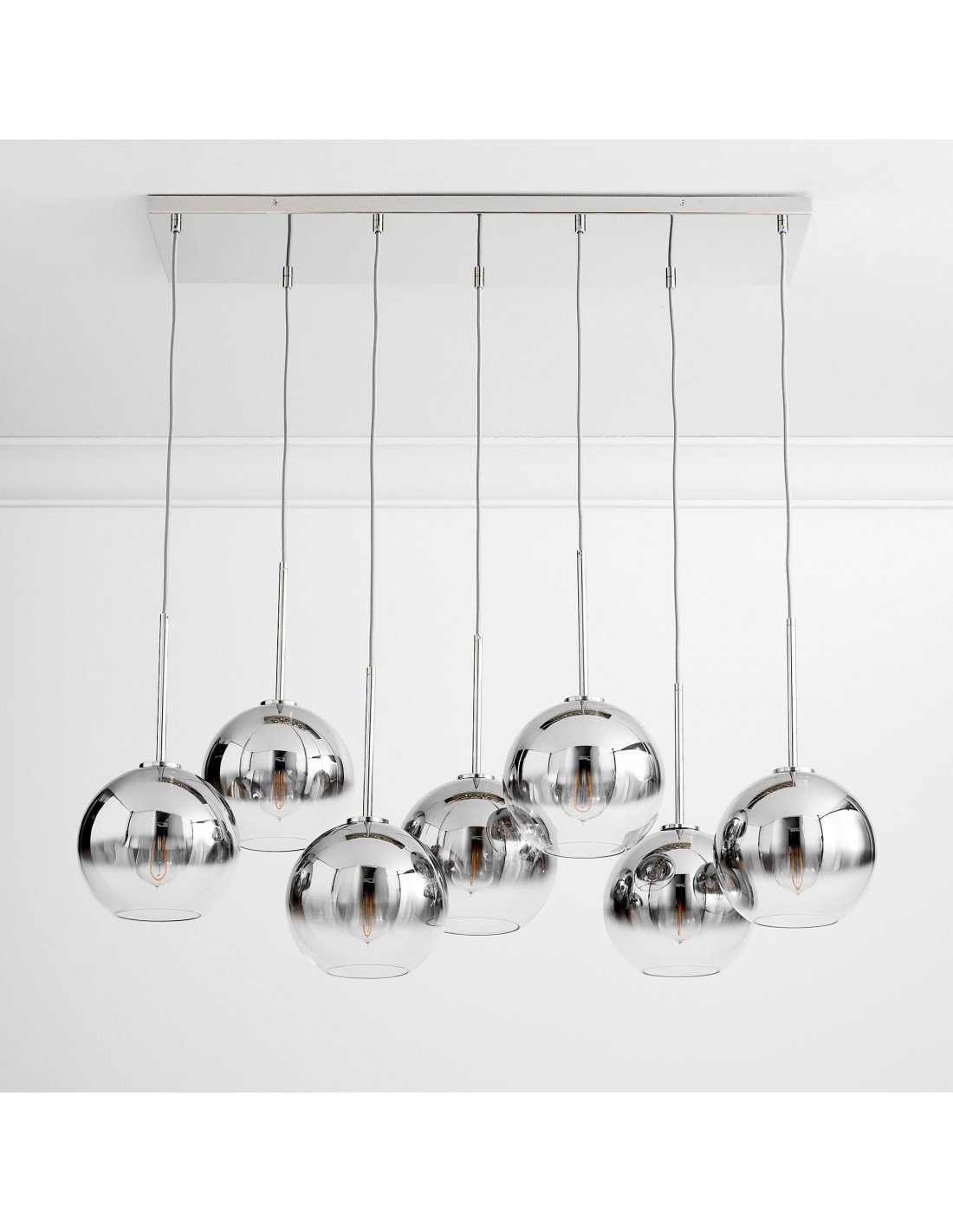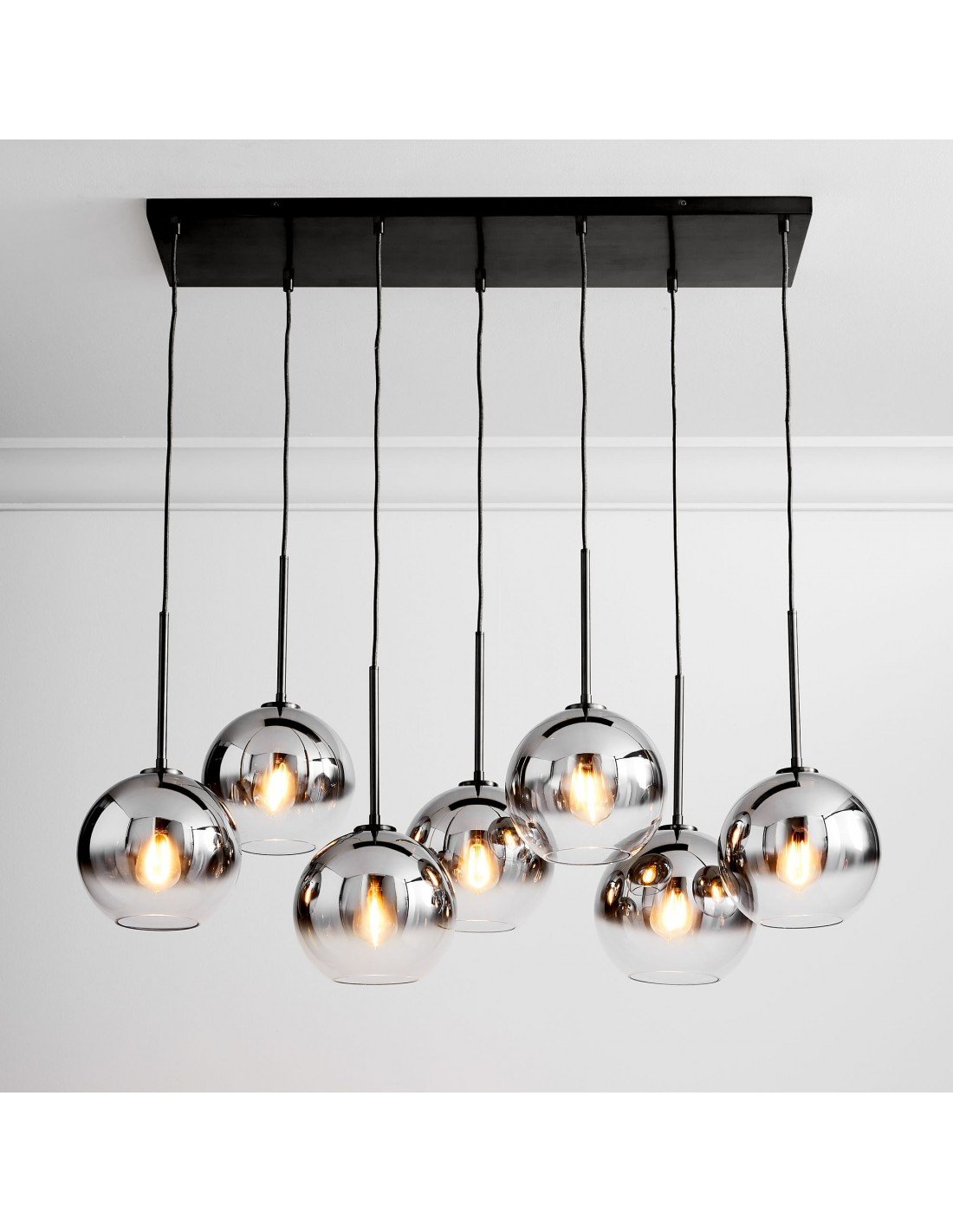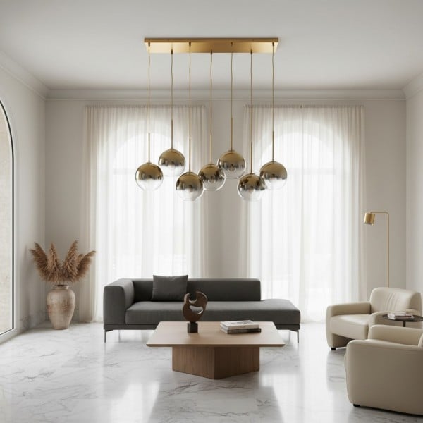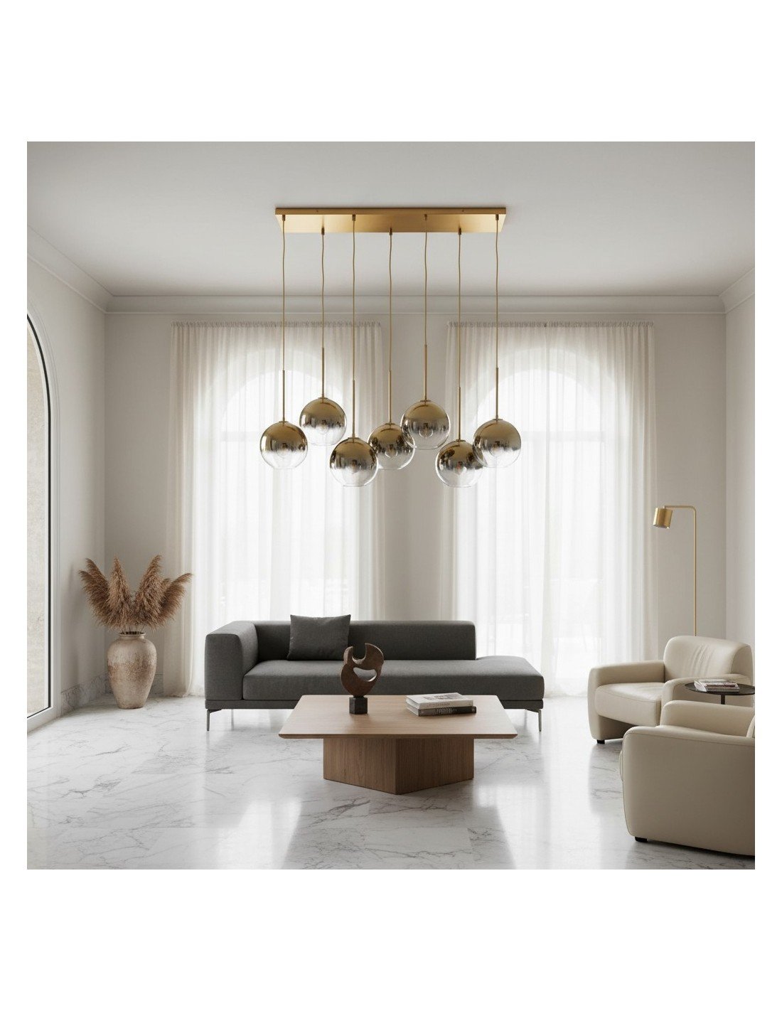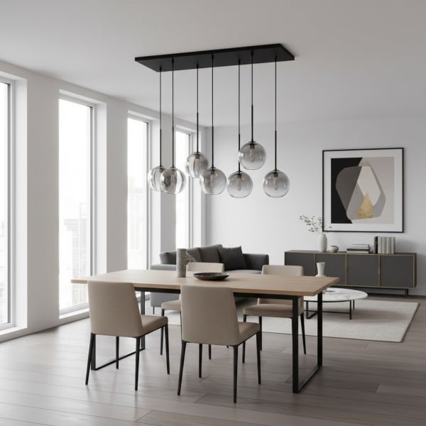 Ce lustre sculptural à 7 lumières incarne l'élégance moderne, avec ses globes en verre et sa finition métallique élégante. Conçu pour s'harmoniser avec les intérieurs contemporains, il est le luminaire idéal pour apporter chaleur et sophistication à votre salle à manger ou à votre salon.