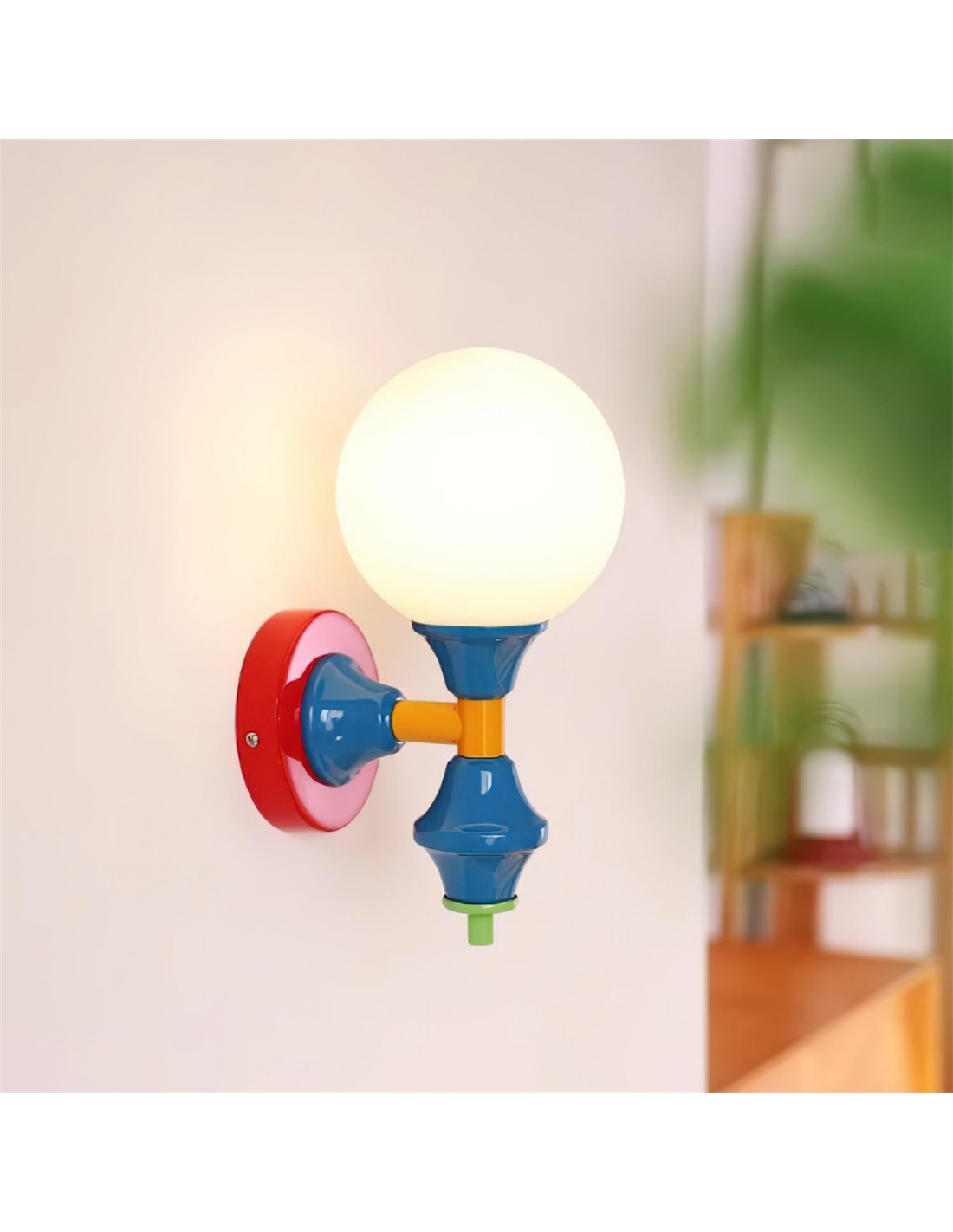 Présentant une explosion de couleurs, cette applique murale colorée de style français utilise des teintes vives de rouge, de bleu et de jaune pour injecter de l'énergie et du plaisir dans n'importe quel espace. Son design unique mélange des éléments modernes et vintage, créant un point focal visuel saisissant. L'abat-jour rond blanc diffuse la lumière en douceur, rendant le design à la fois artistique et pratique.