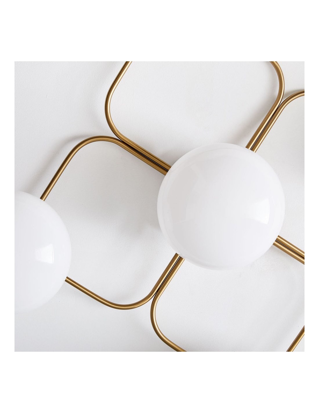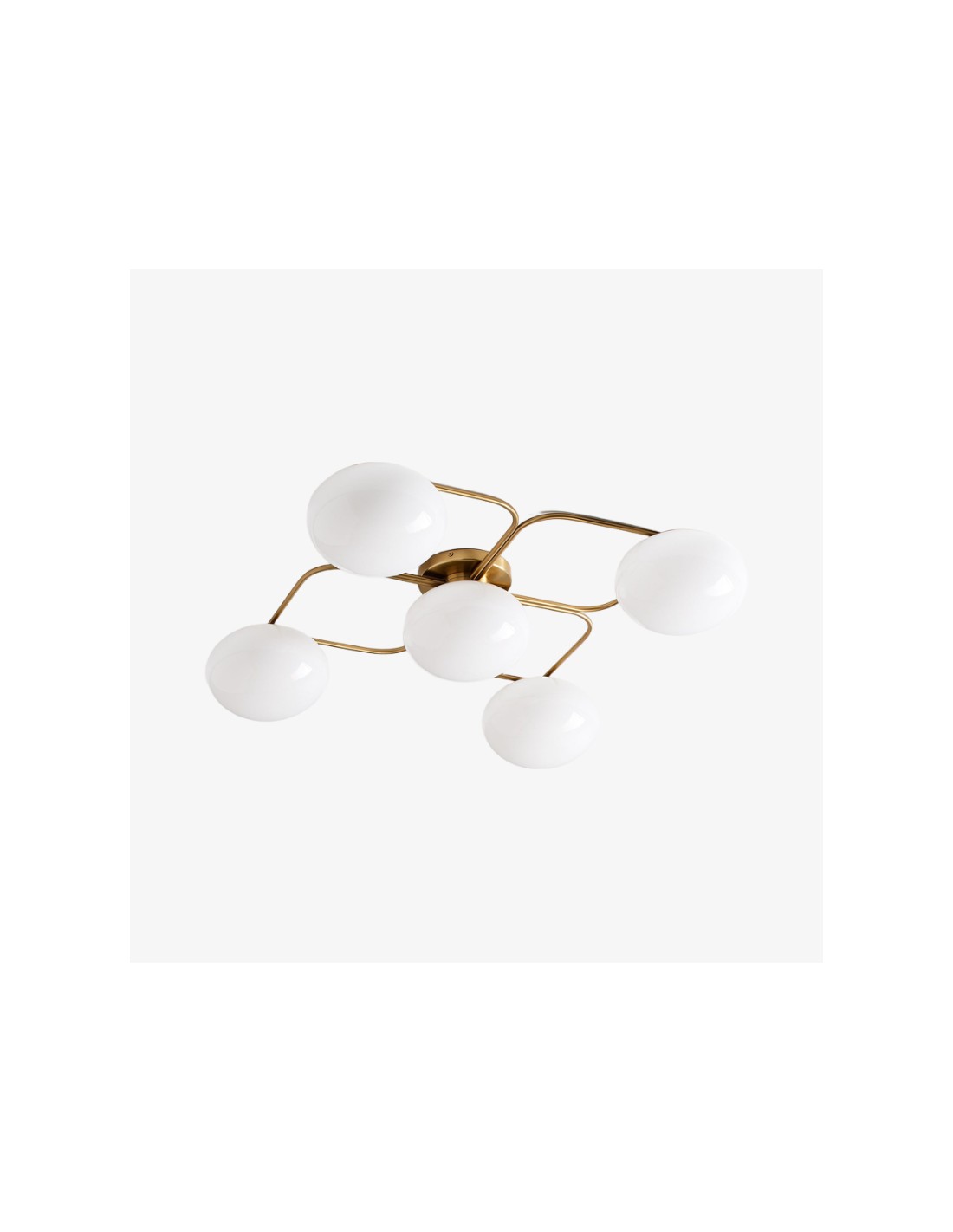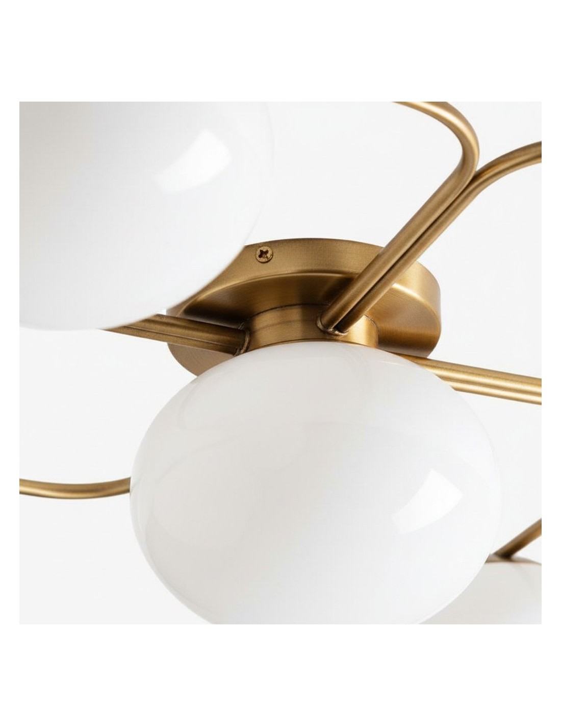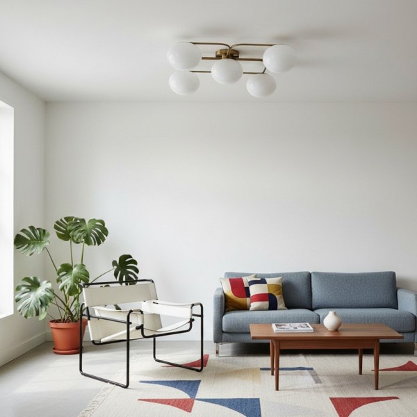 Ce plafonnier moderne est doté de cinq abat-jour en verre dépoli entourant une structure métallique compacte, offrant un éclairage équilibré et diffus. Ses lignes épurées s'intègrent parfaitement aux intérieurs contemporains, et sa résistance à l'humidité le rend idéal pour les salles de bains, les entrées, les couloirs ou les espaces extérieurs couverts.