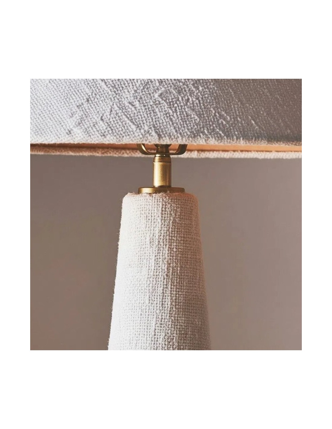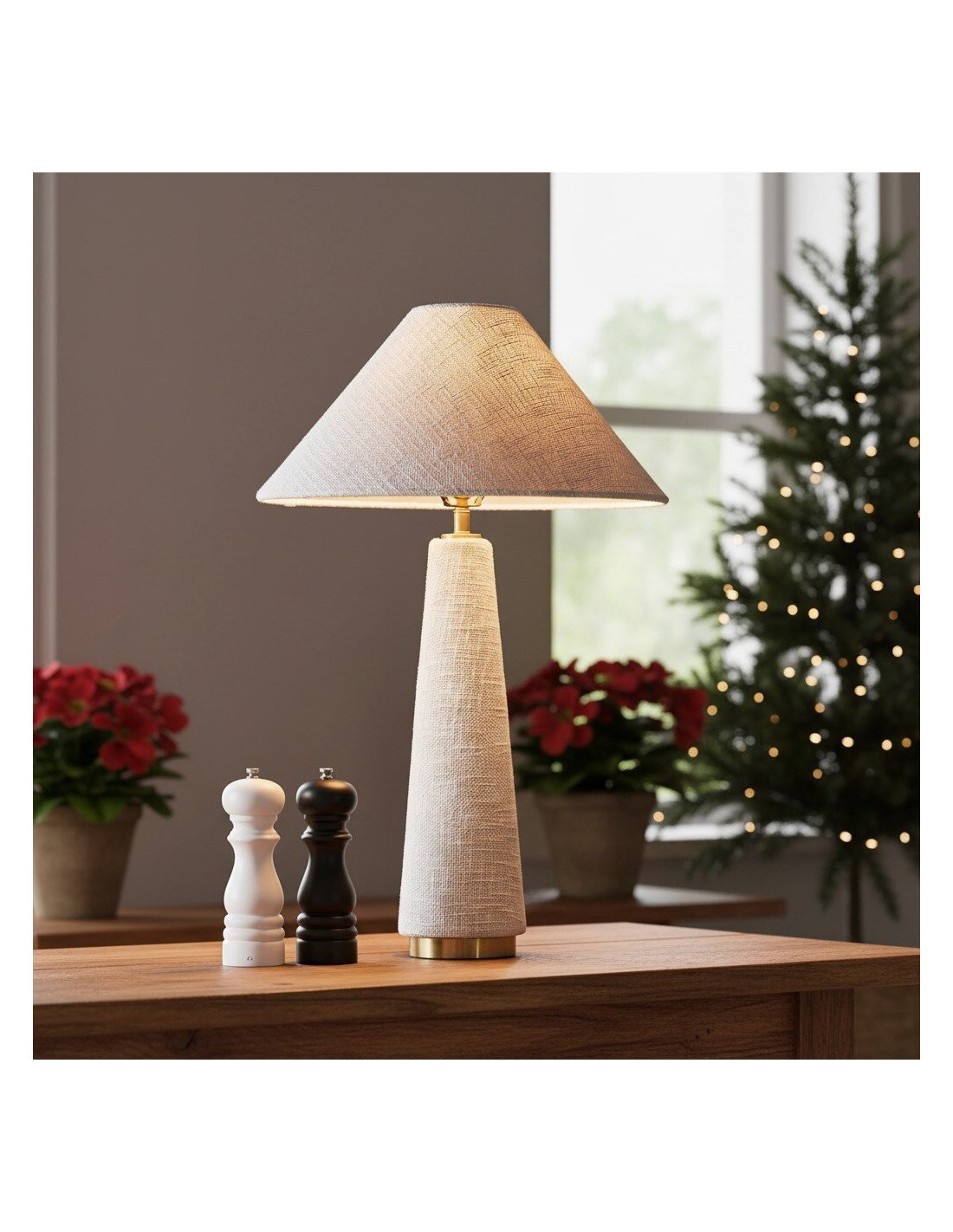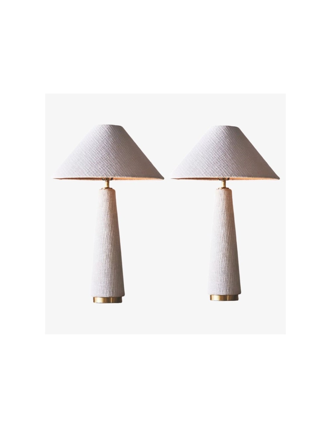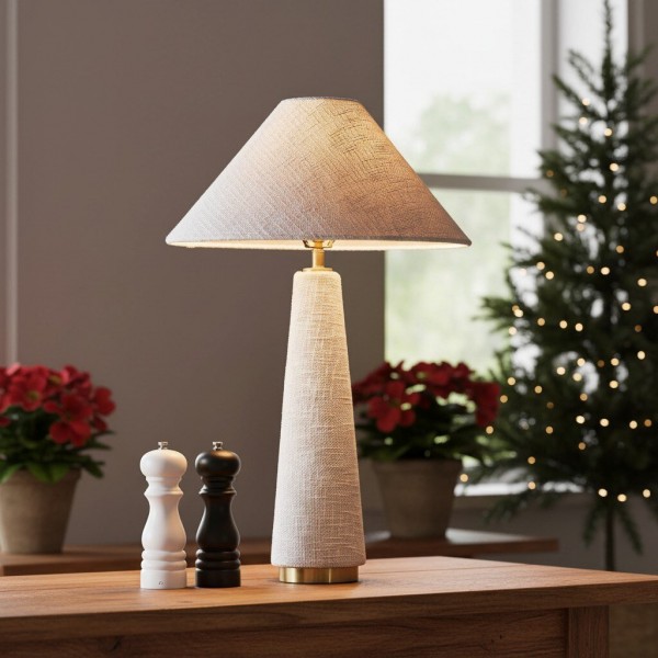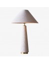 La lampe de table à abat-jour conique, à la silhouette moderne, est fabriquée en bois exotique, révélant des variations artisanales uniques et de subtils détails en laiton brossé. Coiffée d'un abat-jour en coton texturé, elle diffuse une lumière chaude et accueillante. Sa hauteur imposante la rend idéale pour un buffet, une table ou une entrée.