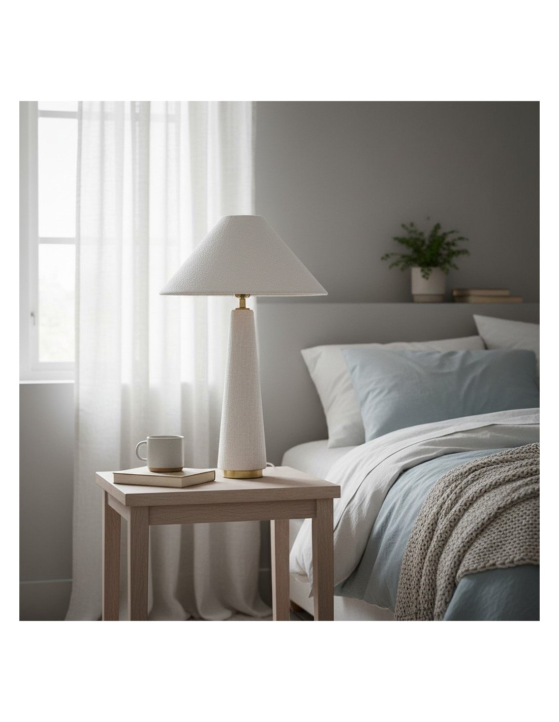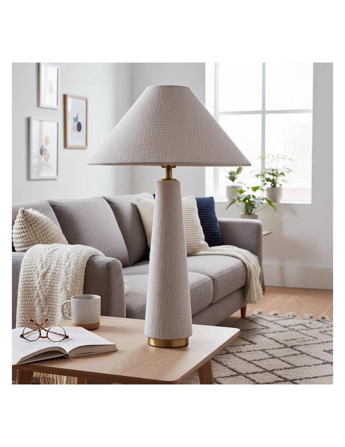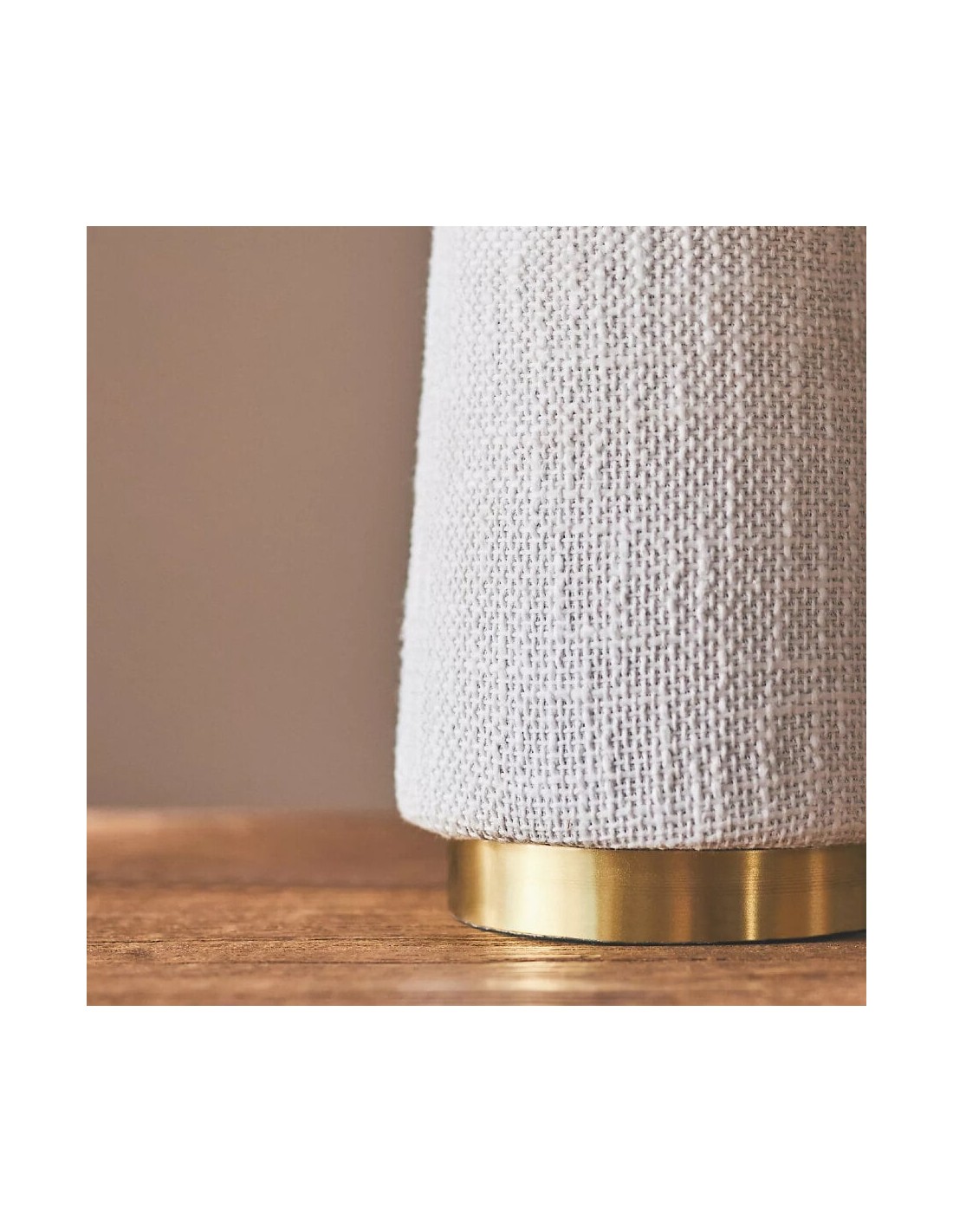 La lampe de table à abat-jour conique, à la silhouette moderne, est fabriquée en bois exotique, révélant des variations artisanales uniques et de subtils détails en laiton brossé. Coiffée d'un abat-jour en coton texturé, elle diffuse une lumière chaude et accueillante. Sa hauteur imposante la rend idéale pour un buffet, une table ou une entrée.