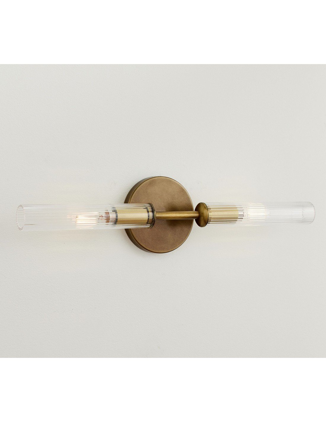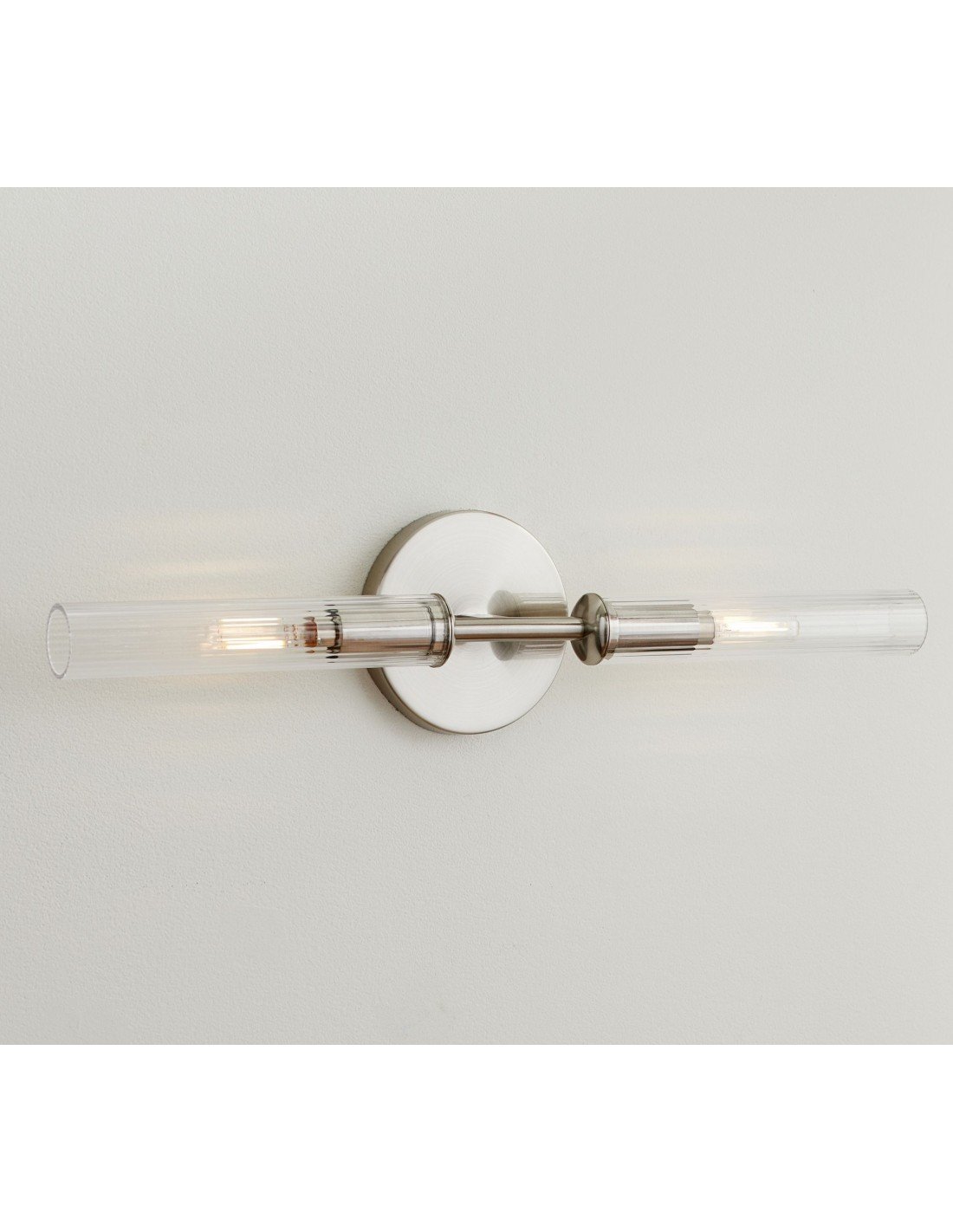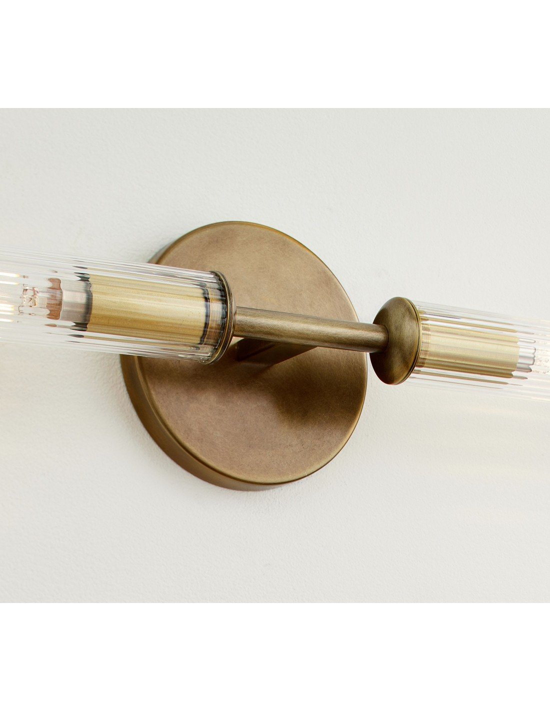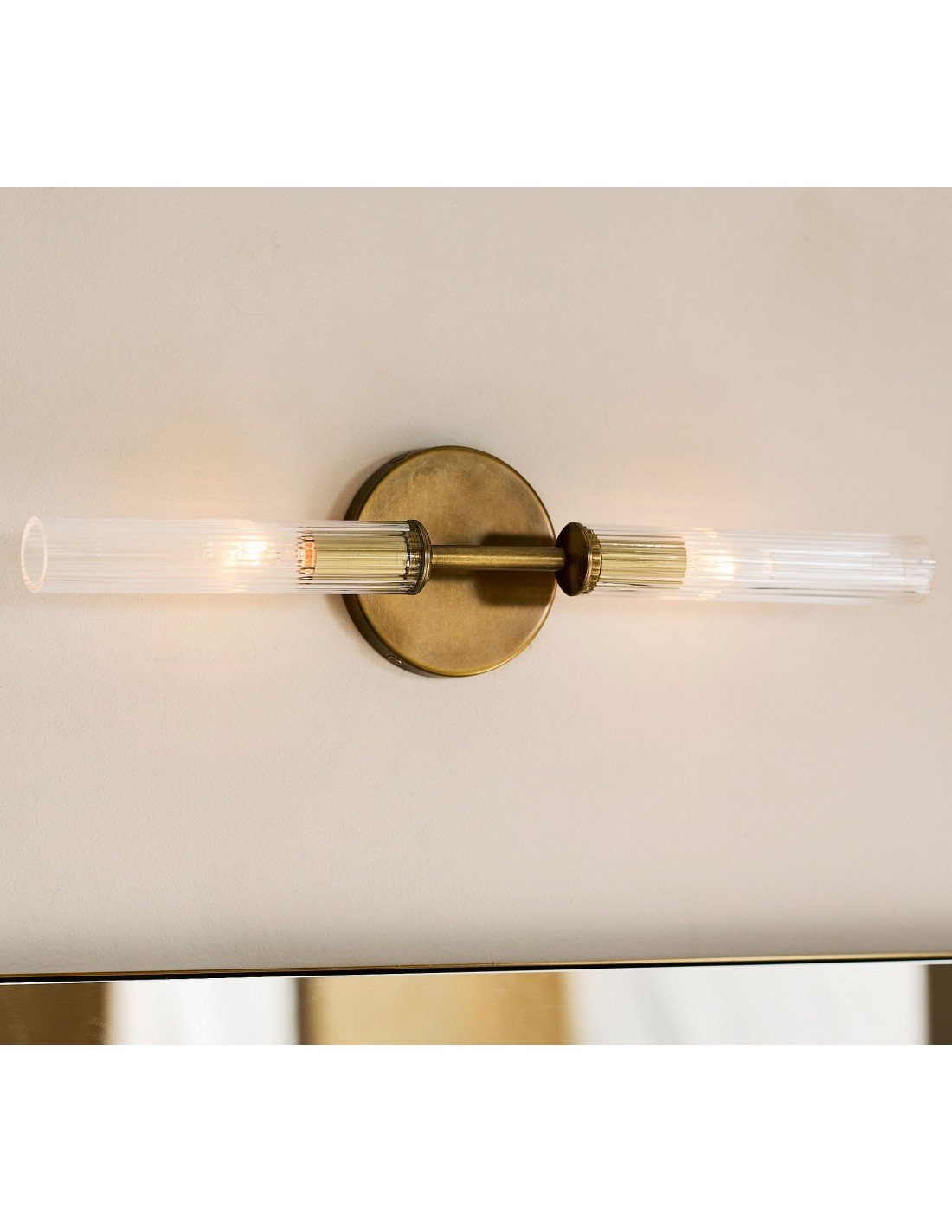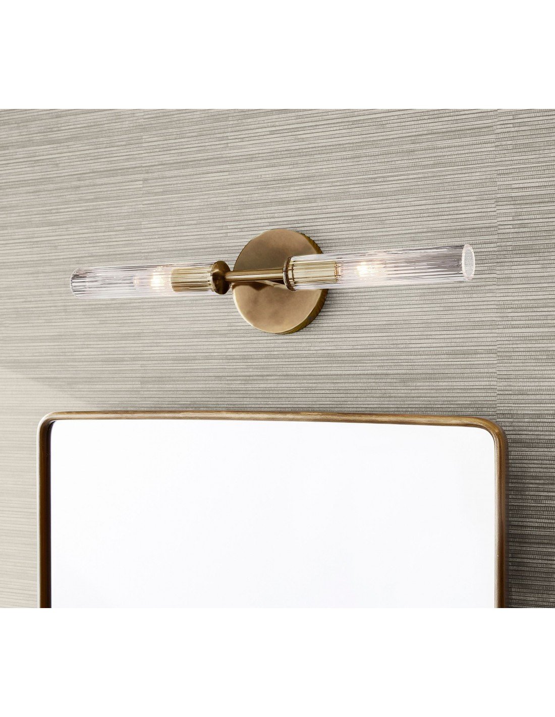Découvrez l'applique Bravira en verre strié, disponible en tubes simples ou doubles. Fabriquées en fer et disponibles en laiton vieilli, nickel poli, nickel satiné et bronze antique, ces lampes sont dotées d'abat-jour en verre transparent soufflé bouche, parfaits pour les chambres, les couloirs ou les espaces de vie modernes.