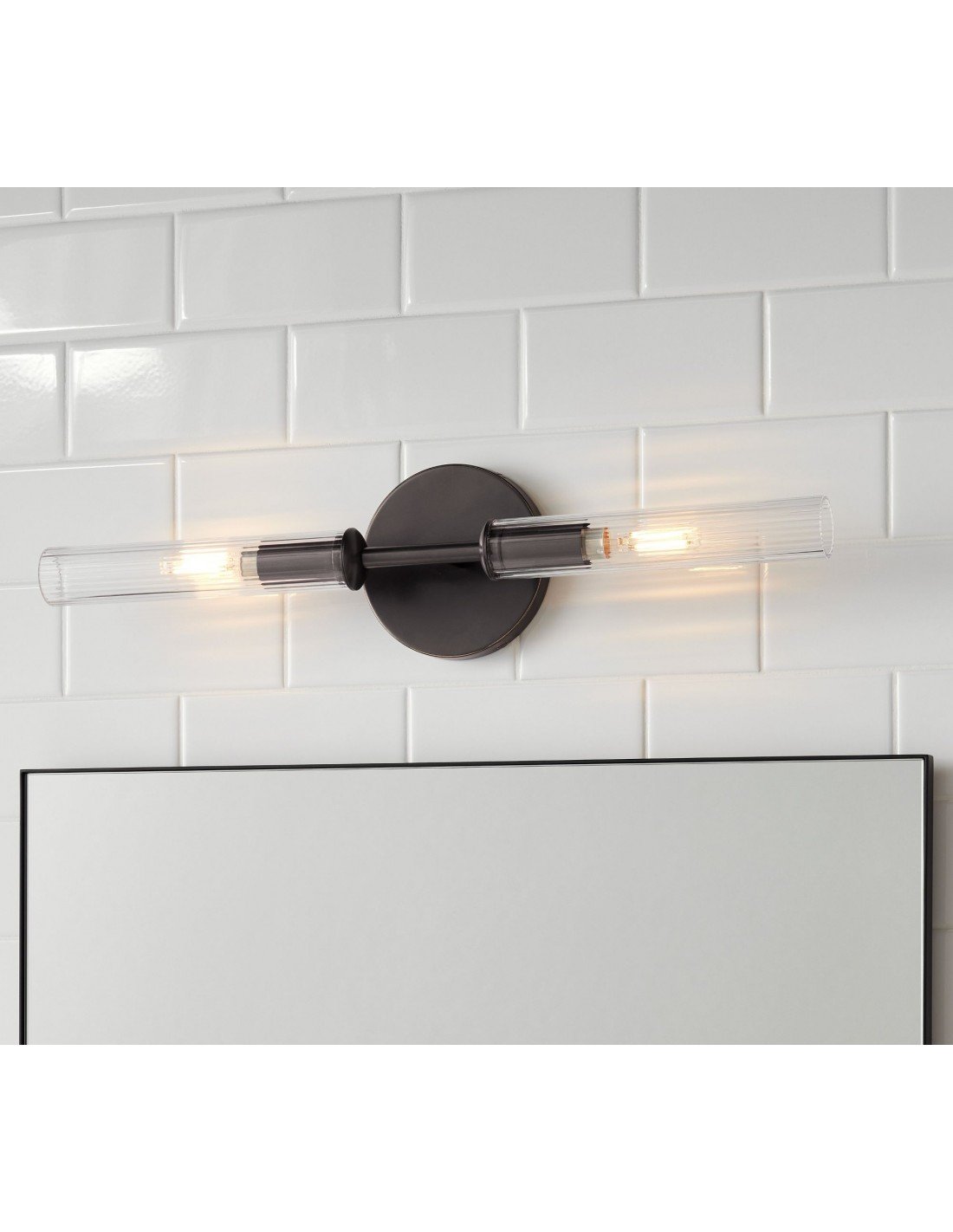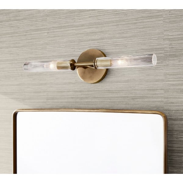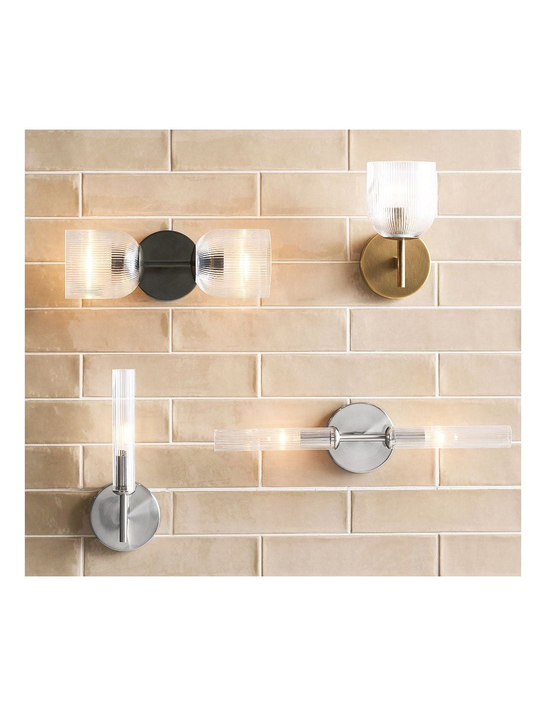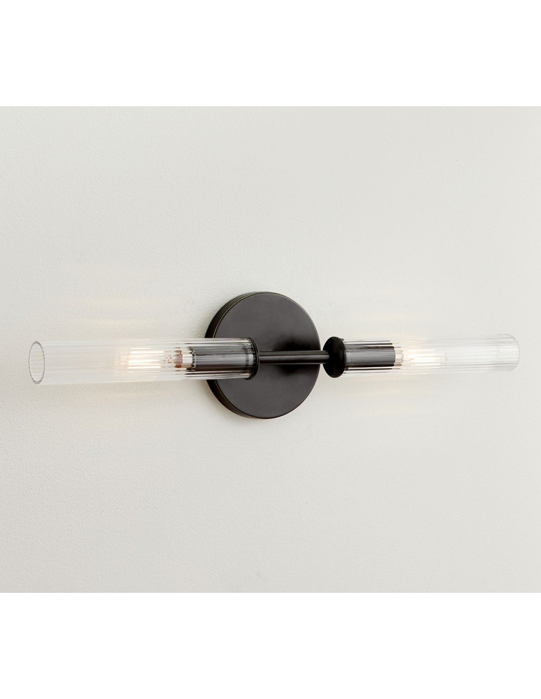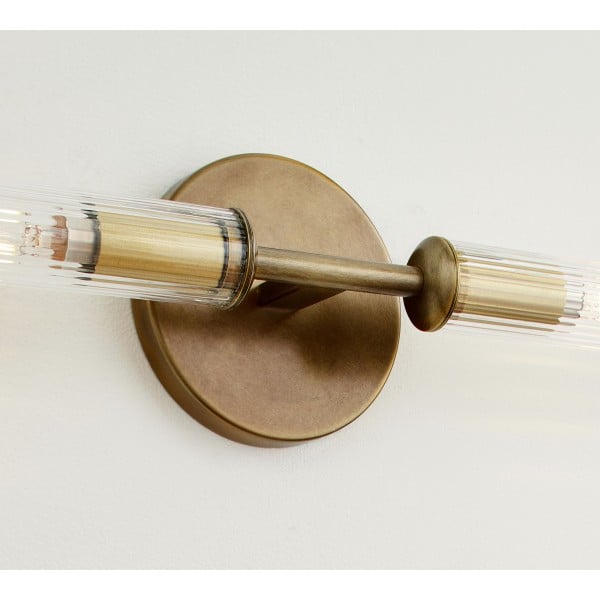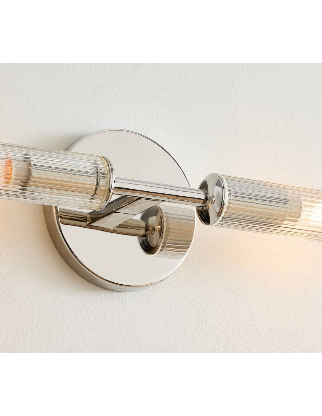 Découvrez l'applique Bravira en verre strié, disponible en tubes simples ou doubles. Fabriquées en fer et disponibles en laiton vieilli, nickel poli, nickel satiné et bronze antique, ces lampes sont dotées d'abat-jour en verre transparent soufflé bouche, parfaits pour les chambres, les couloirs ou les espaces de vie modernes.